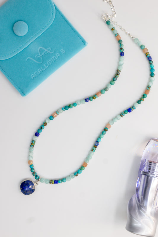 Turquoise Tranquility Necklace with Lapis Square Pendant | Hubei Turquoise (A) Russian Green Angelite Peach Moonstone (A)