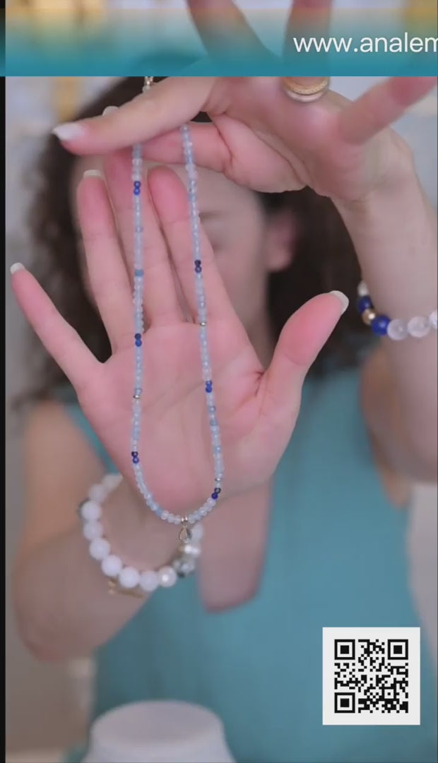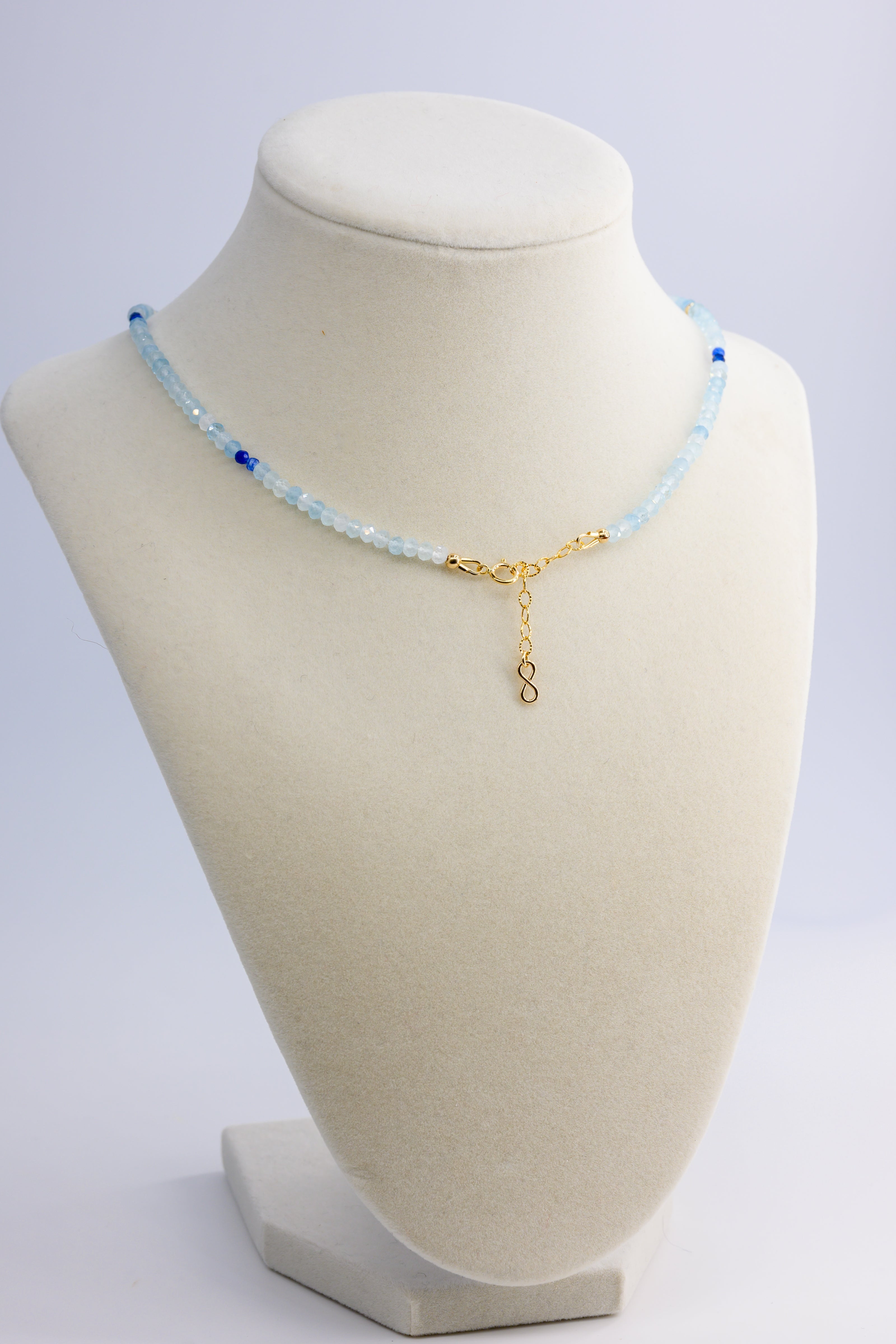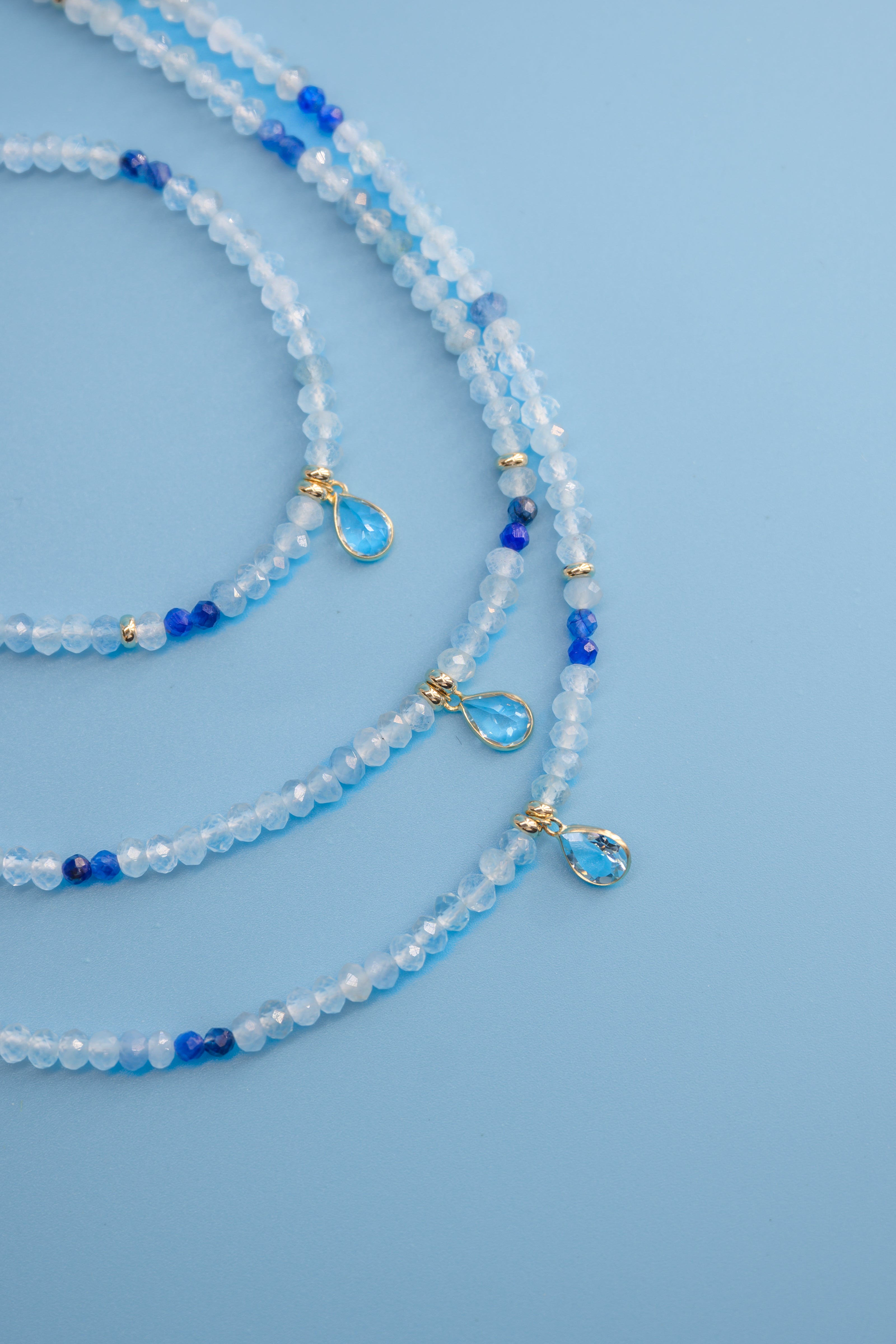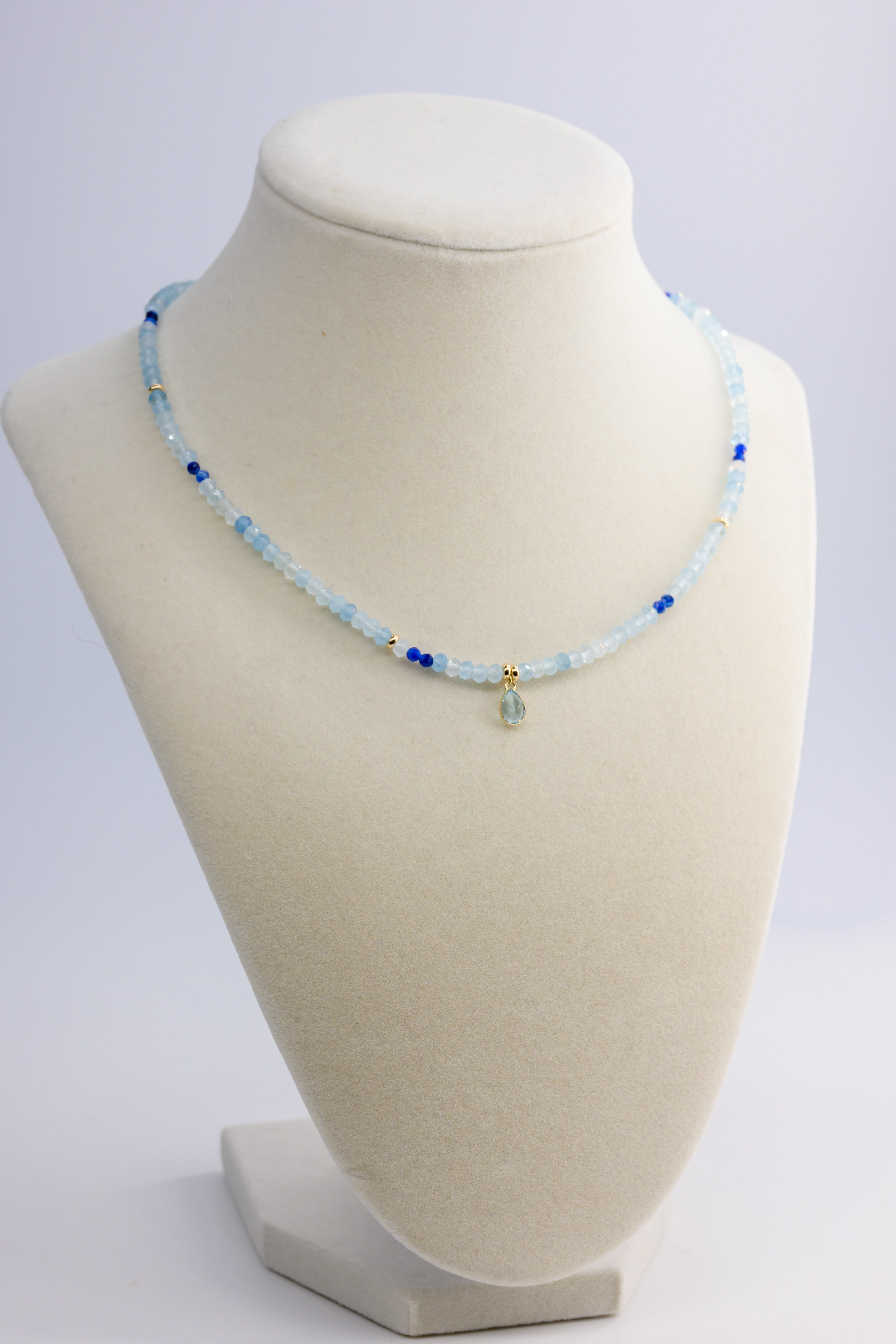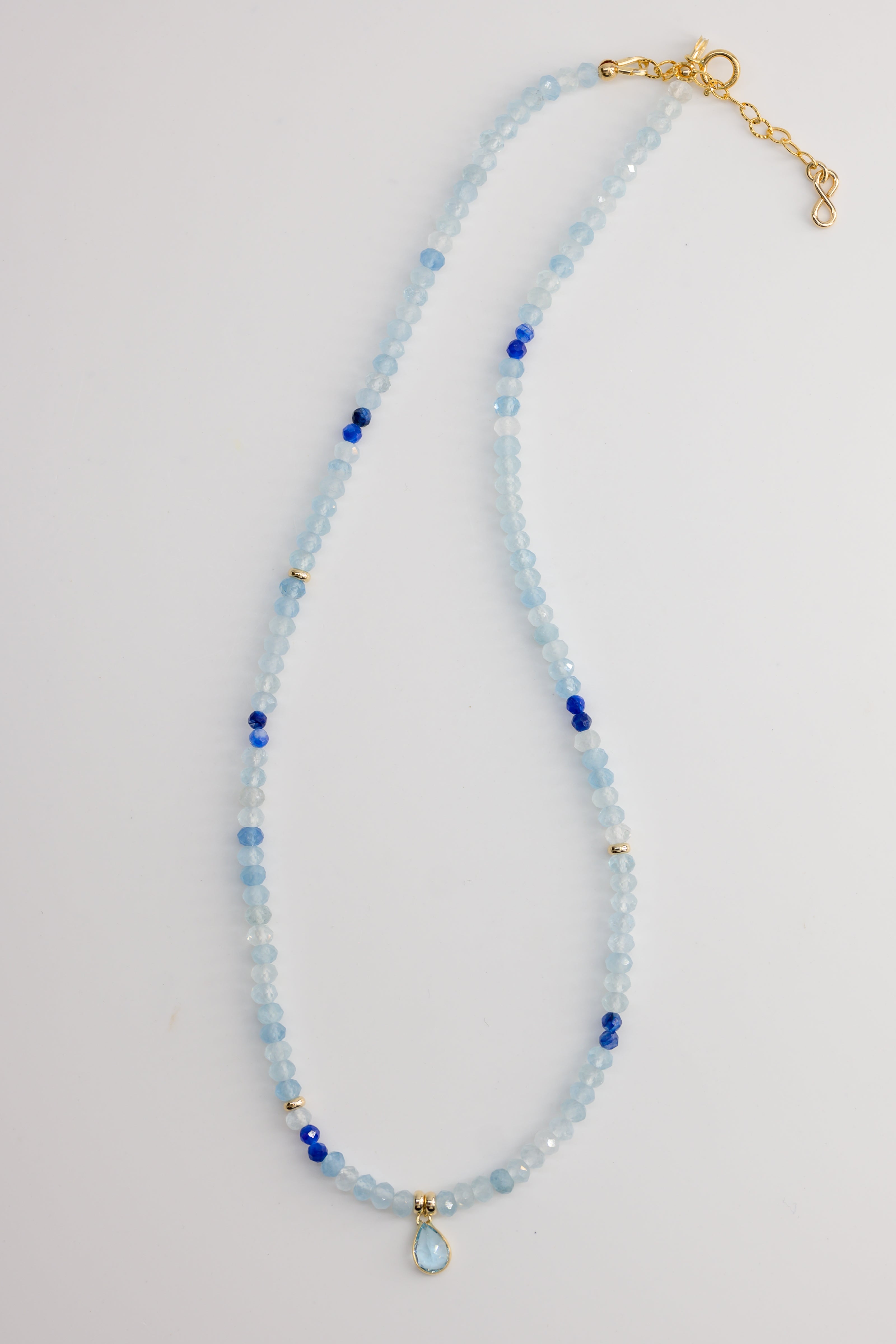 This ethereal necklace features soothing aquamarine and deep kyanite beads, evoking the peaceful expanse of the sky meeting the ocean. The radiant blue topaz pendant adds a touch of brilliance, symbolizing the clarity and dreams that float upon the horizon. A perfect piece for those who wish to carry the tranquility and wonder of the aqua sky.