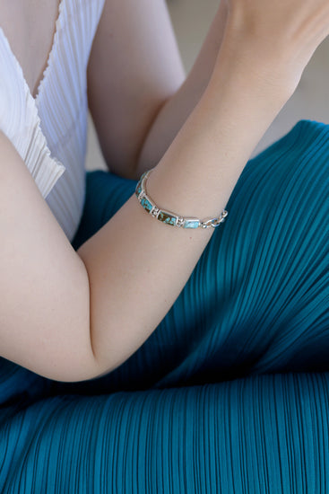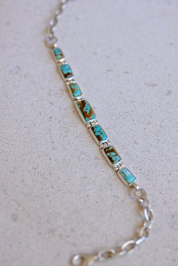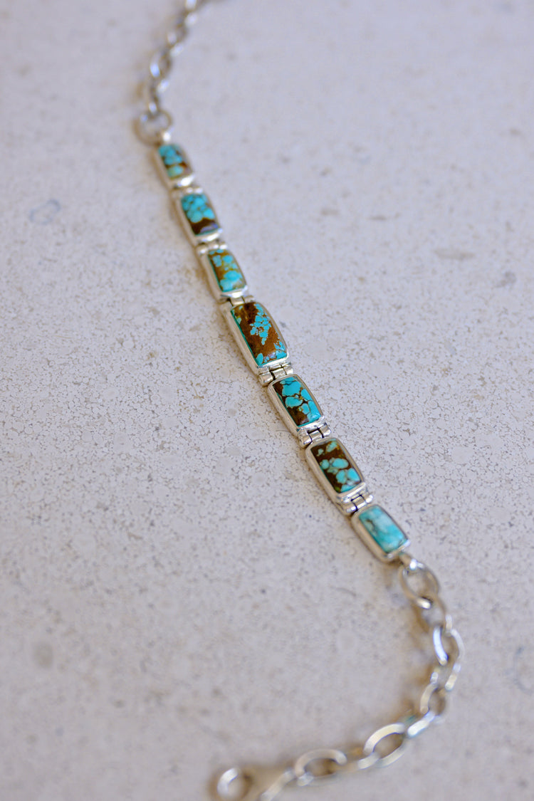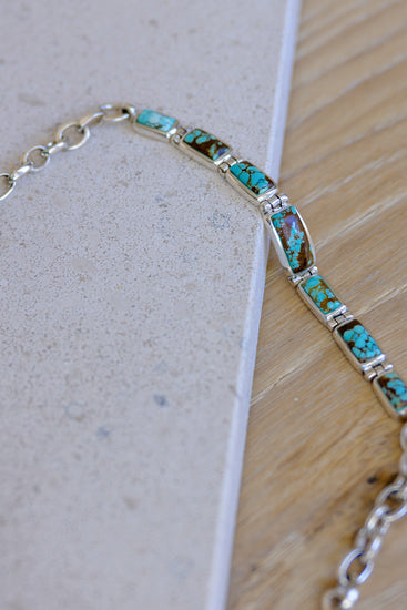 Inspired by the untamed landscapes of Nevada, the Boulder Turquoise Canyon Bracelet showcases the raw beauty of Boulder Turquoise. This striking gemstone, with its earthy brown matrix and vivid blue-green veins, mirrors the rugged canyon walls and serene desert skies. Handcrafted with precision, the bracelet features hand-drawn sterling silver accents, enhancing its natural elegance and durability. A tribute to the American Southwest, this piece embodies the harmony of land and sky, making it a timeless expression of nature’s artistry.