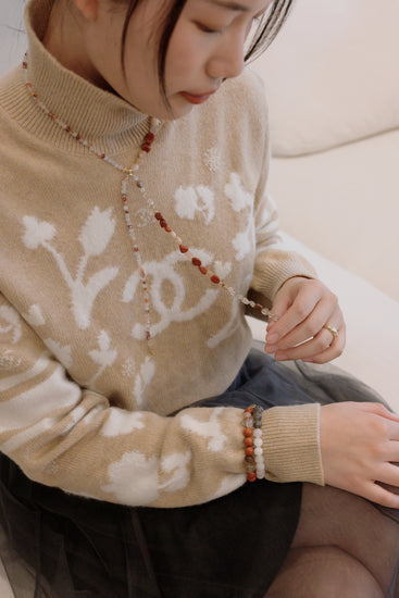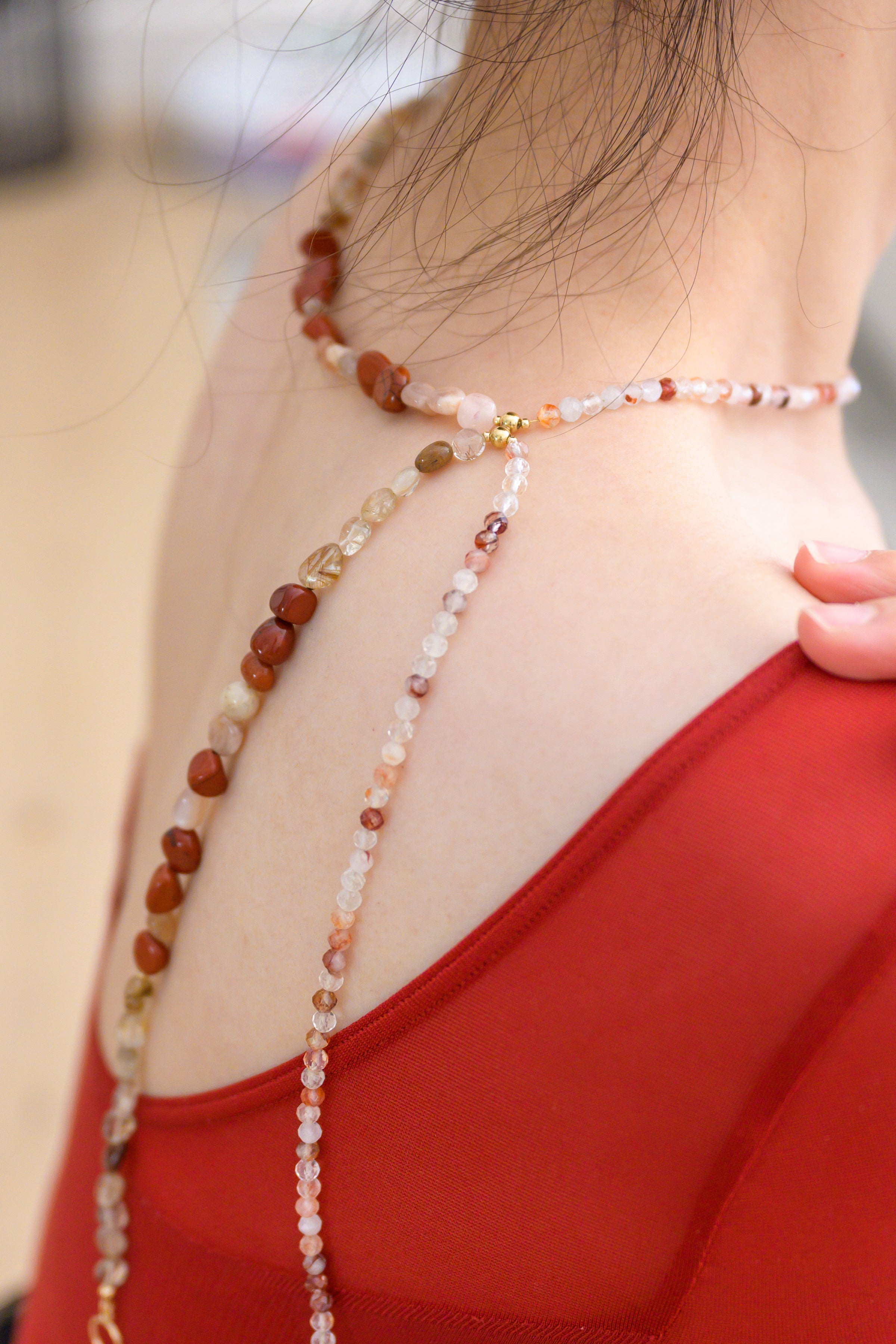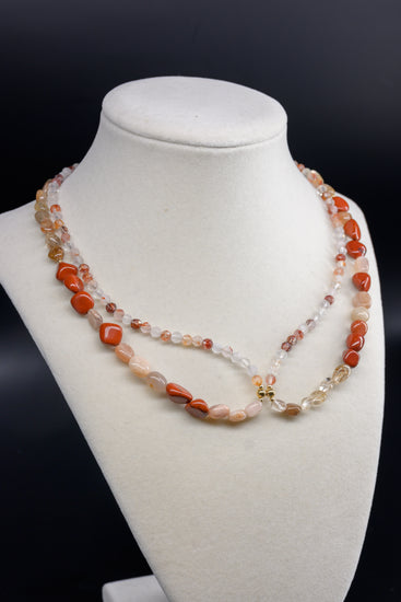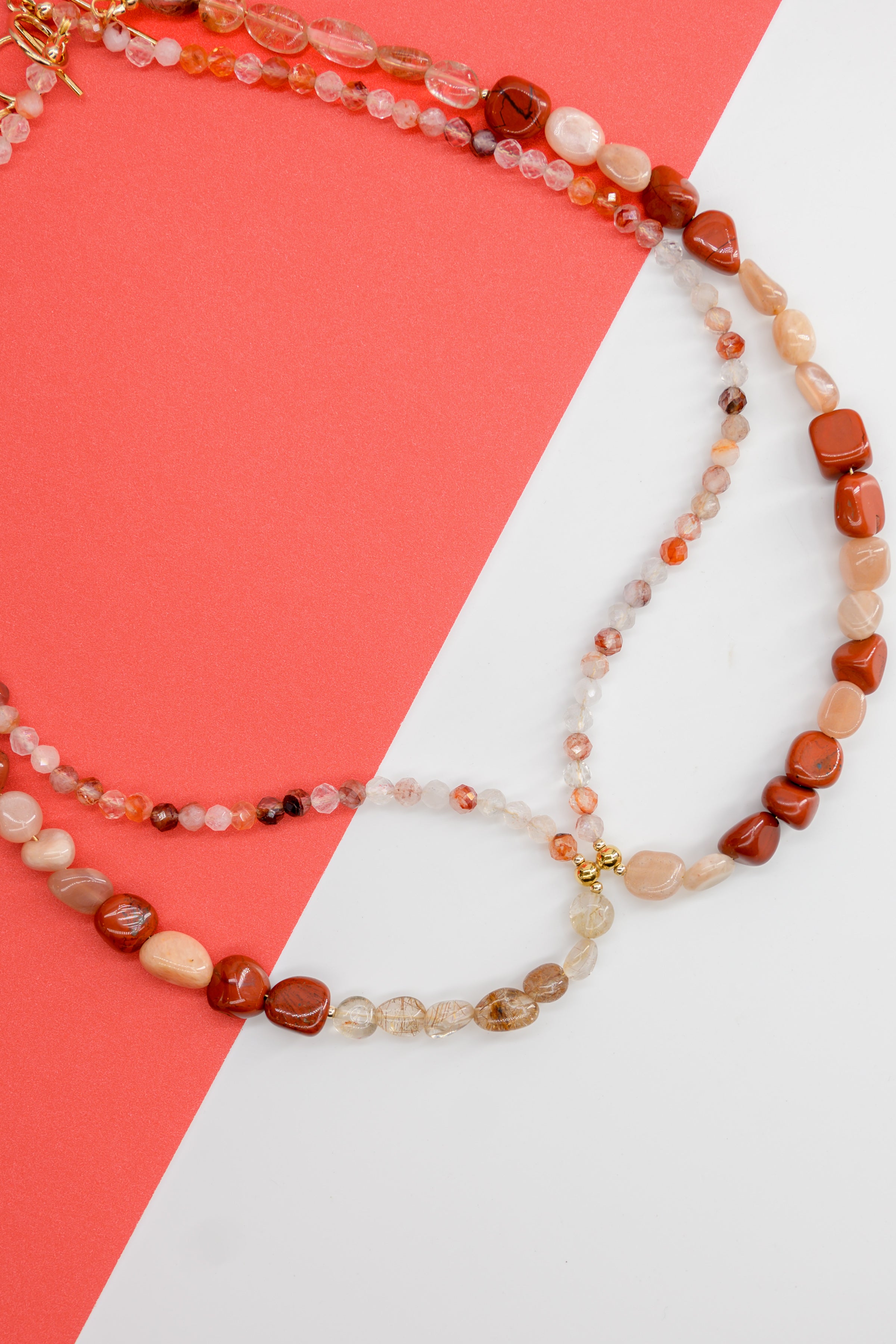 The Burning Desire necklace radiates with the fiery essence of Red Jasper, the warmth of Peach Moonstone, and the striking depth of Red Rutilated Quartz. This necklace offers seven unique styles, making it perfect for those who seek to embrace their inner fire and exude bold, warm elegance with every step.