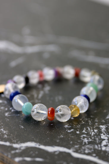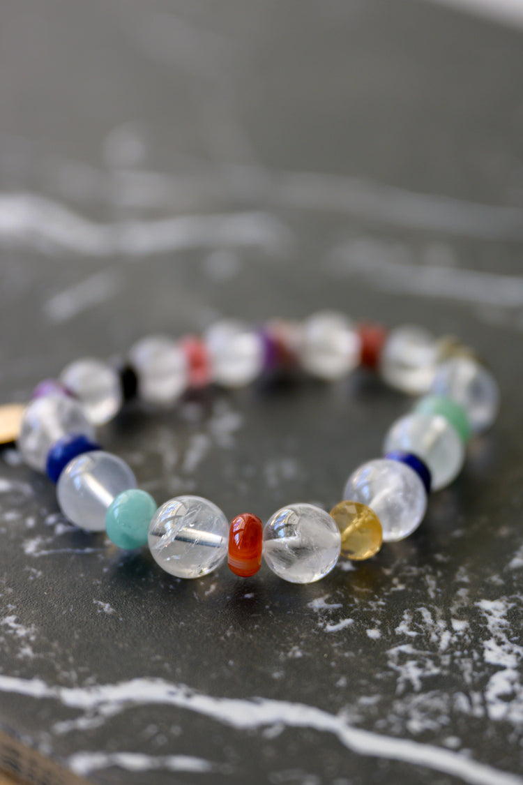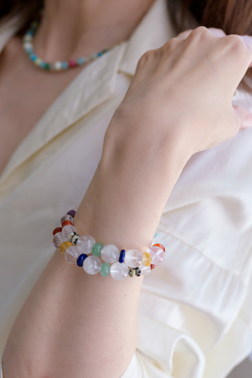 Color Pulse is an energizing rhythm of vibrant gemstones, where sparkling rock crystal punctuates a lively flow of Dalmatian jasper, dogtooth amethyst, Brazilian violet muscovite, and red jasper. With serene green angelite, juicy cherry quartz, natural carnelian, AA-grade lapis, and green aventurine, this bracelet radiates dynamic harmony and playful vitality in every bead.