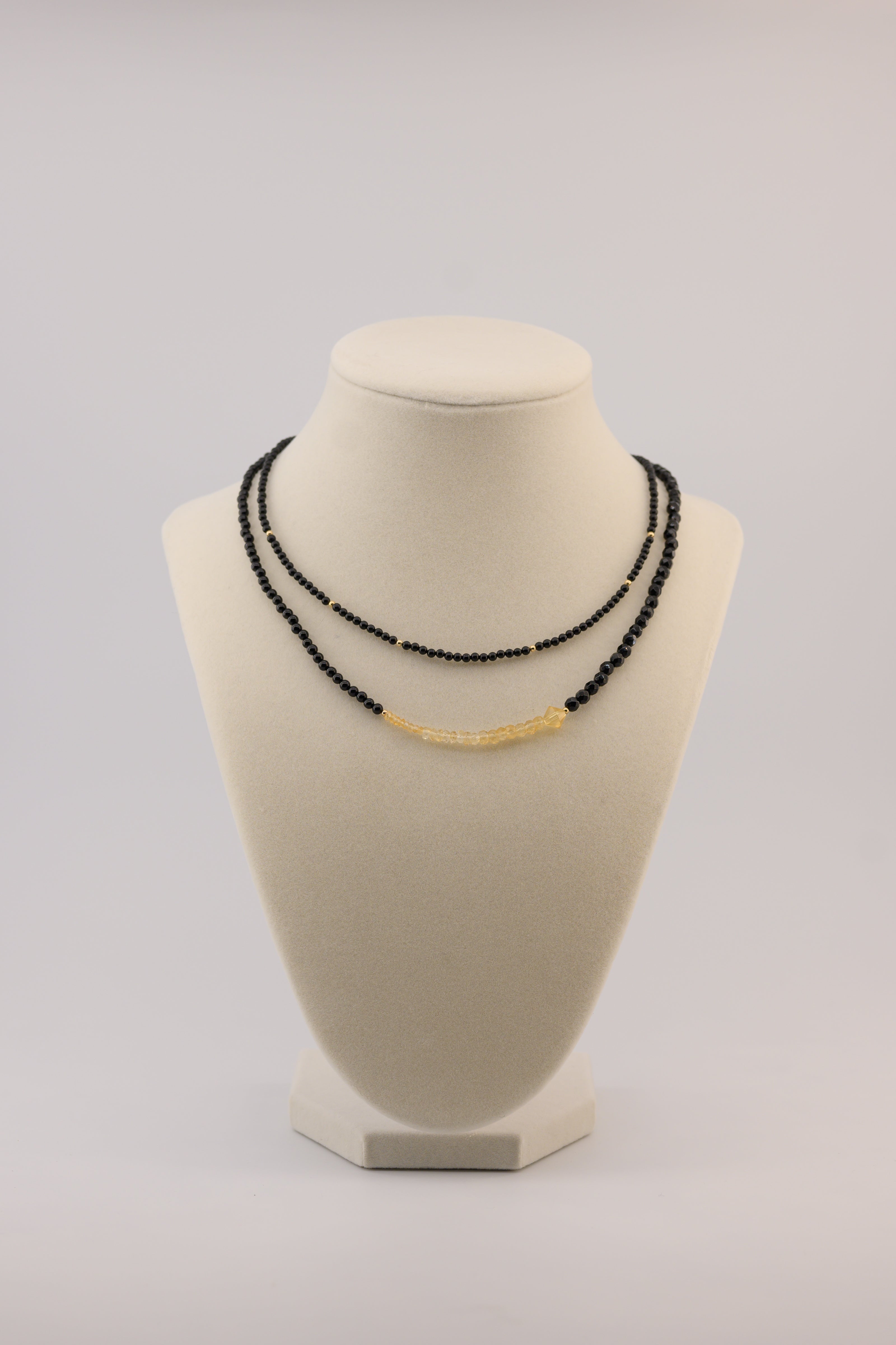 This stunning double lines necklace features a captivating fusion of citrine and onyx beads, creating a dynamic visual representation of a comet's luminous trail against the cosmic canvas.