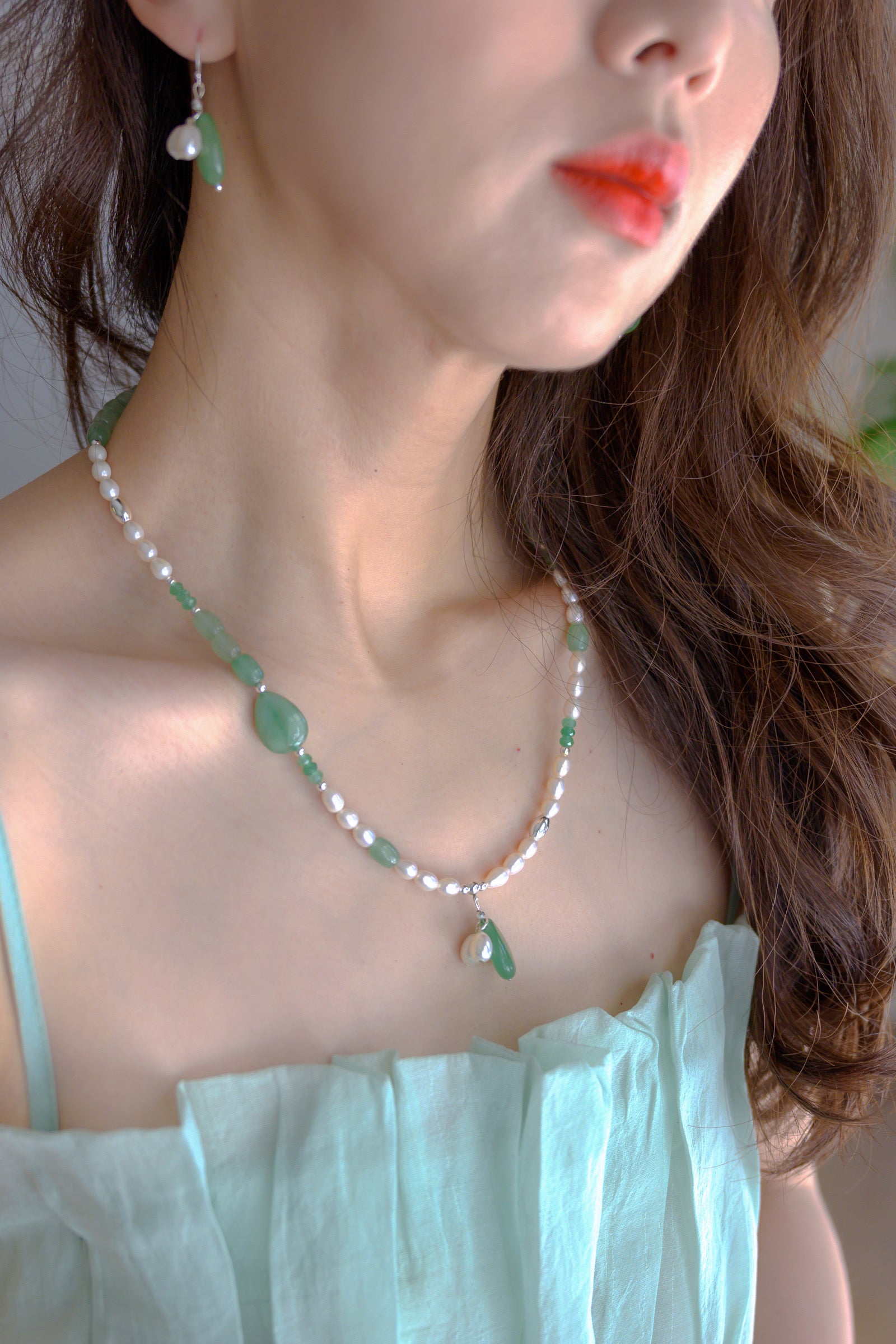 Matching the necklace, the earrings boast similar leaf-shaped Green Aventurine drops, each complemented by two Freshwater Pearls designed to resemble delicate dew caught on foliage at dawn. The natural green hues of the Aventurine, paired with the lustrous white of the pearls, create a visual harmony that's both refreshing and uplifting. This jewelry set is perfect for those who appreciate nature’s subtle beauties and seek to carry the spirit of new beginnings with them throughout their day.