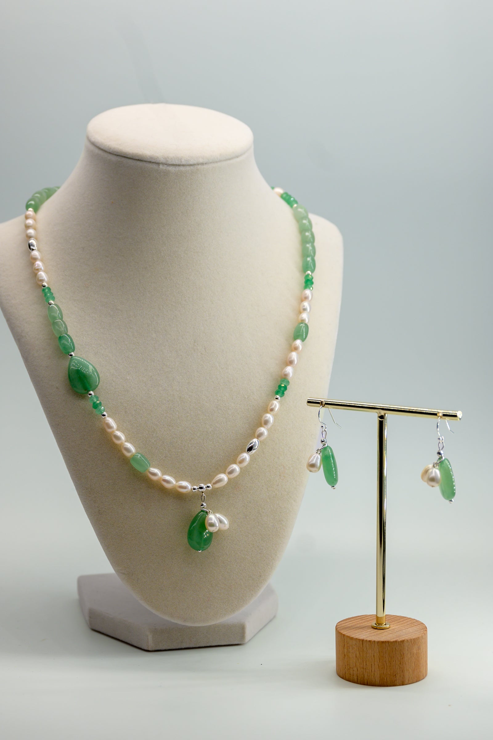 Dawn Leaf Jewelry Set Green Aventurine Freshwater Pearls