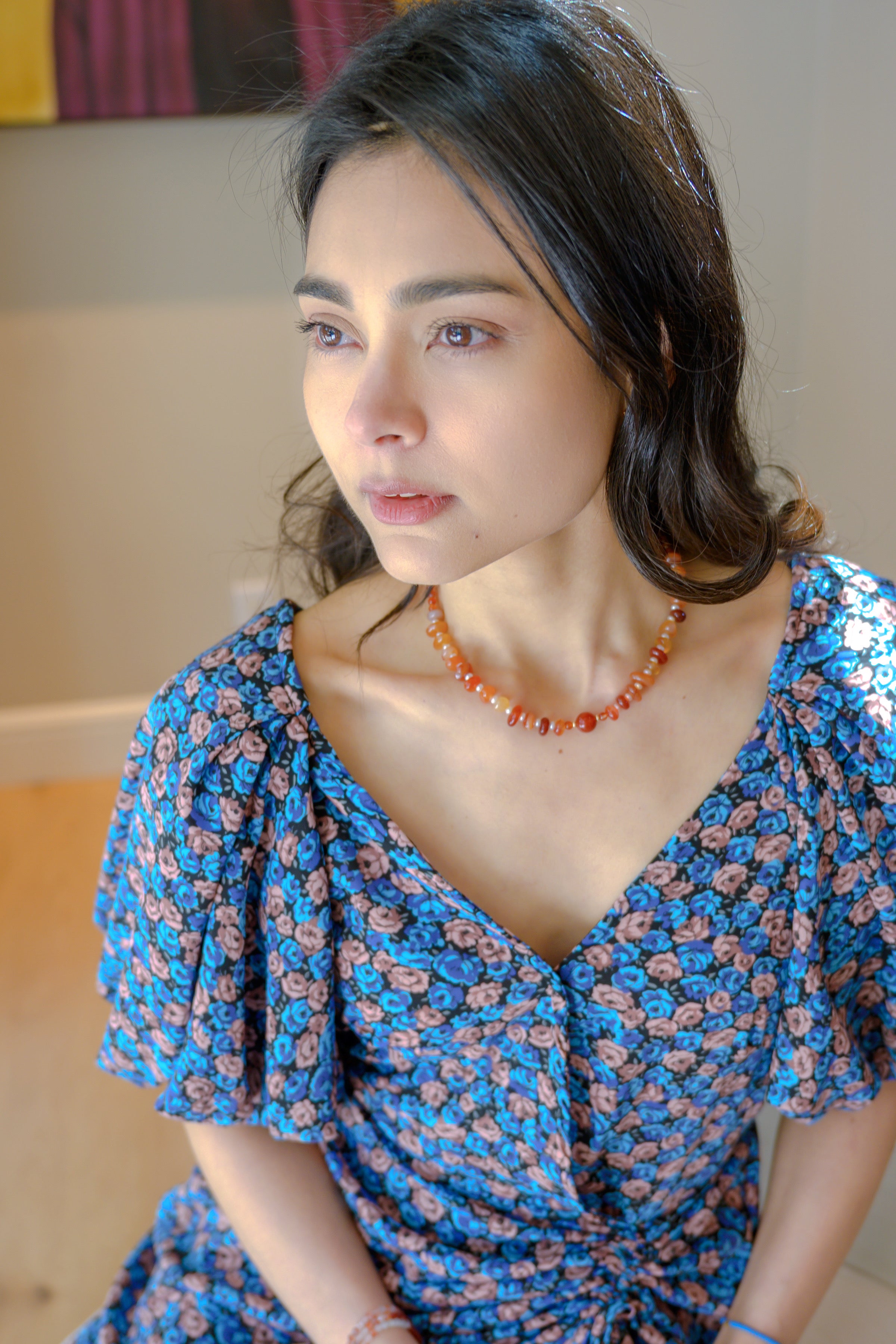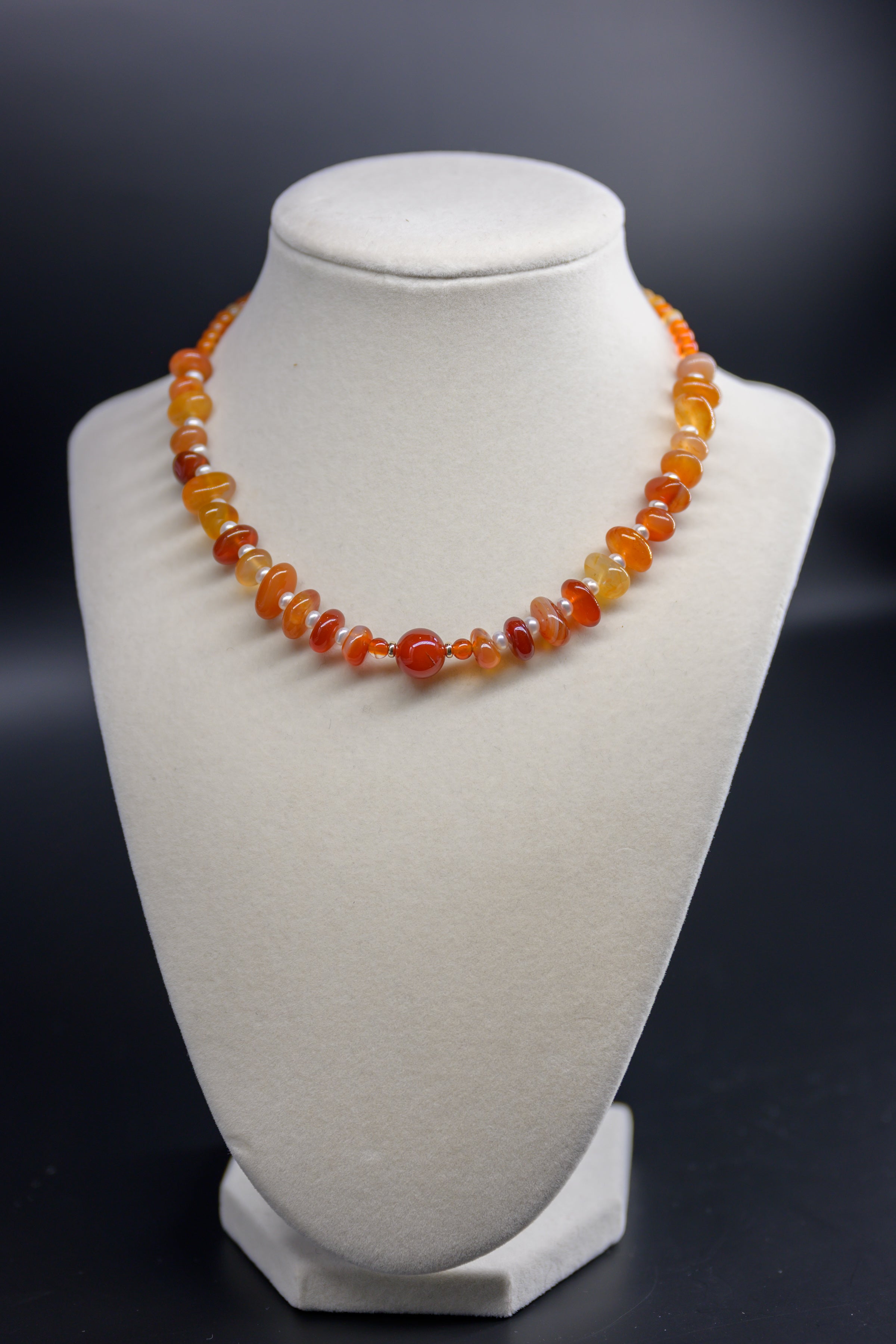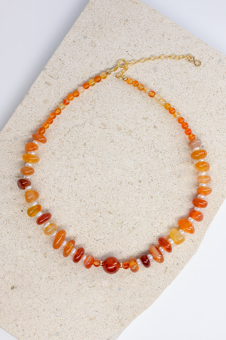 The Desire's Glow necklace exudes warmth and allure, featuring side-drilled Carnelian pebbles that radiate a fiery, captivating energy. Nestled between each vibrant Carnelian bead are delicate freshwater button pearls, adding a touch of softness and elegance to the bold design.