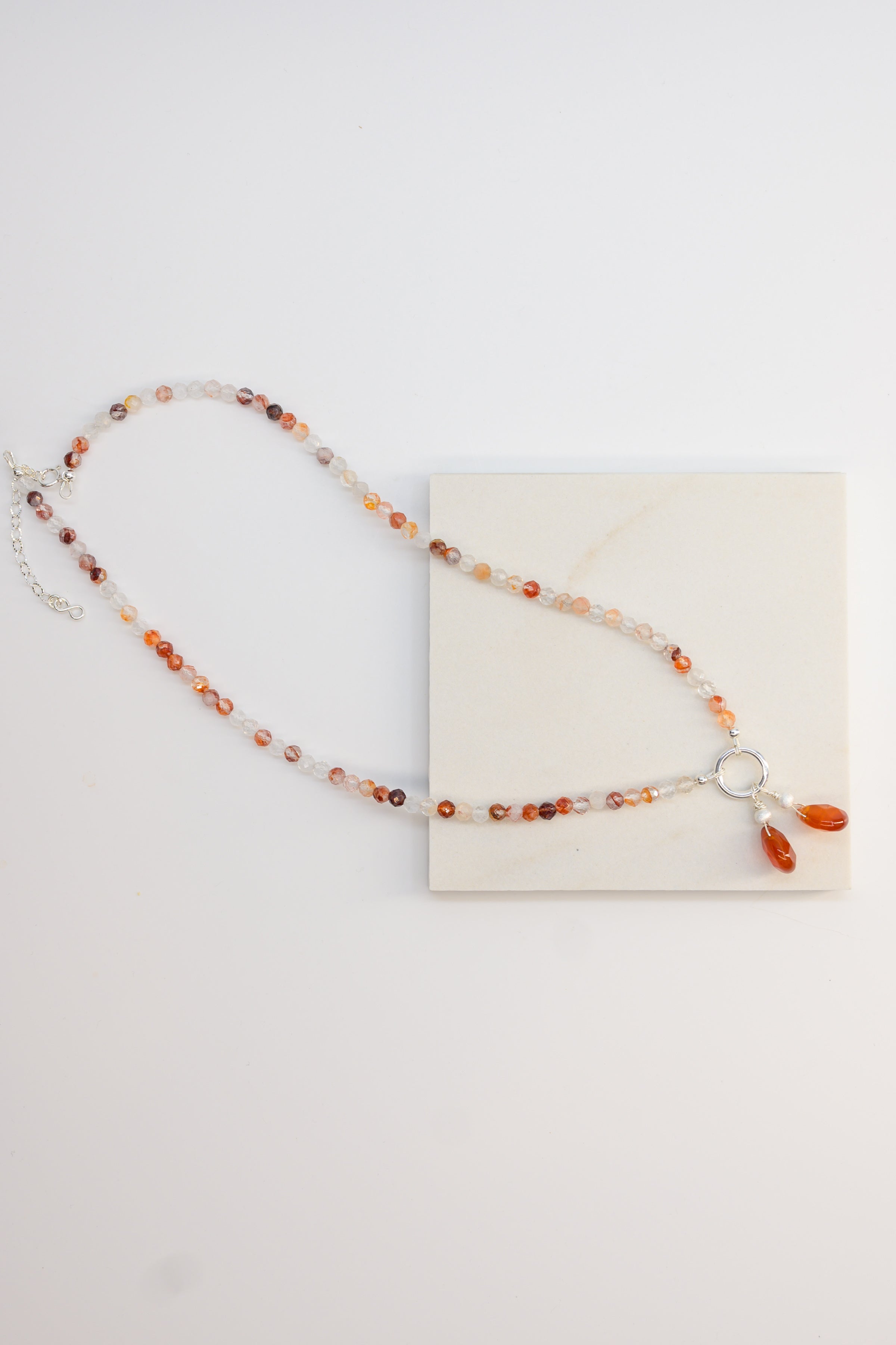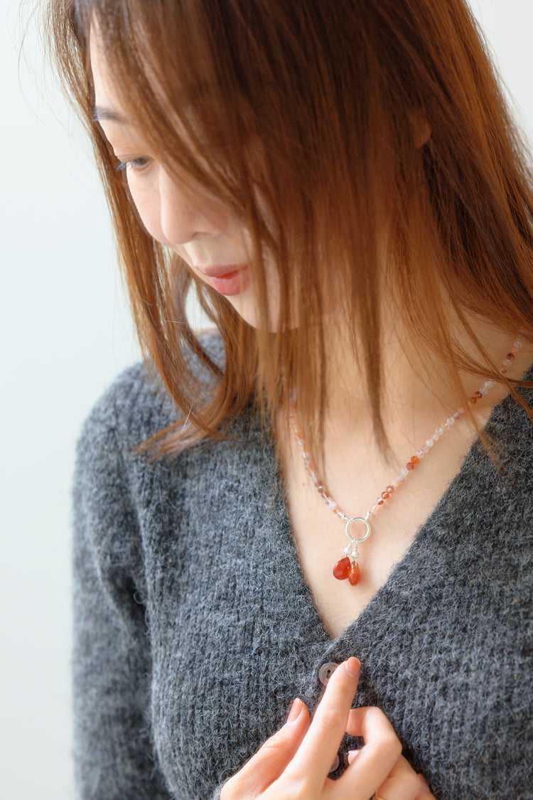 The Double Cherries, Double Blessings Necklace features vibrant Red Rutilated Quartz beads paired with Carnelian drops, symbolizing prosperity and happiness. This elegant piece combines fiery hues and shimmering textures, making it a meaningful talisman for joy and abundance.