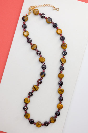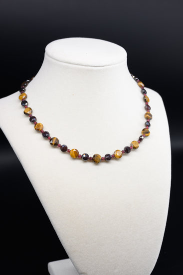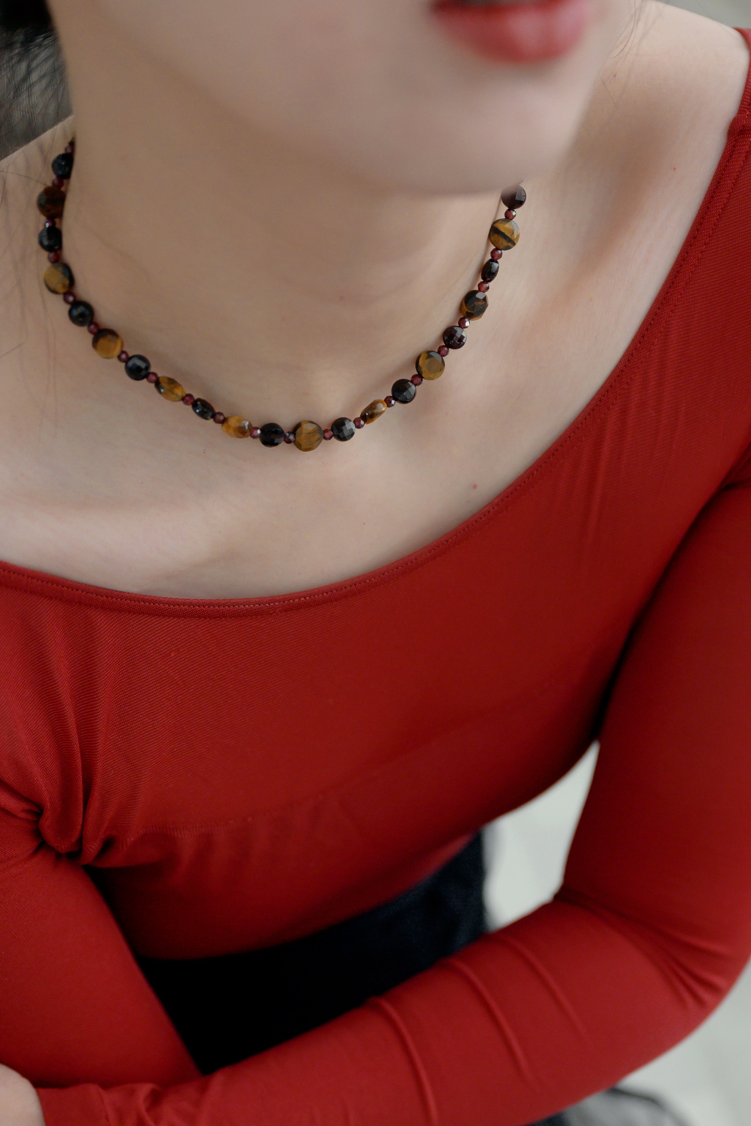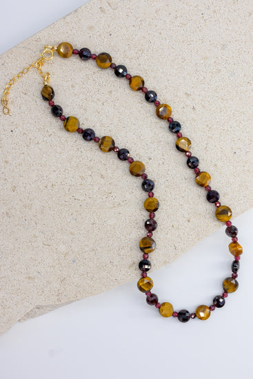 The Fiery Ground necklace combines the rich, earthy tones of flat coin-shaped Garnet and Tiger Eye beads, symbolizing strength and grounded passion. Each Garnet bead radiates a deep warmth, while the Tiger Eye beads add a protective energy with their golden shimmer.