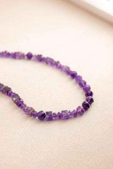 Style It With: All-Black Ensembles: Let the geometric textures of the purple stones be the focal point against a black turtleneck or silk slip dress. Crisp Tailoring: Pair with a structured white blazer to highlight the sharp edges of the Squaredelle beads. Layering: This is a perfect base layer for shorter gold chains or a dainty pendant, as its texture adds "grit" to a feminine stack.