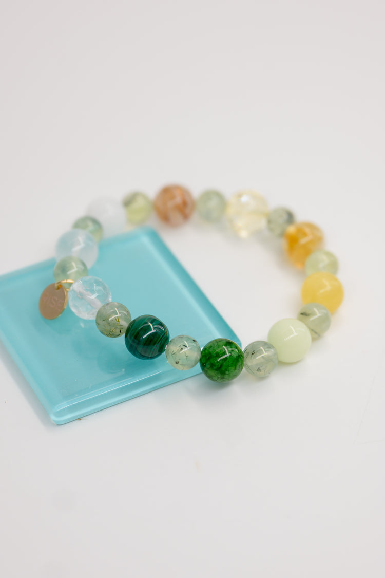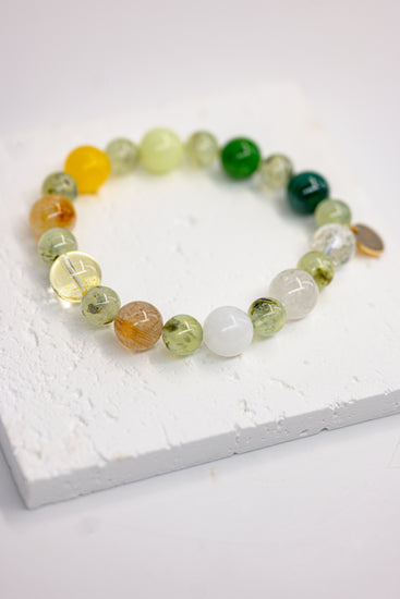 Golden Ambition Bracelet | Prehnite (w/ Rutile) Malachite Glow-in-dark Mexican Olive Green Aragonite