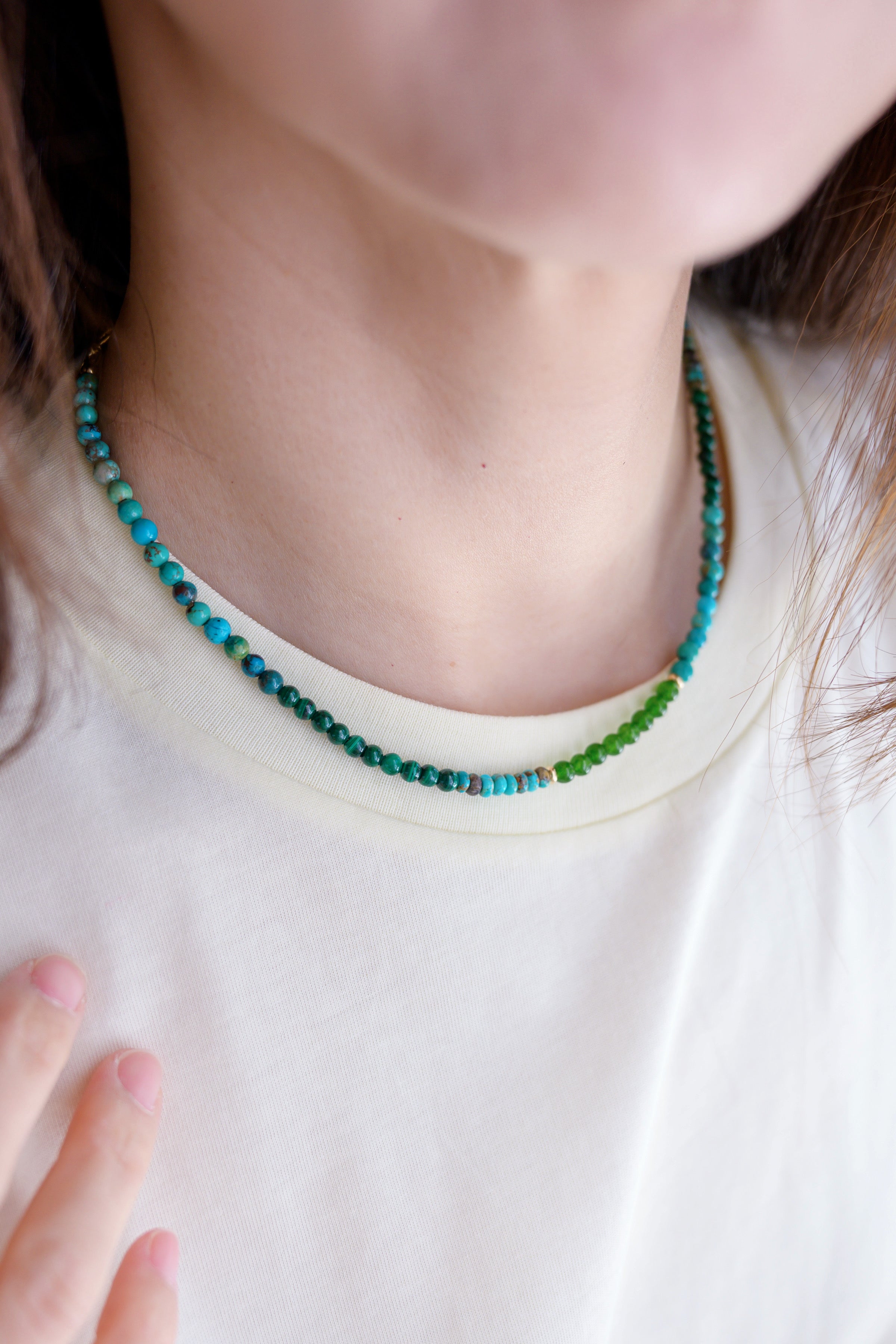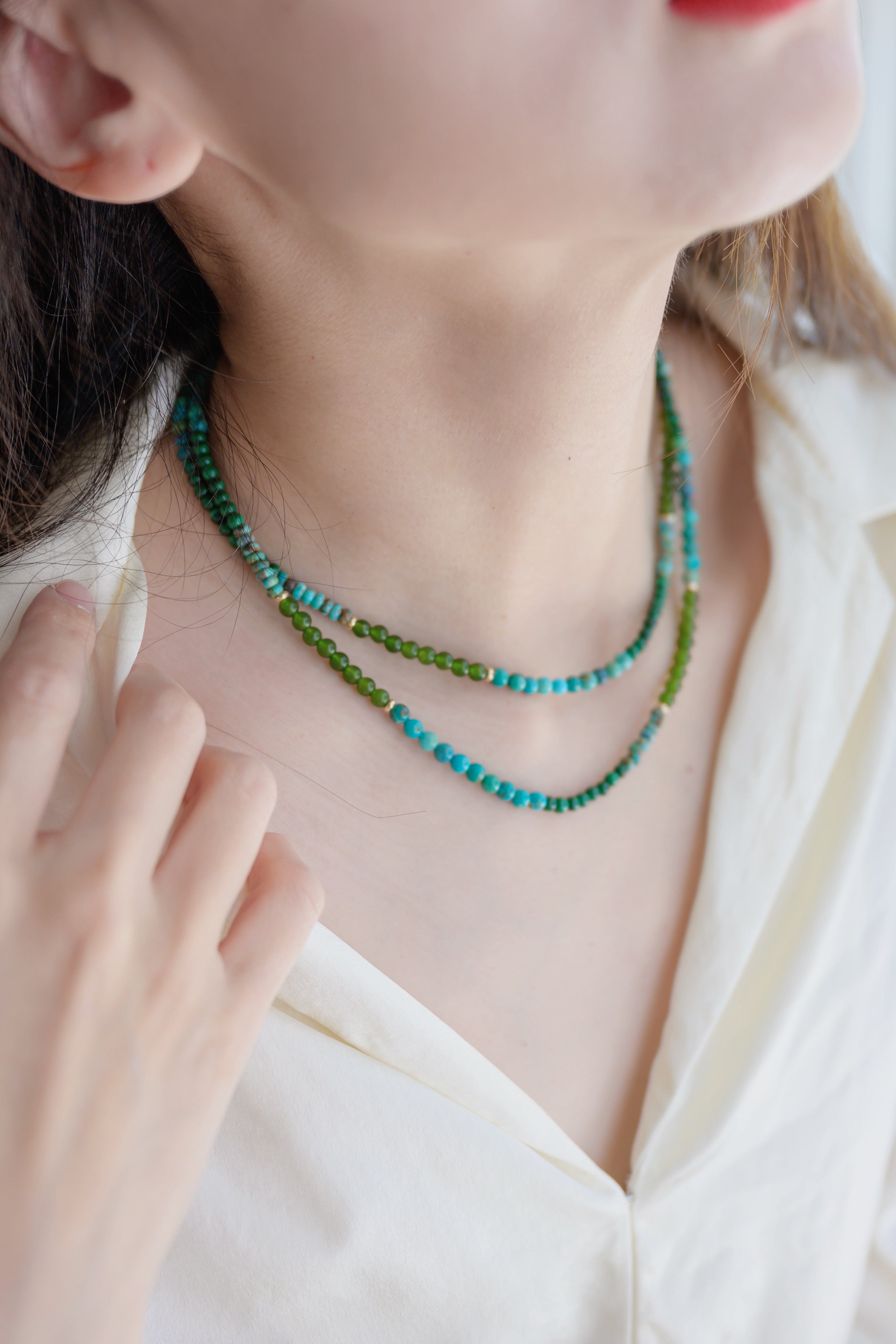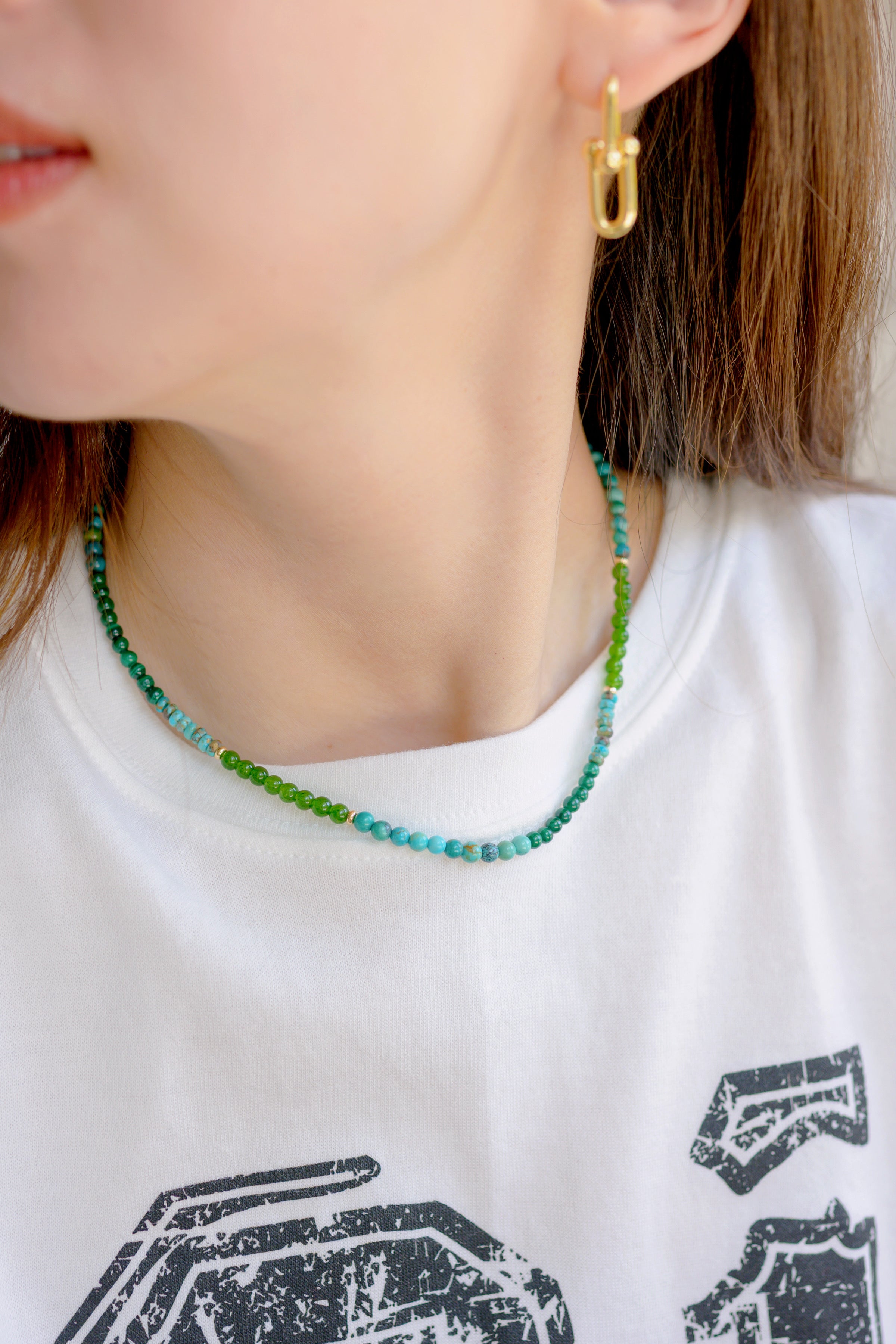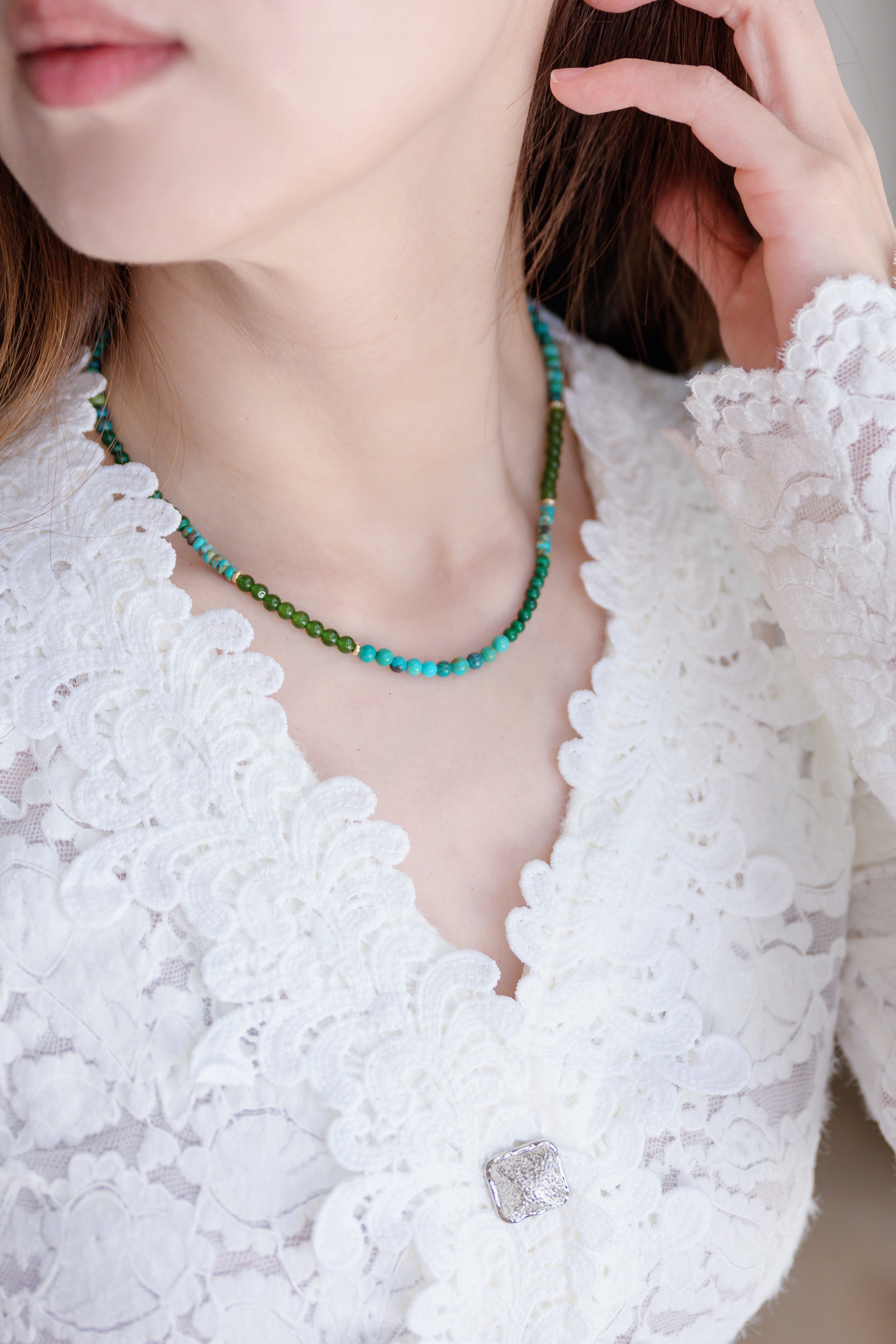 Green Horizon is a bold tribute to summer’s wild beauty and grounding calm. Featuring vivid Hubei Turquoise (A), richly patterned Malachite, and smooth, deep-green Canada B.C. Jade (AA), this necklace evokes endless landscapes—rolling hills, turquoise waters, and forested paths under open skies. It’s a piece that connects you to the earth’s strength and serenity, wherever your journey leads.