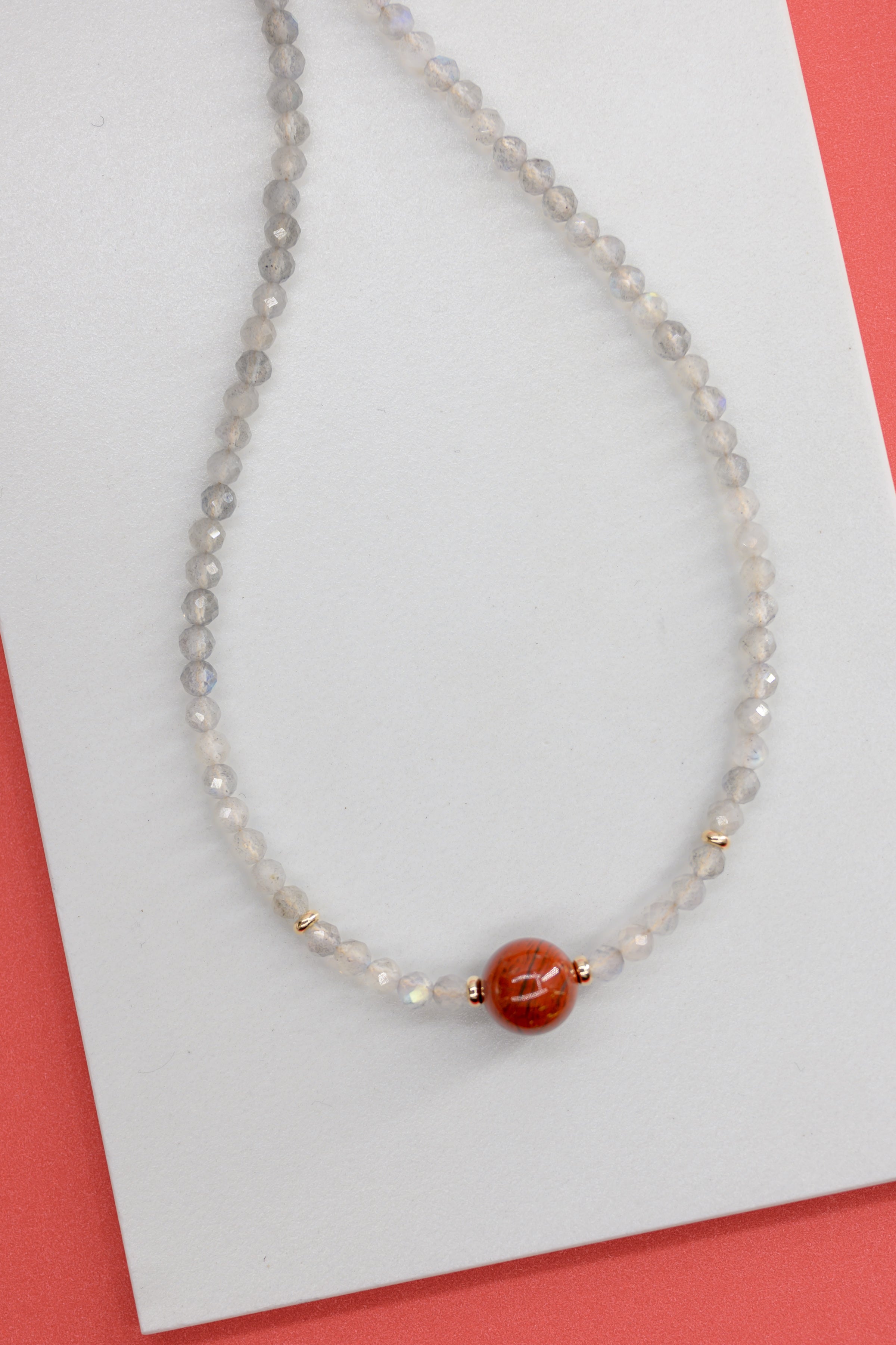 The Heart of Fire necklace showcases a striking Red Snake Skin Jasper bead at the center of a shimmering Labradorite chain, symbolizing a powerful inner flame surrounded by mystery. The cool, iridescent tones of Labradorite beautifully contrast with the fiery warmth of the Red Jasper, creating a bold yet balanced look.