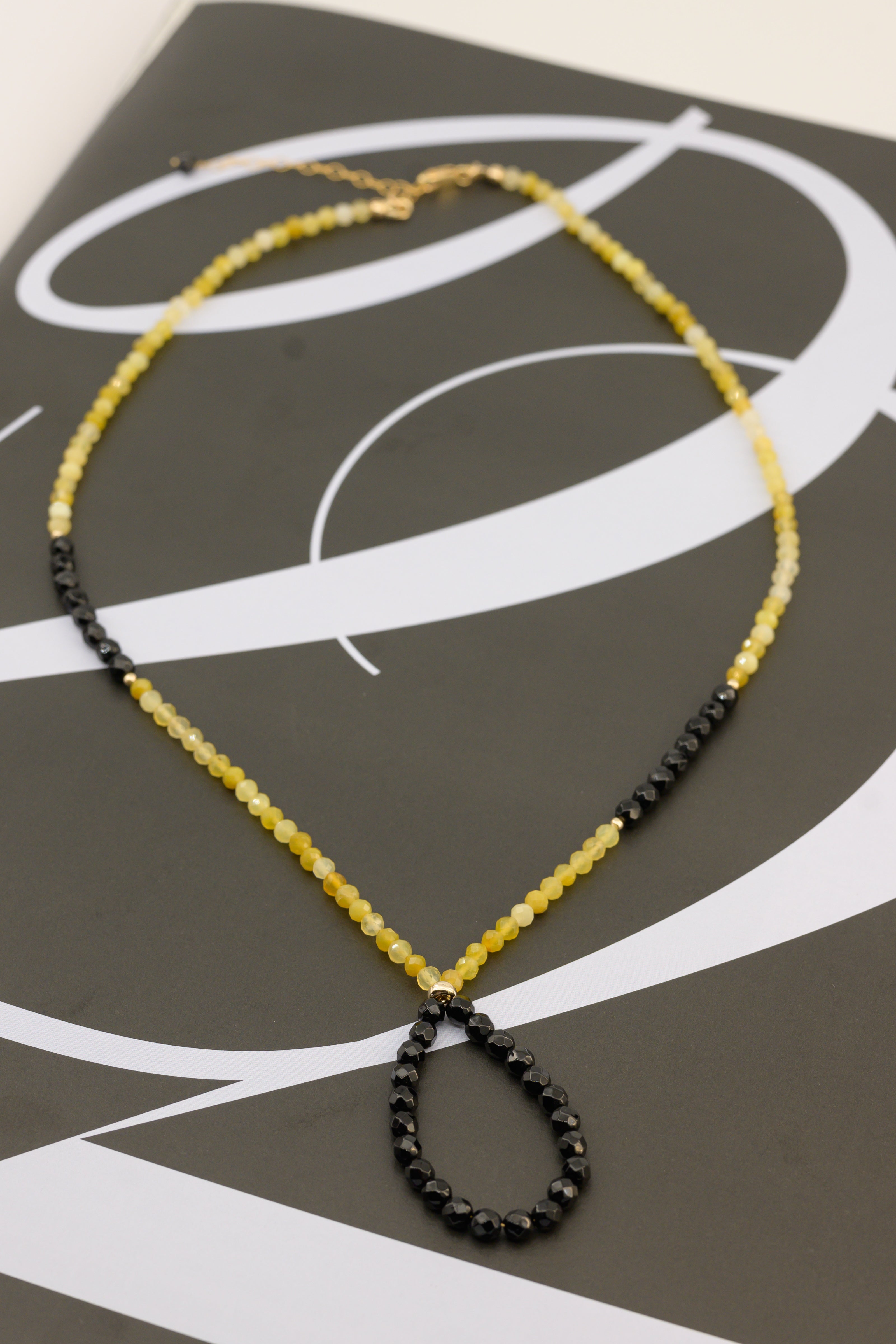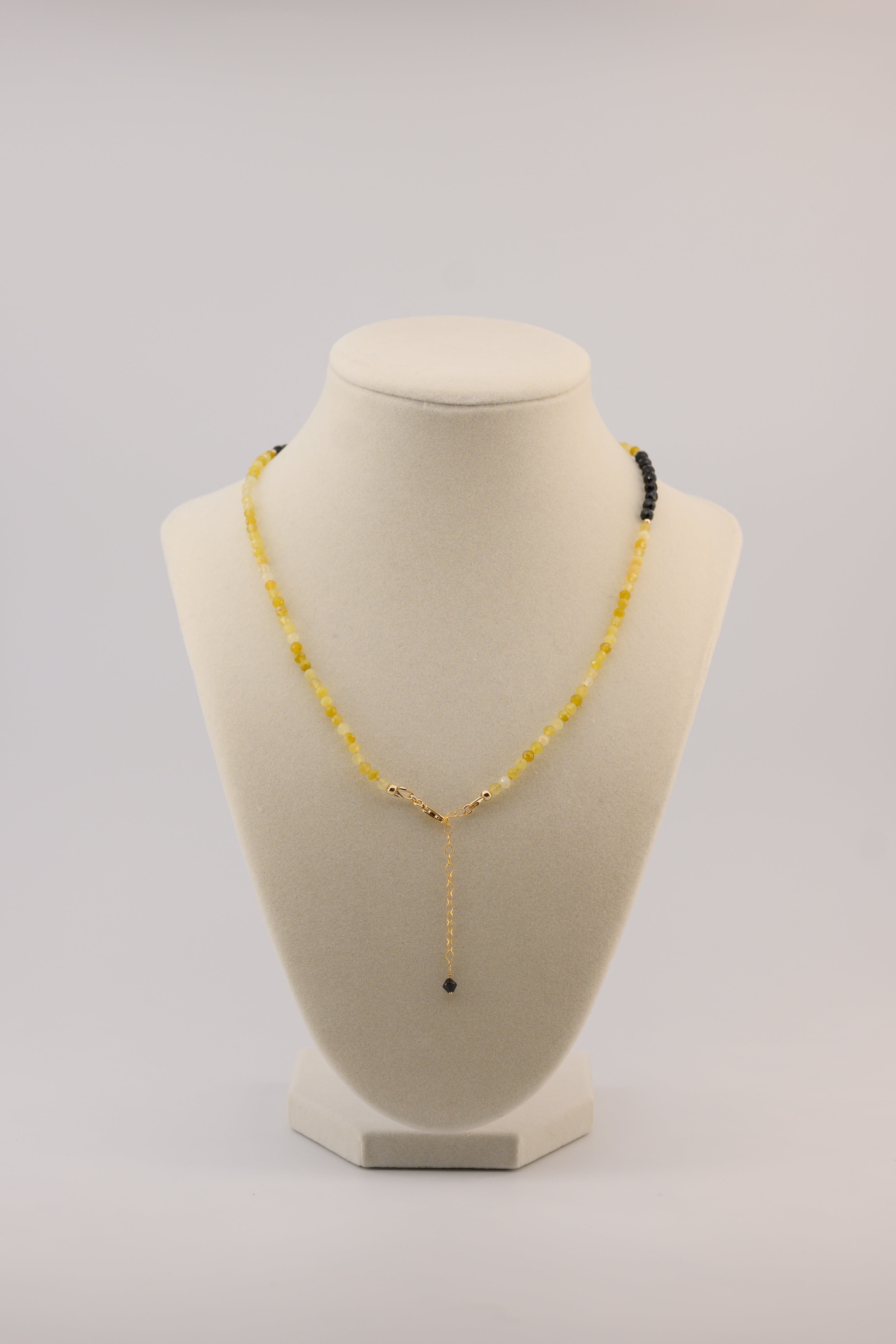 The stunning gemstone necklace showcases the mesmerizing blend of yellow opal and onyx beads, crafting a visual masterpiece that mirrors the infinite elegance of the cosmos.
