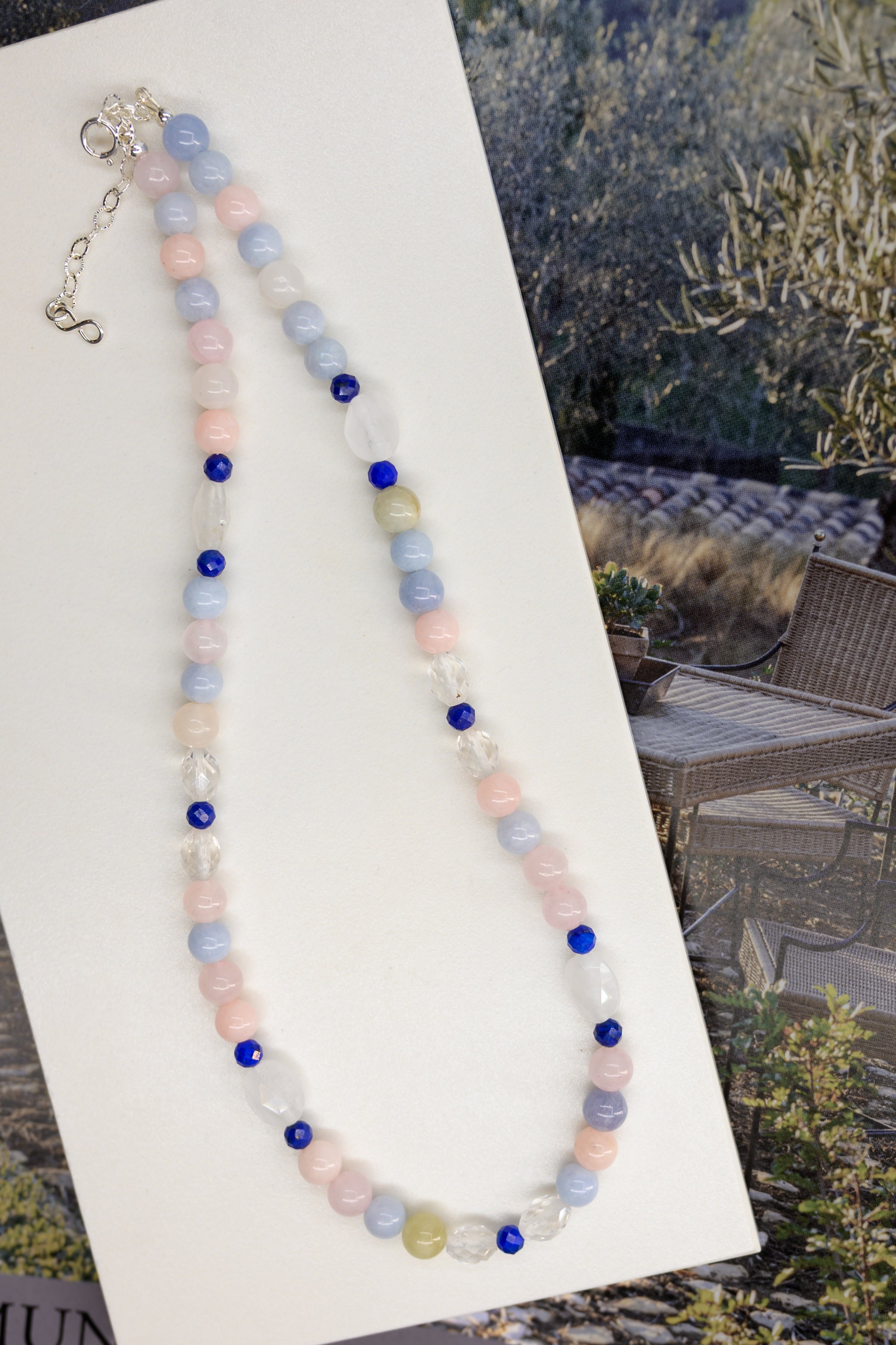 Lagoon Glow necklace is a radiant blend of sky, sea, and sunlit clarity—an invitation to drift into summer serenity. With soft-hued Multi Beryl (A), deep oceanic Lapis (A), and the pure shimmer of Rock Crystal Quartz, this necklace captures the tranquil beauty of a tropical lagoon, where light dances on the water and every moment feels effortlessly calm and bright.