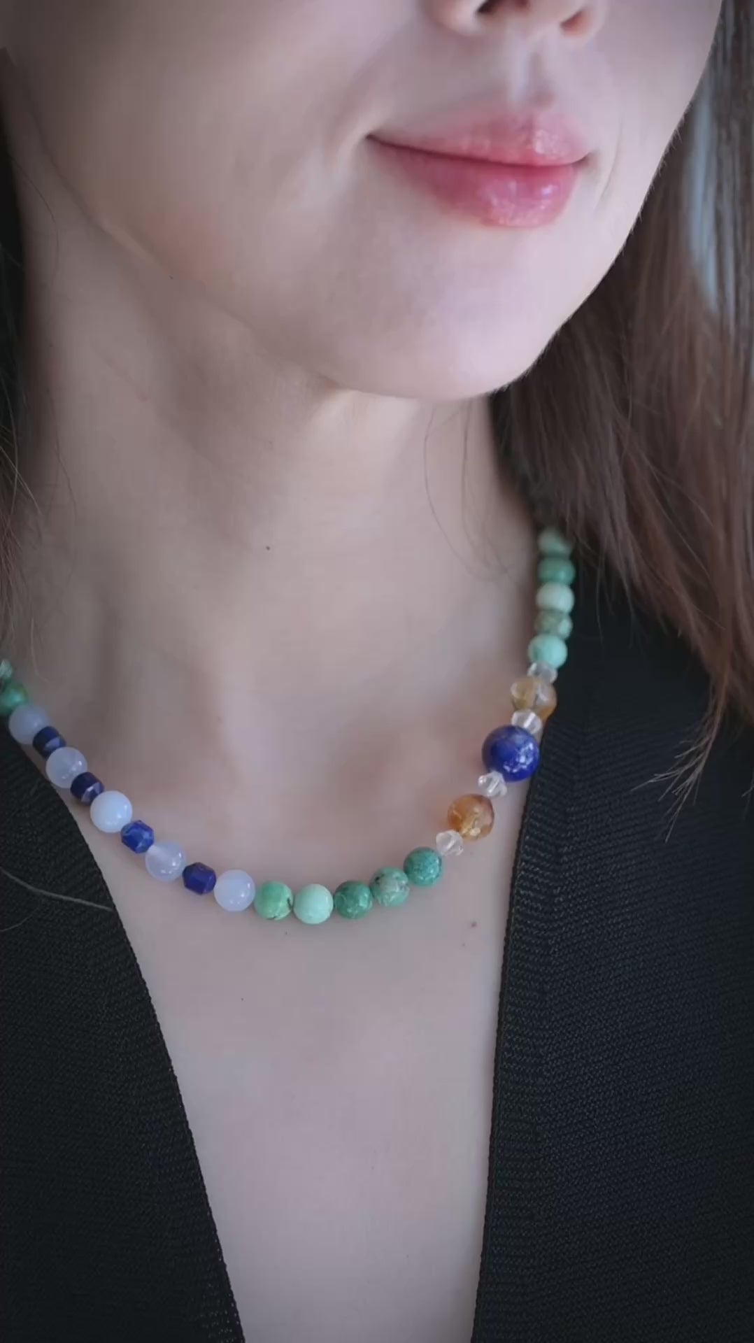At the heart of the design sits a bold 12mm Lapis Lazuli focal bead, rich and velvety, like a fragment of the midnight sky sprinkled with starlight. Around it, a carefully balanced constellation of gemstones unfolds: