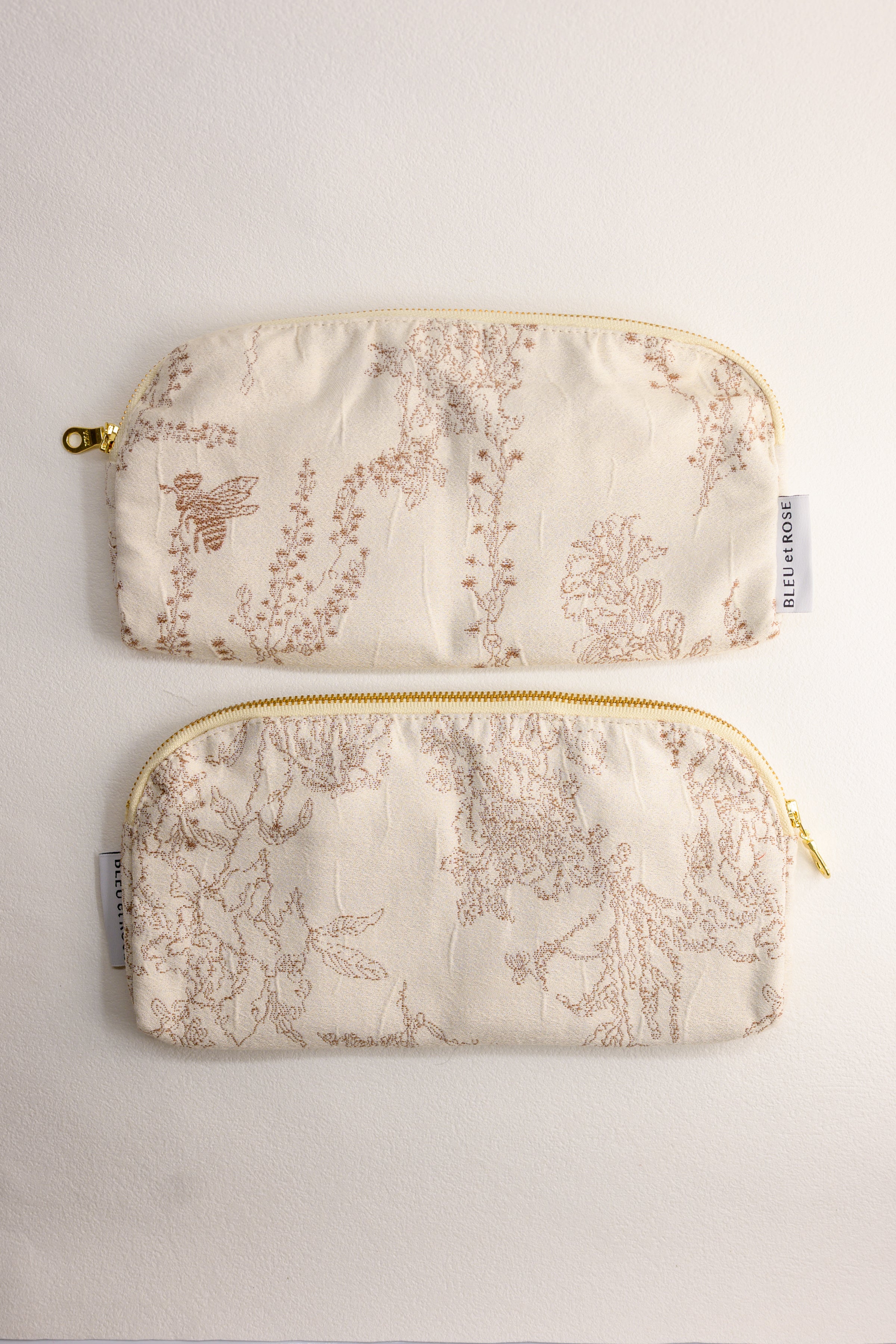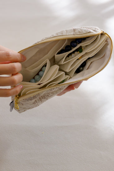 This large jewelry pouch features 10 compartments and one inner pocket, offering a maximum capacity to hold up to 12 bracelets. The exterior is crafted from jacquard fabric, while the interior is made of pure cotton for soft and gentle protection of your jewelry.