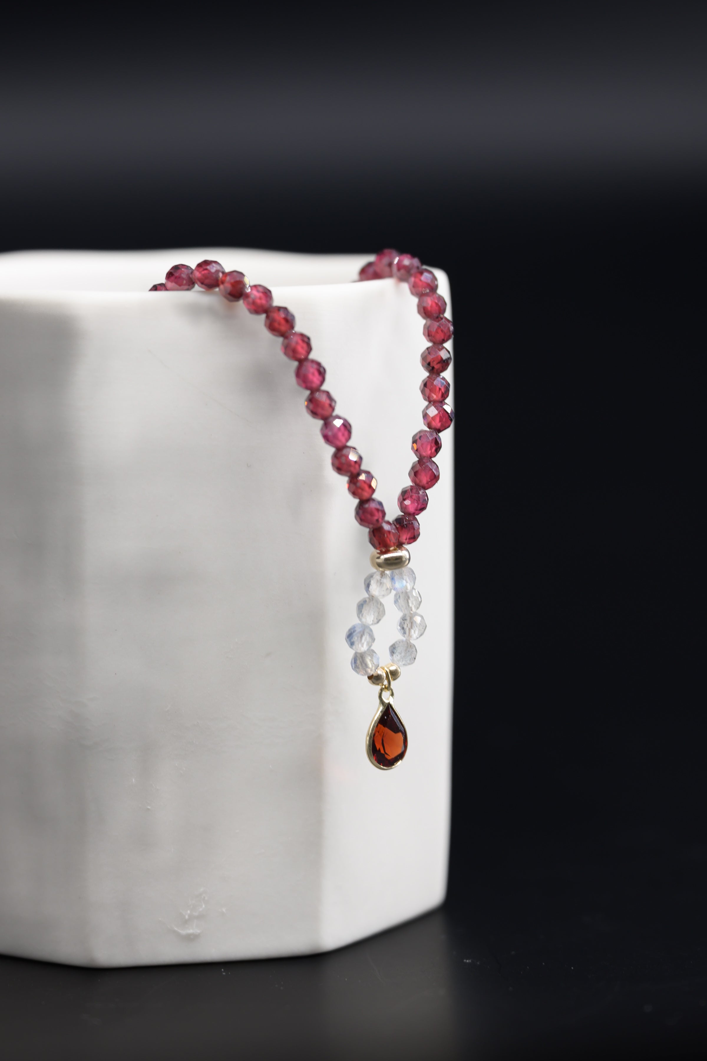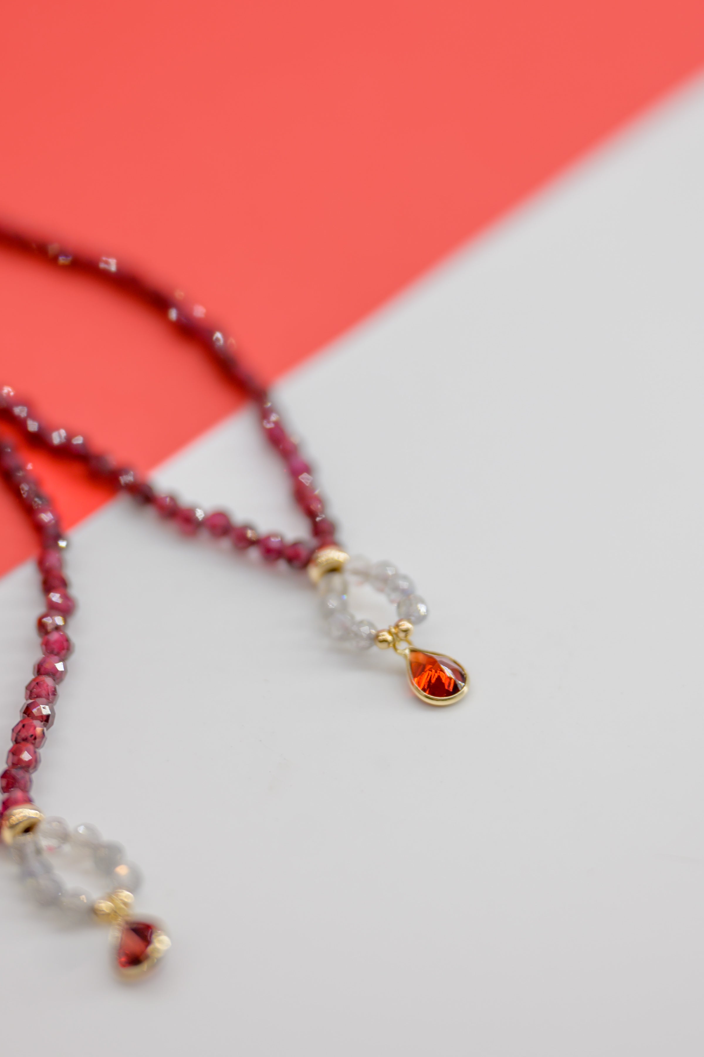 The Lava Heart necklace blends the intense allure of Garnet with the mystical flashes of Labradorite, creating a captivating piece that embodies both passion and mystery. At its center, a rich Garnet drop adds a dramatic focal point, symbolizing the fiery depths of the heart. This necklace is perfect for those who seek to wear their inner strength and magnetism with grace, channeling both warmth and enchantment in every glance.