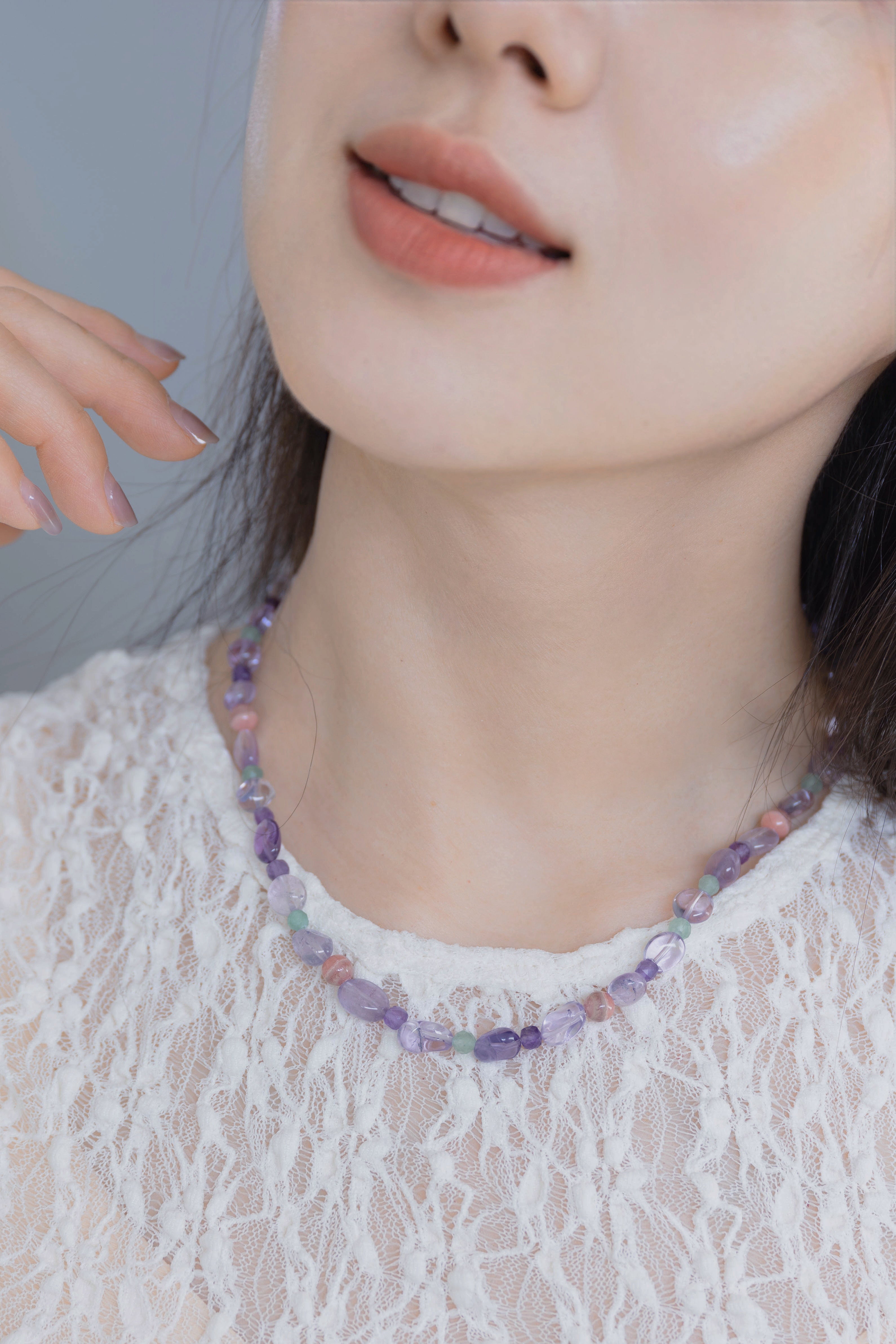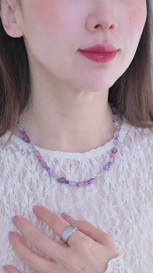 The Lavender Horizon is a poetic exploration of color and contrast, designed to capture the moment when a dream begins to take shape. Featuring a thoughtful curation of Lavender Amethyst, Rhodochrosite (A), and Green Aventurine, this necklace creates a visual narrative of a blooming landscape under a twilight sky. The addition of Deep Amethyst provides a rhythmic depth that ties the organic palette together into a sophisticated, wearable masterpiece.