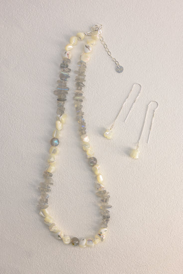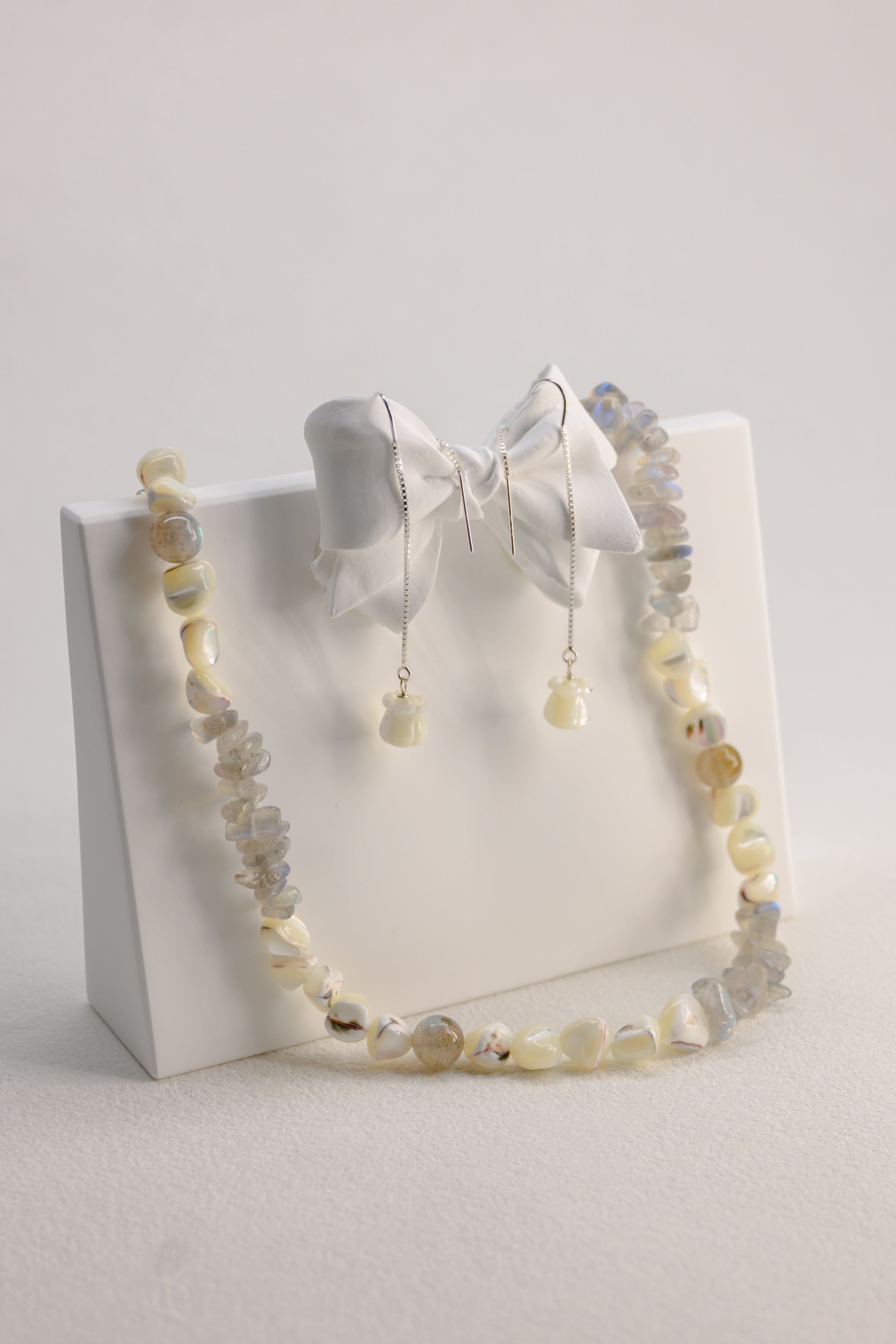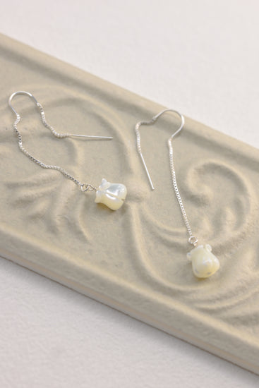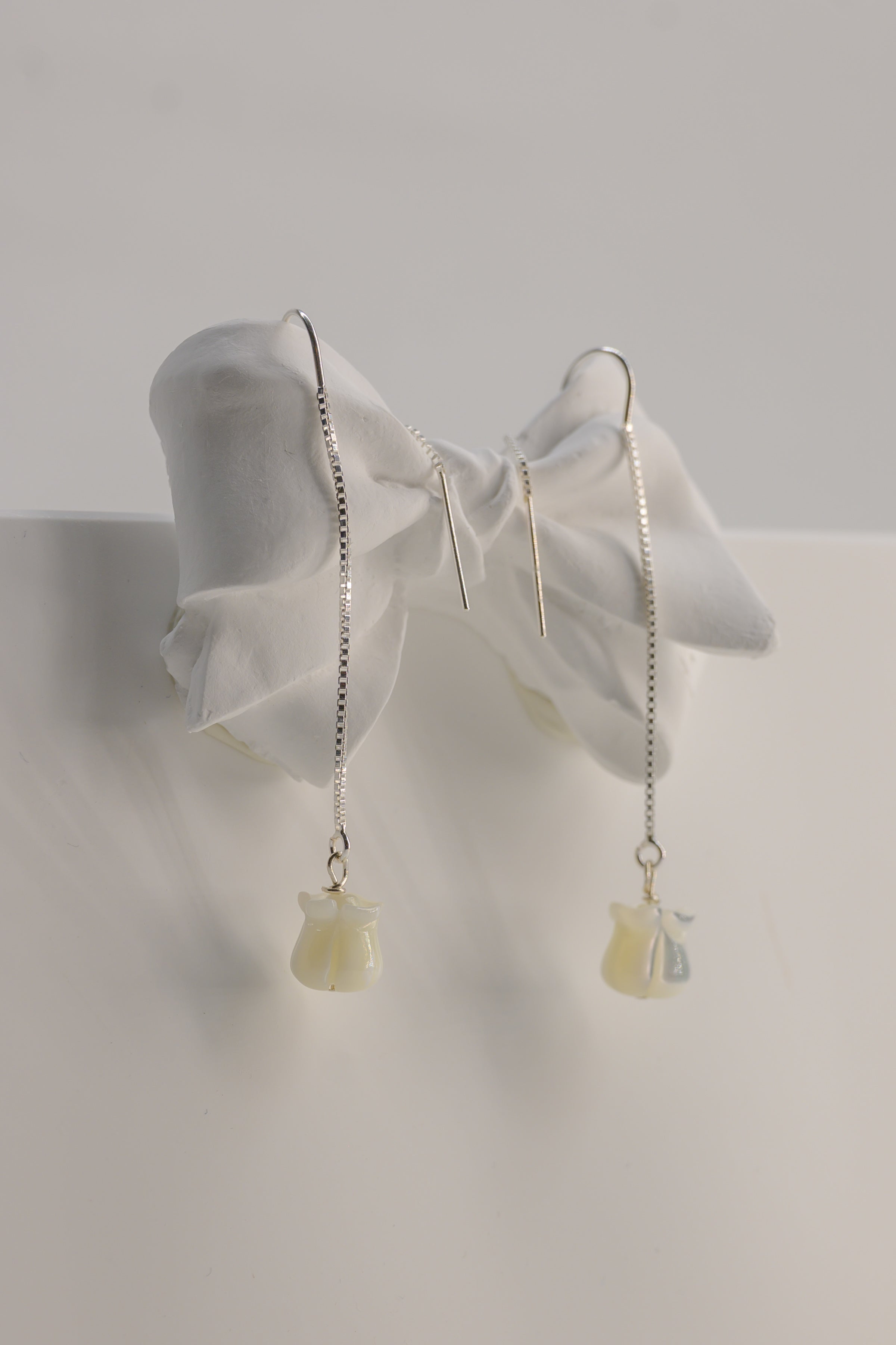 At the end of each slender sterling silver chain hangs a delicately carved Mother of Pearl tulip, glowing softly like a flower blooming beneath the moon. The tulip sways gently with every motion, its iridescent petals catching the light — refined, fluid, and timelessly feminine.