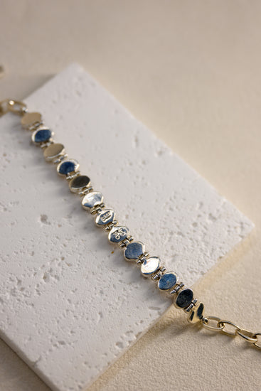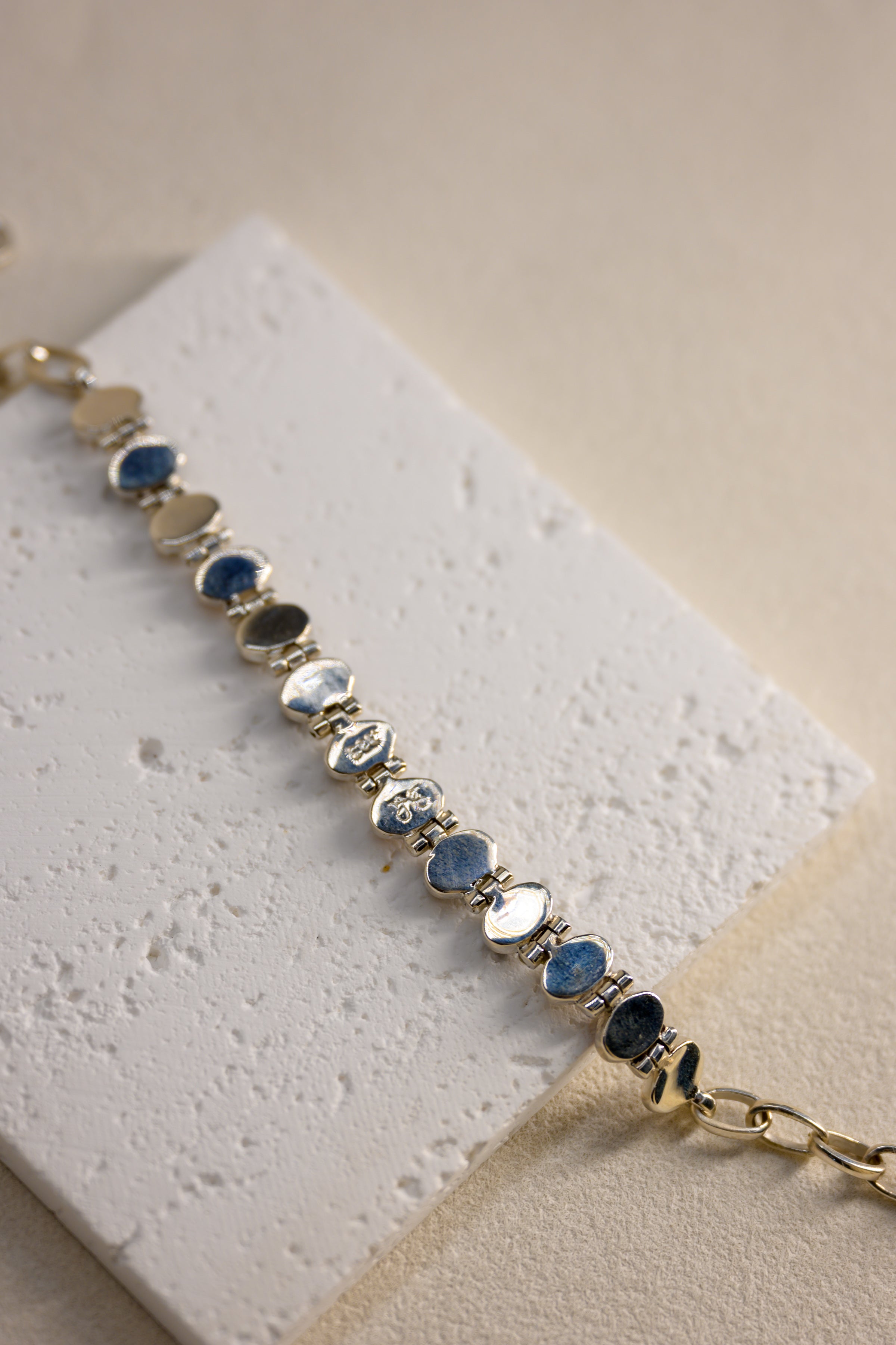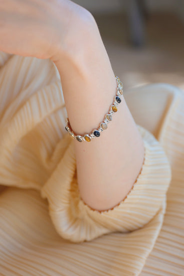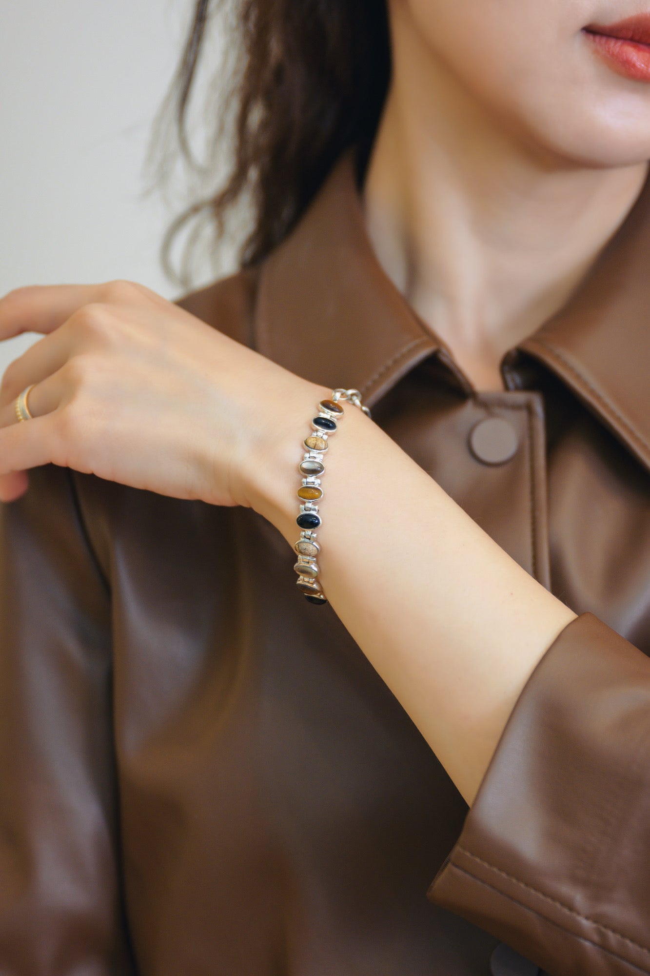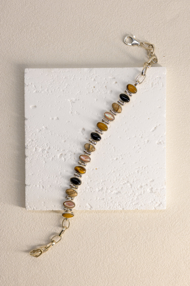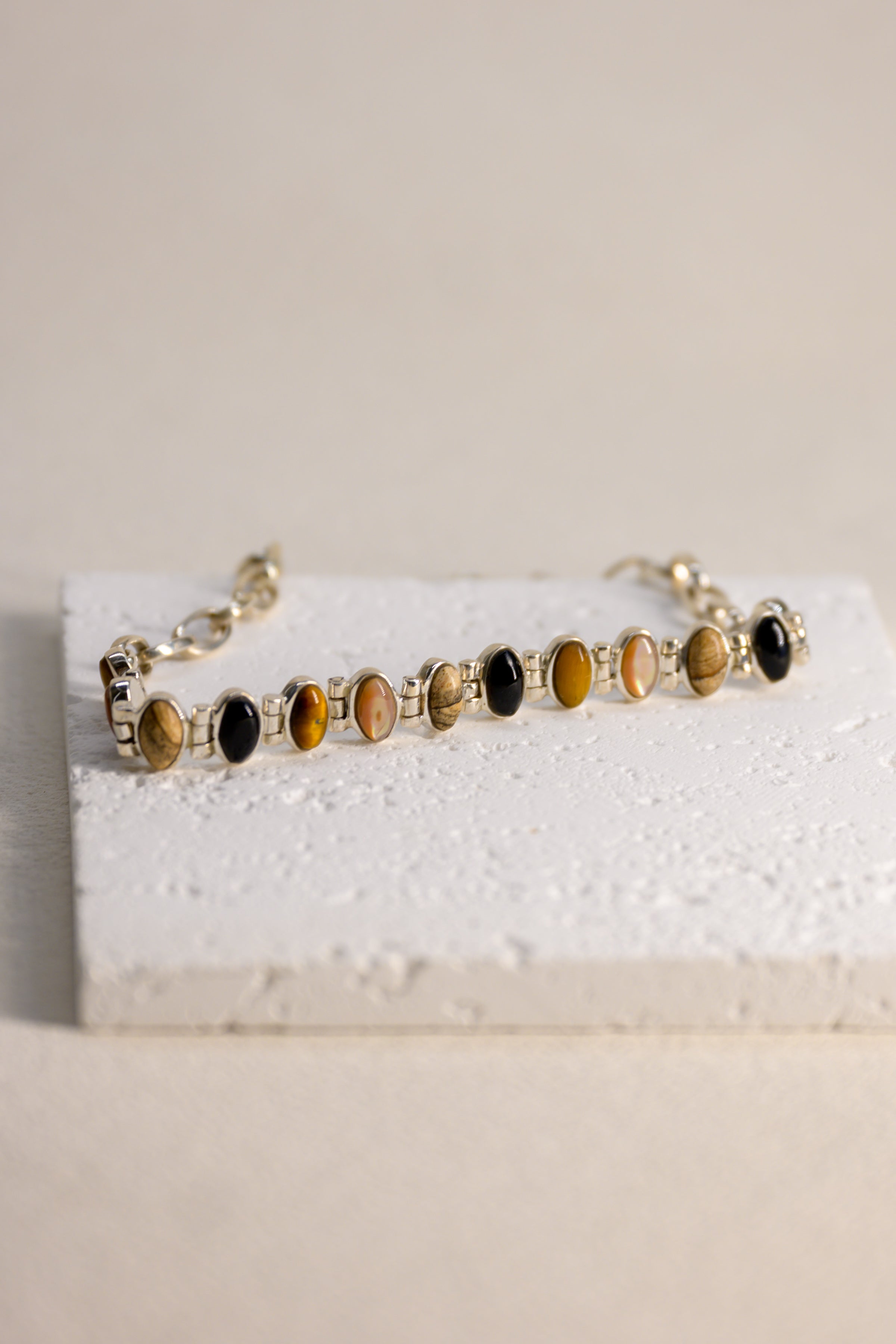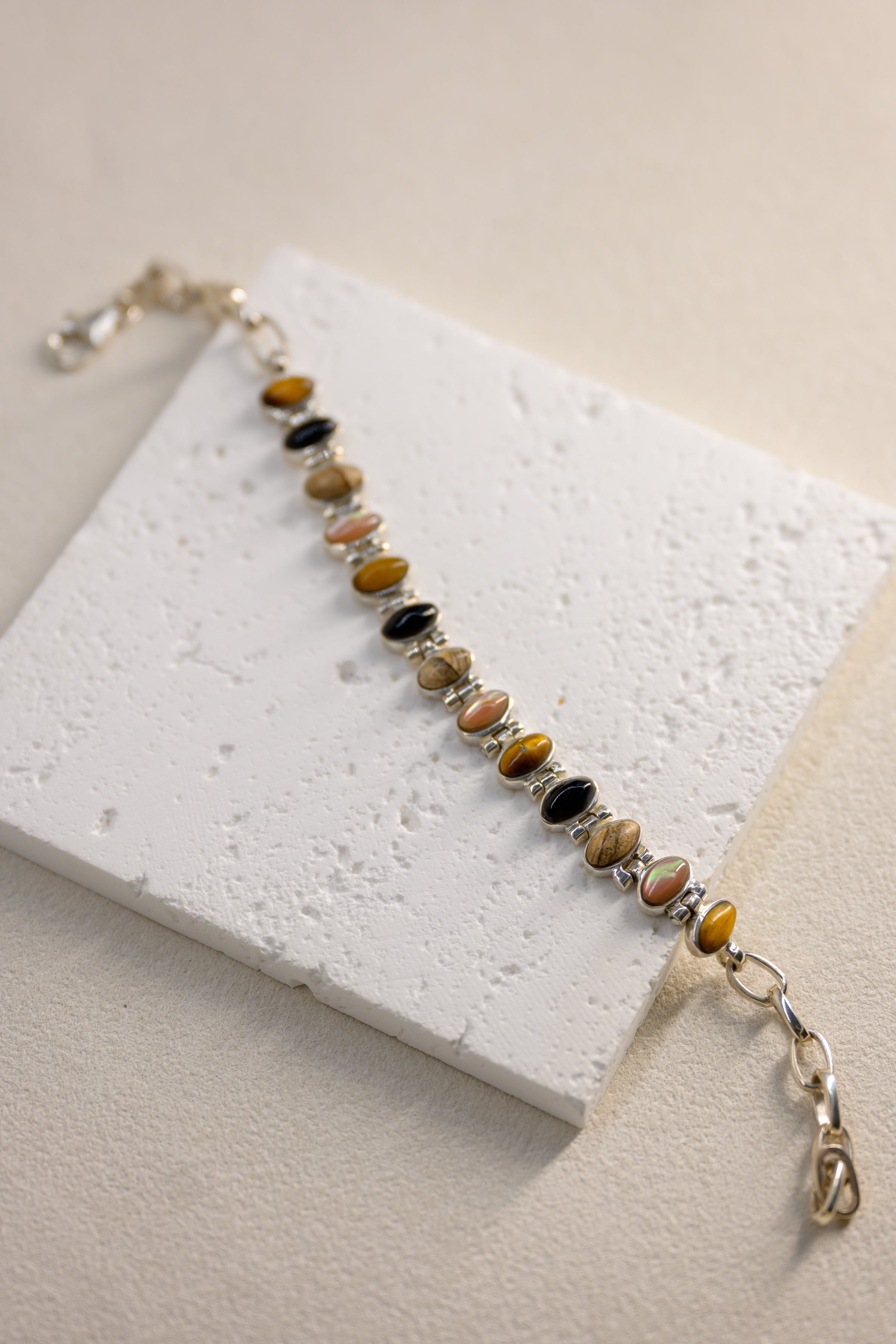 Inspired by the ancient cliff dwellings of Mesa Verde National Park, this bracelet reflects the resilience and artistry of the Ancestral Puebloans. Earth-toned gemstones, reminiscent of sun-warmed sandstone, are carefully arranged to evoke the rugged beauty of the canyon walls. Silver inlays mirror the intricate masonry of the dwellings, while hand-drawn silver wires ensure durability and craftsmanship. A timeless tribute to history and nature, this bracelet embodies the spirit of a civilization built into the heart of the cliffs.
