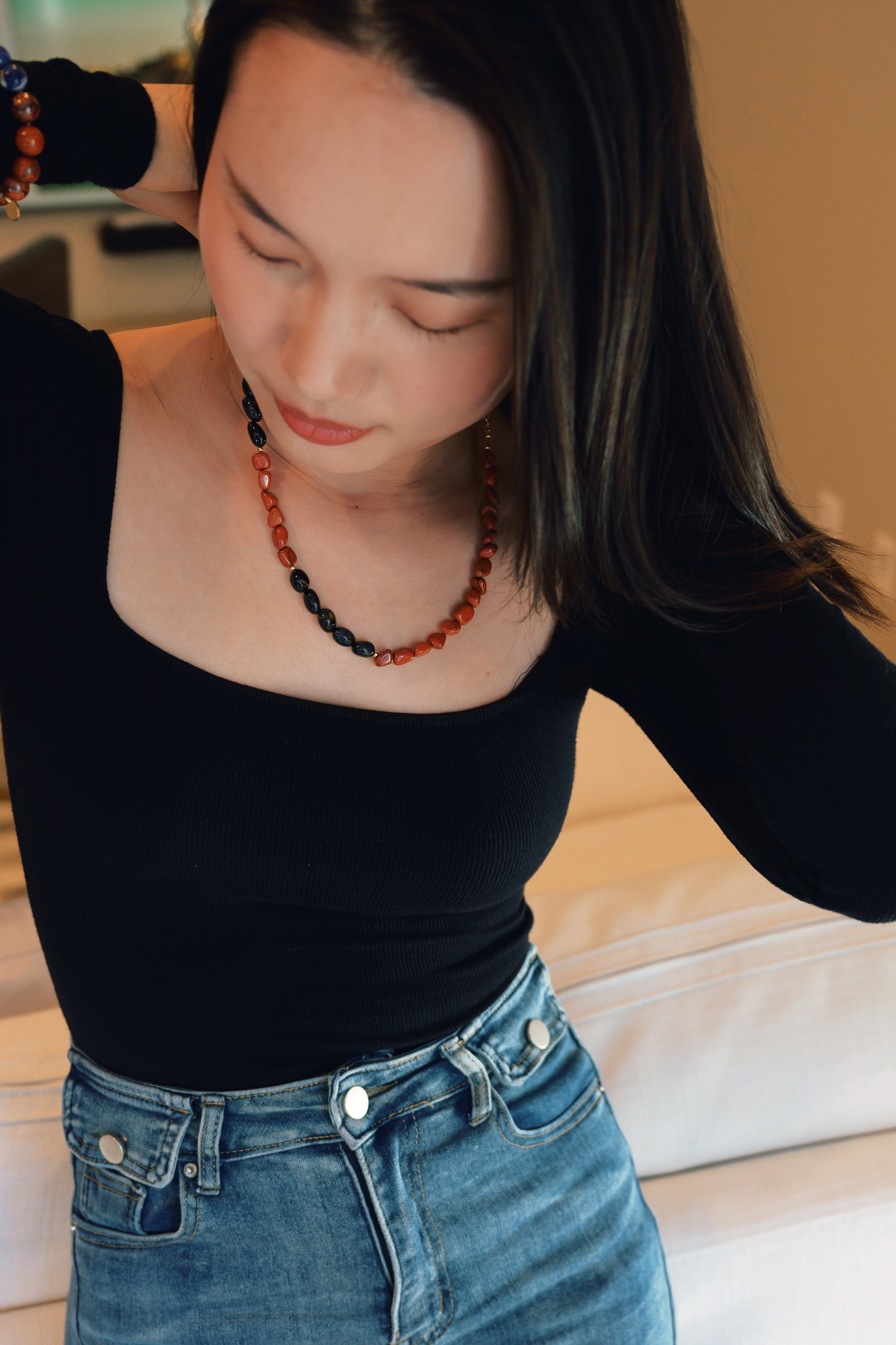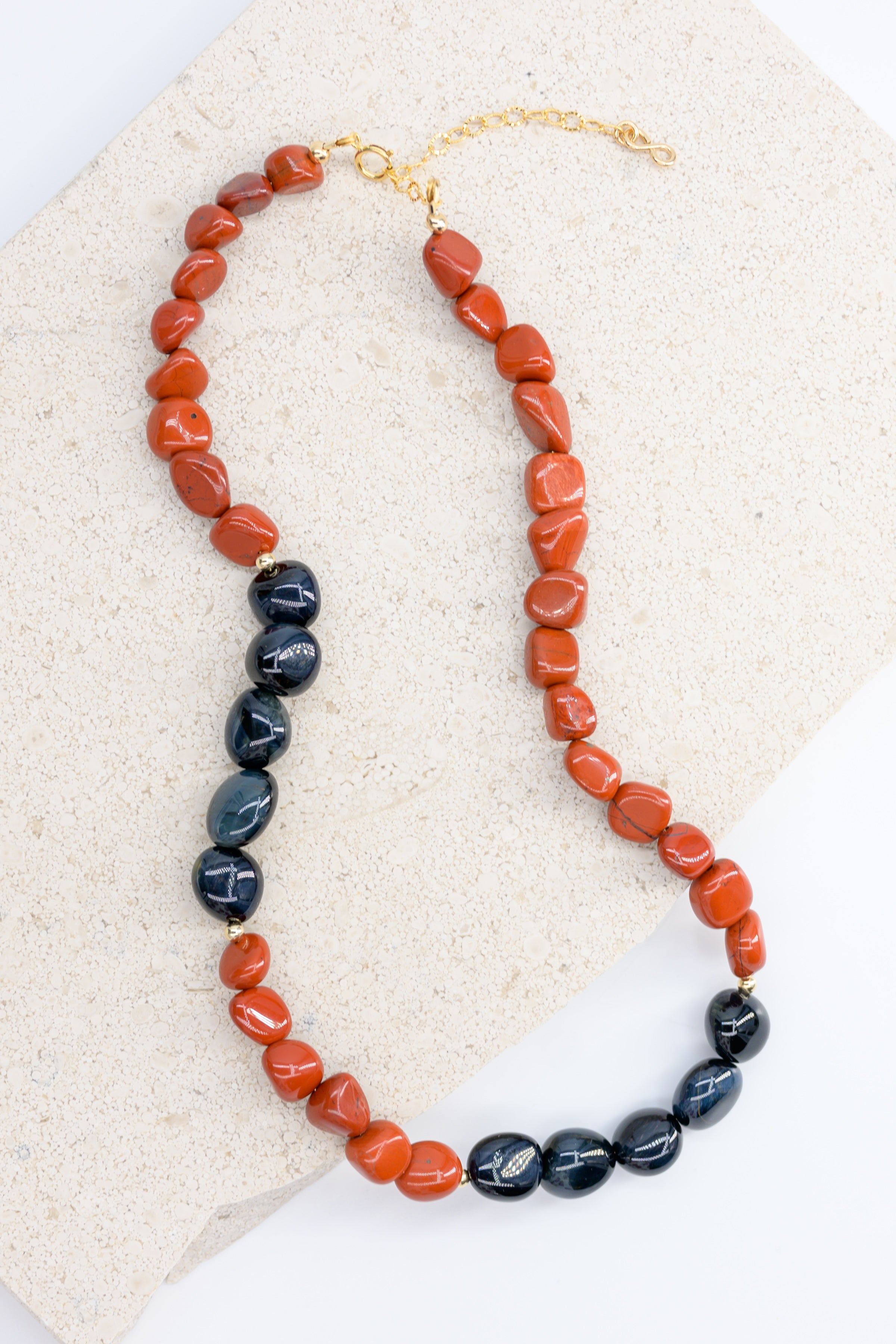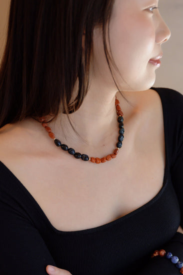 The Midnight Spark necklace combines the earthy warmth of Red Jasper with the deep, mysterious sheen of Blue Tiger Eye, each stone crafted in a striking nugget shape. Together, these gemstones evoke the glow of embers against the night sky, creating a harmonious balance of passion and tranquility. This necklace is an ideal piece for those who embrace both strength and elegance, carrying a subtle spark that ignites any look.