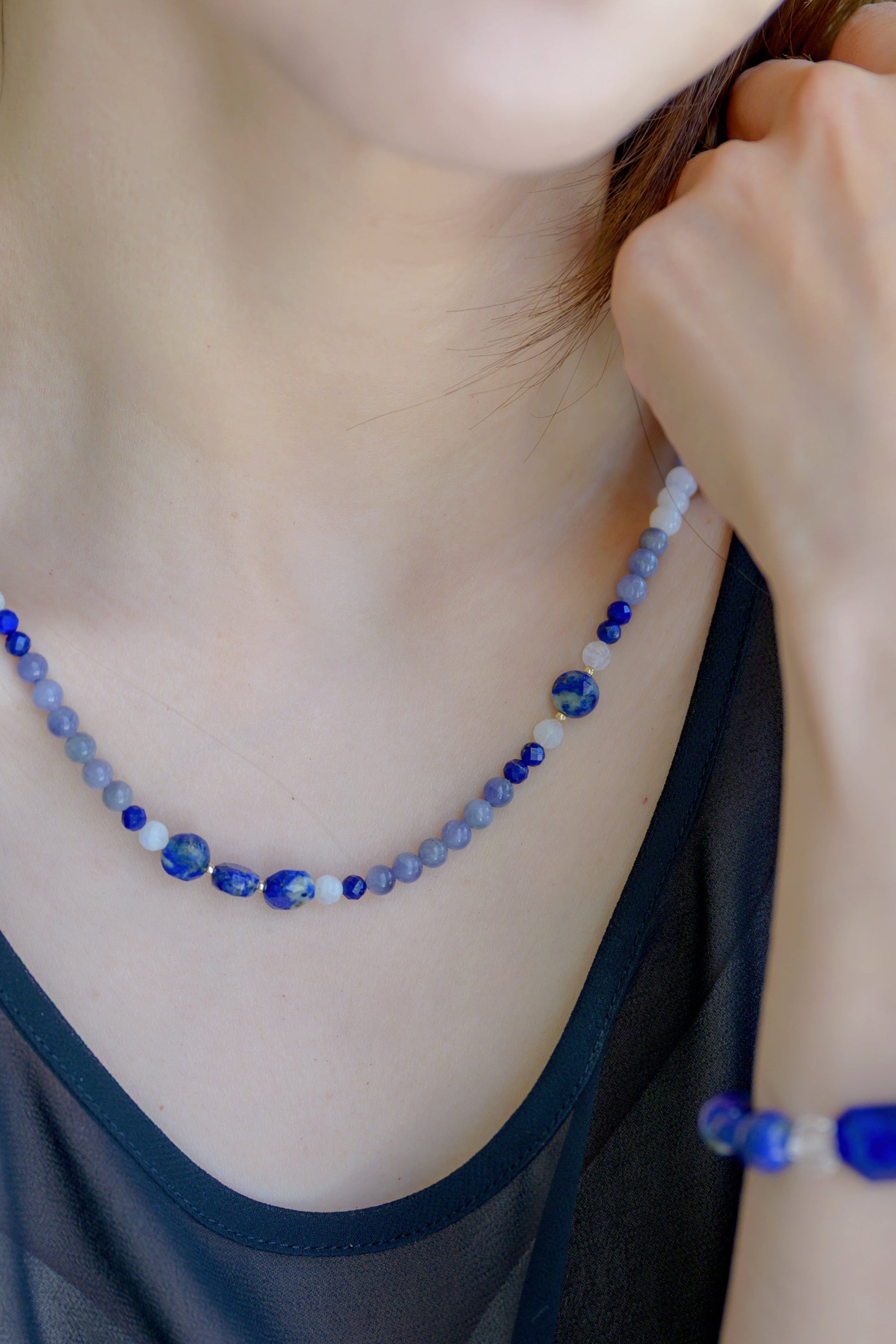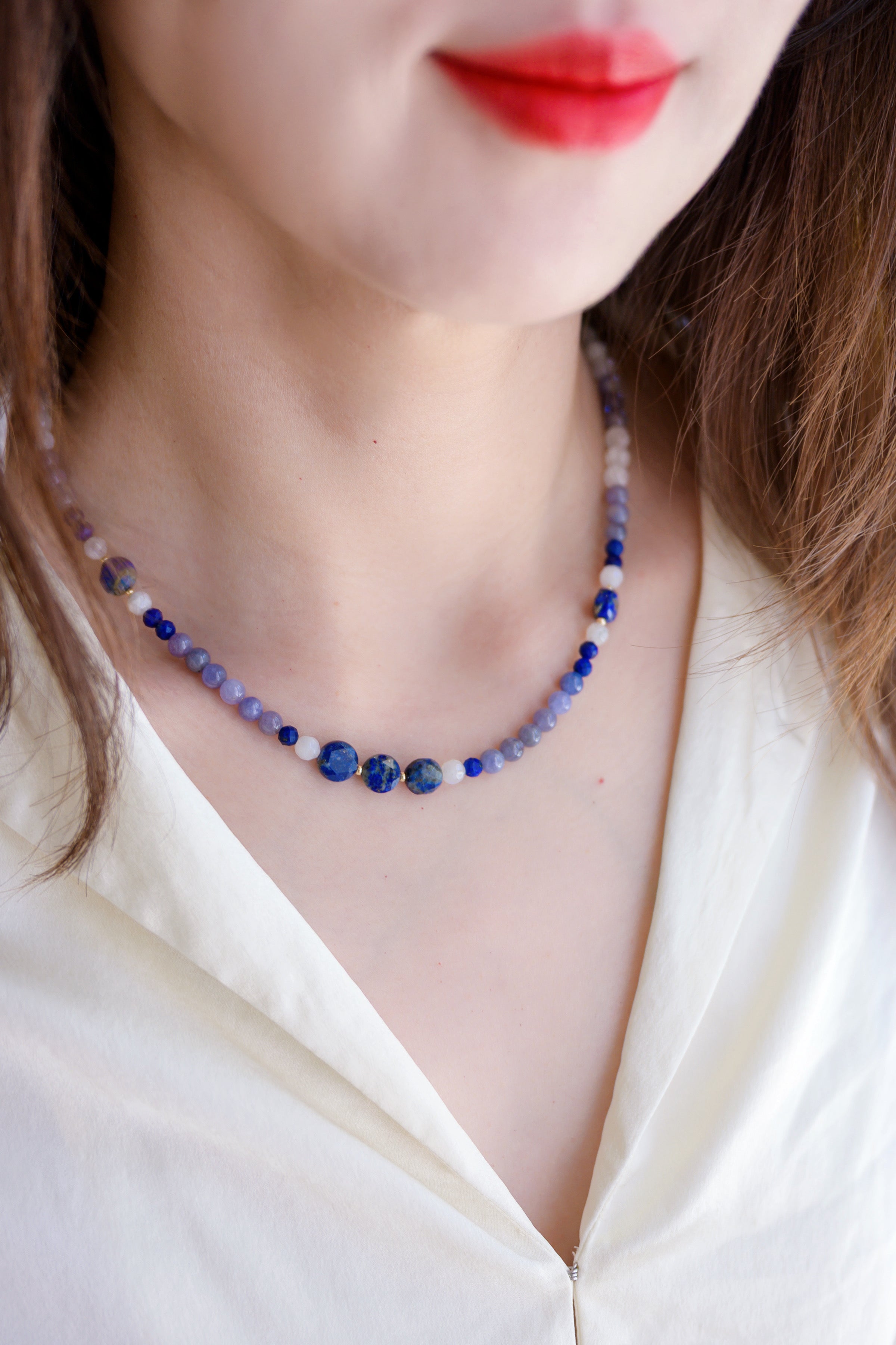 Moon Over the Bay necklace captures the serene beauty of a summer evening as moonlight dances across calm ocean waters. With the dreamy glow of white moonstone, the deep ocean blues of A-grade lapis, and the twilight elegance of tanzanite, this necklace evokes a peaceful moment by the shore—where the sky meets the sea, and every breeze carries a whisper of wonder.