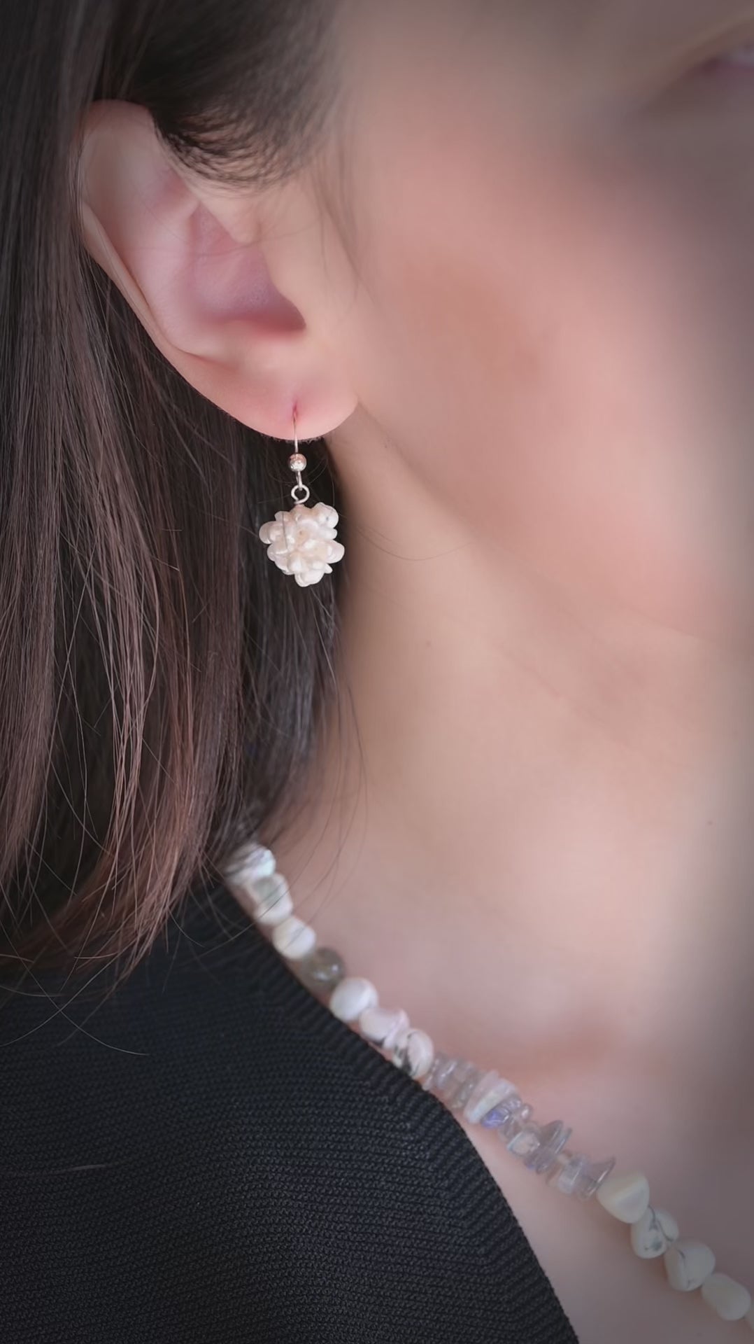 Each pair is delicately woven from White Freshwater Pearls, creating a dimensional floral silhouette that radiates gentle luminosity. The handwoven structure highlights the organic beauty of every pearl — each one unique, with its own subtle luster and rhythm of light.