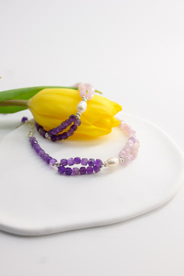 This exquisite bracelet artfully combines the soothing energies of Amethyst and the heart-opening vibes of Kunzite, centered around a singular, lustrous Freshwater Pearl, symbolizing purity and wisdom. Drawing inspiration from the Periwinkle, known for its enduring vitality and serene beauty, this piece embodies the spirit of renewal and everlasting affection.