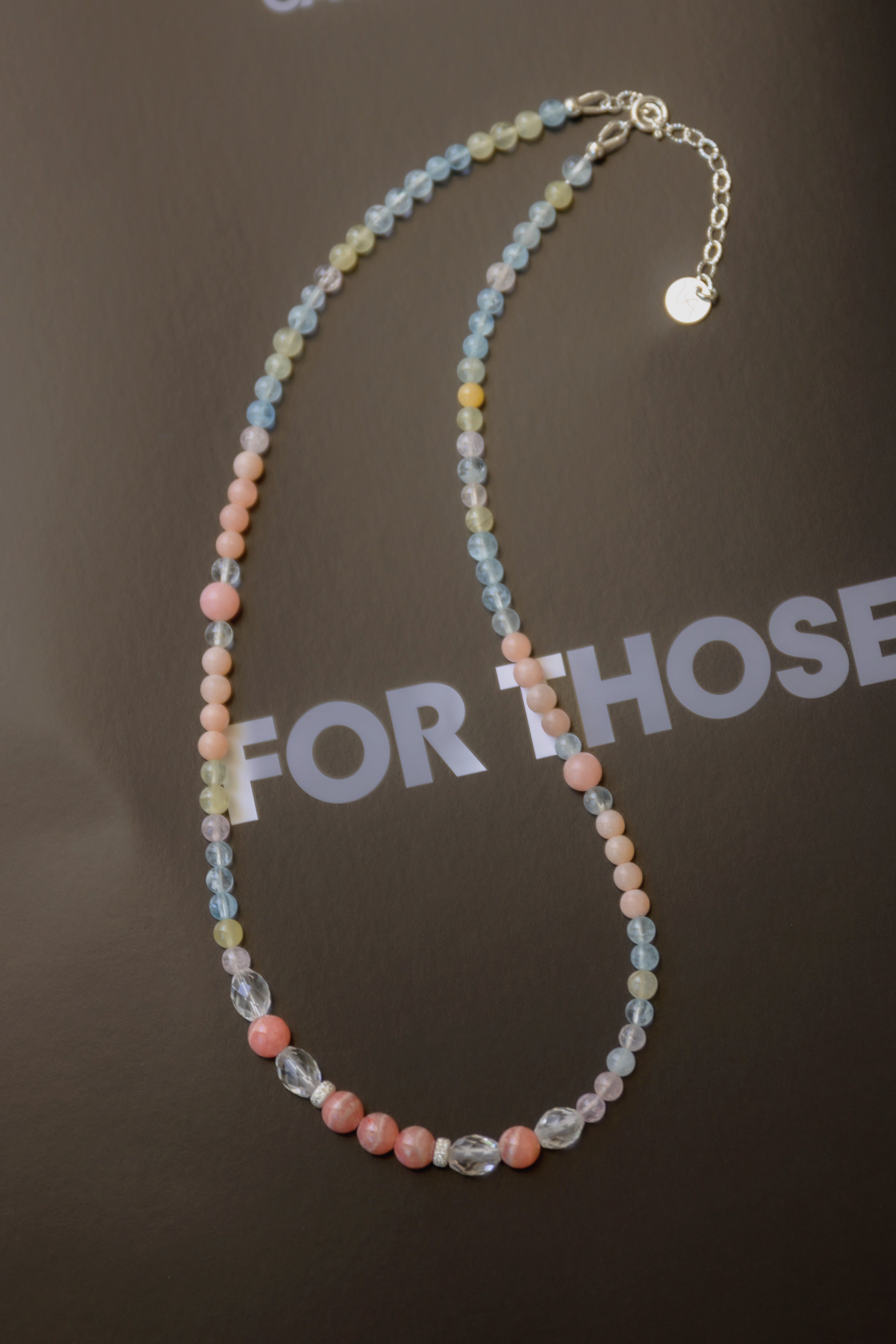 Petal Whispers is a delicate summer reverie captured in gemstone form. Soft hues of Multi Beryl, tender Rhodochrosite, and blush-toned Pink Opal come together like scattered petals on a warm breeze—whispering grace, femininity, and the quiet joy of a sunlit bloom. Light and airy, this necklace evokes the feeling of a serene garden stroll, where every step is filled with warmth and wonder.
