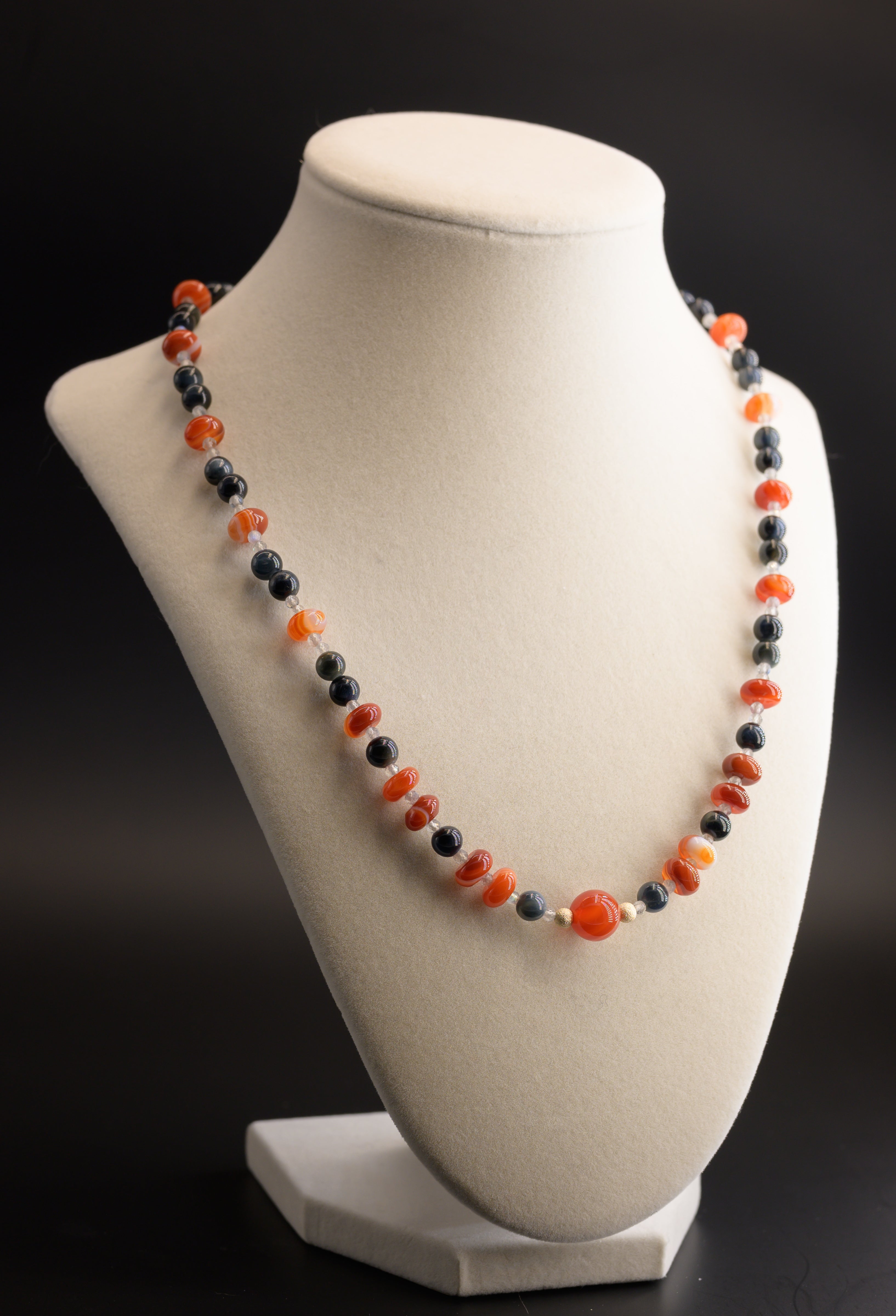 Each Blue Tiger Eye bead brings forth calm and insight, entwined harmoniously with the passionate vitality of Carnelian and the mystical aura of Labradorite.