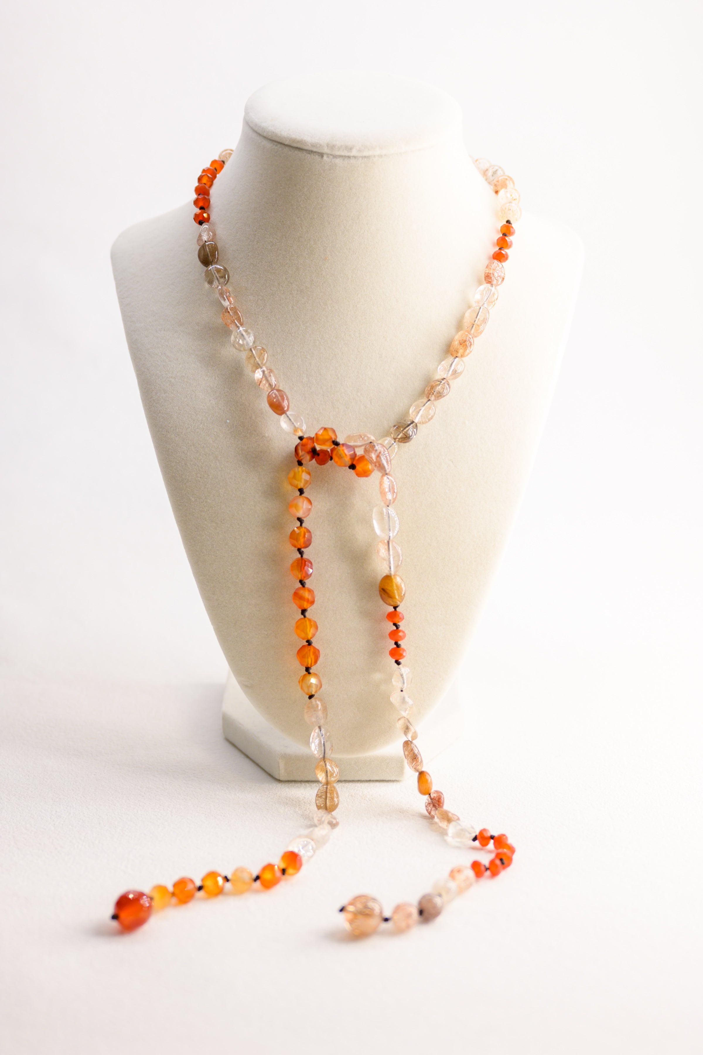 Tie or loop it with a longer drop, creating a ribbon-like silhouette. The gemstones sparkle gracefully along the line, adding elegance to sweaters, dresses, or simple blouses.