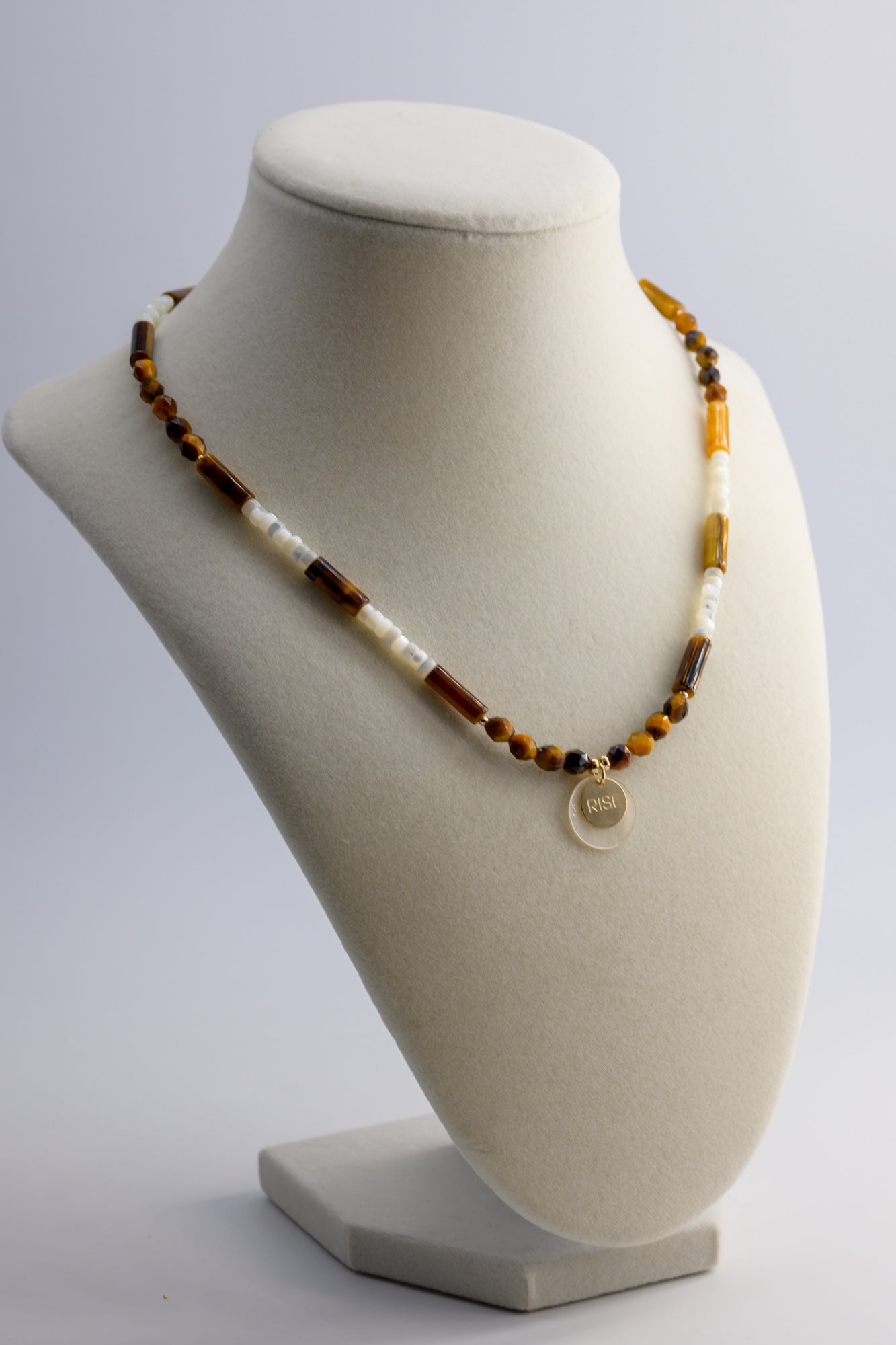 This radiant necklace features the warm glow of tiger's eye and the iridescent shimmer of mother-of-pearl heishi beads, capturing the subtle gleam of light reflecting off a coral reef. Accentuated by a Capiz Shell Coin and a signature logo pendant, the design evokes the beauty and mystery of underwater treasures. Perfect for those who are inspired by the ocean's natural brilliance and elegance.