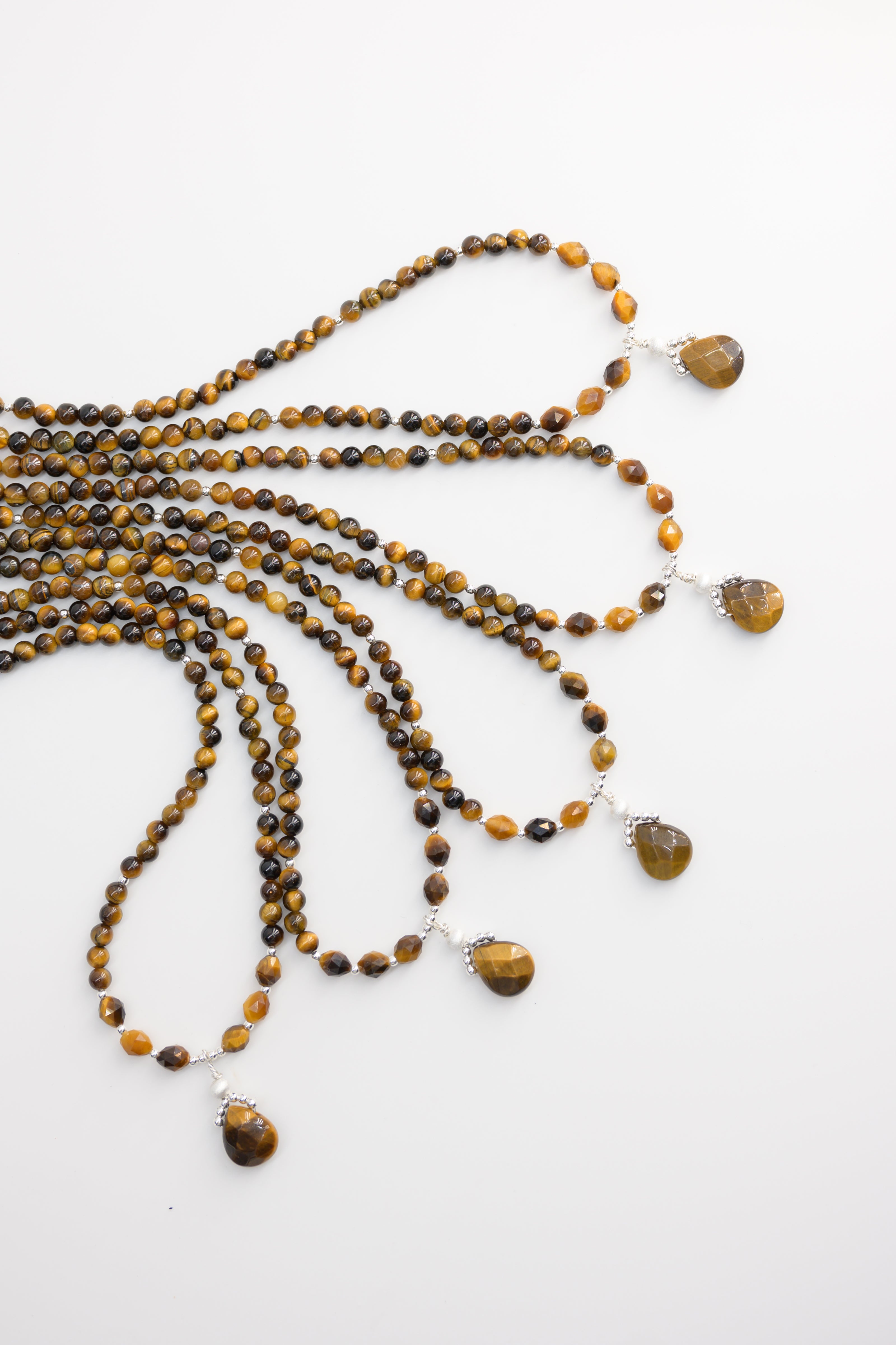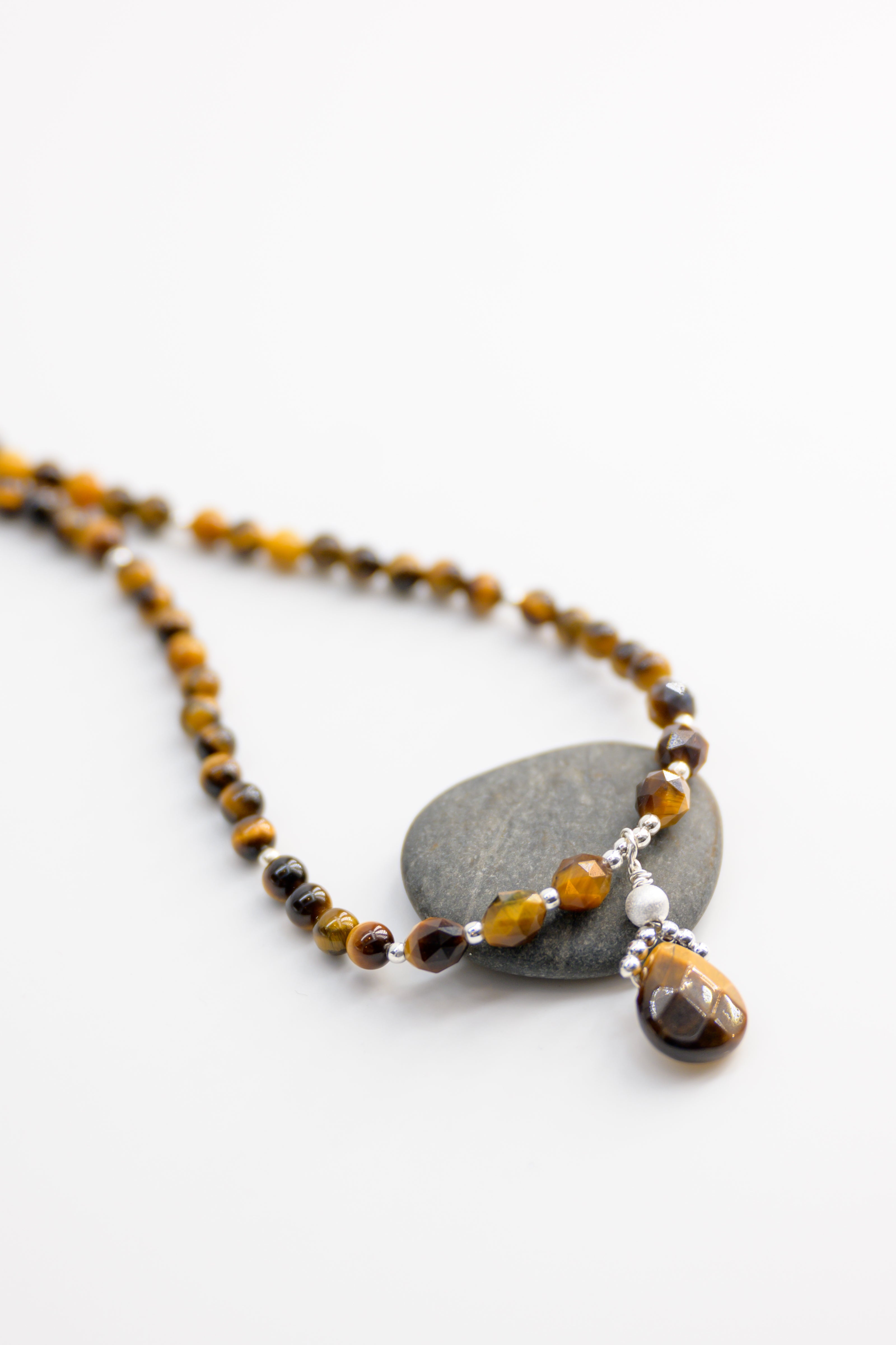 This bold necklace features round and rice-shaped tiger's eye beads, complemented by a striking pearl-shaped tiger's eye pendant, symbolizing the courage and strength found in the sea's depths. The rich golden hues of tiger's eye reflect bravery and resilience, capturing the essence of facing life's challenges head-on. A perfect piece for those who embrace the fearless spirit of the ocean.