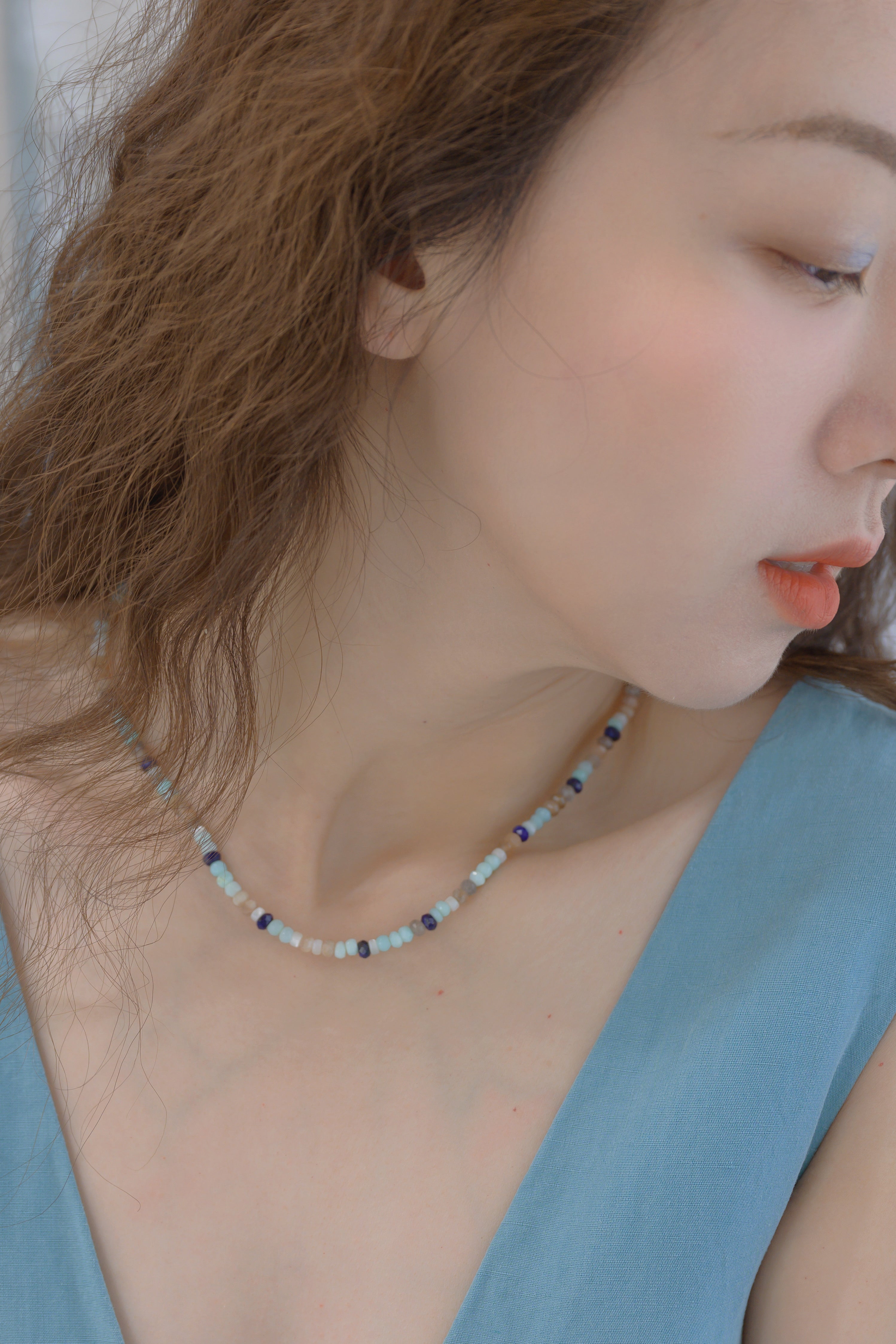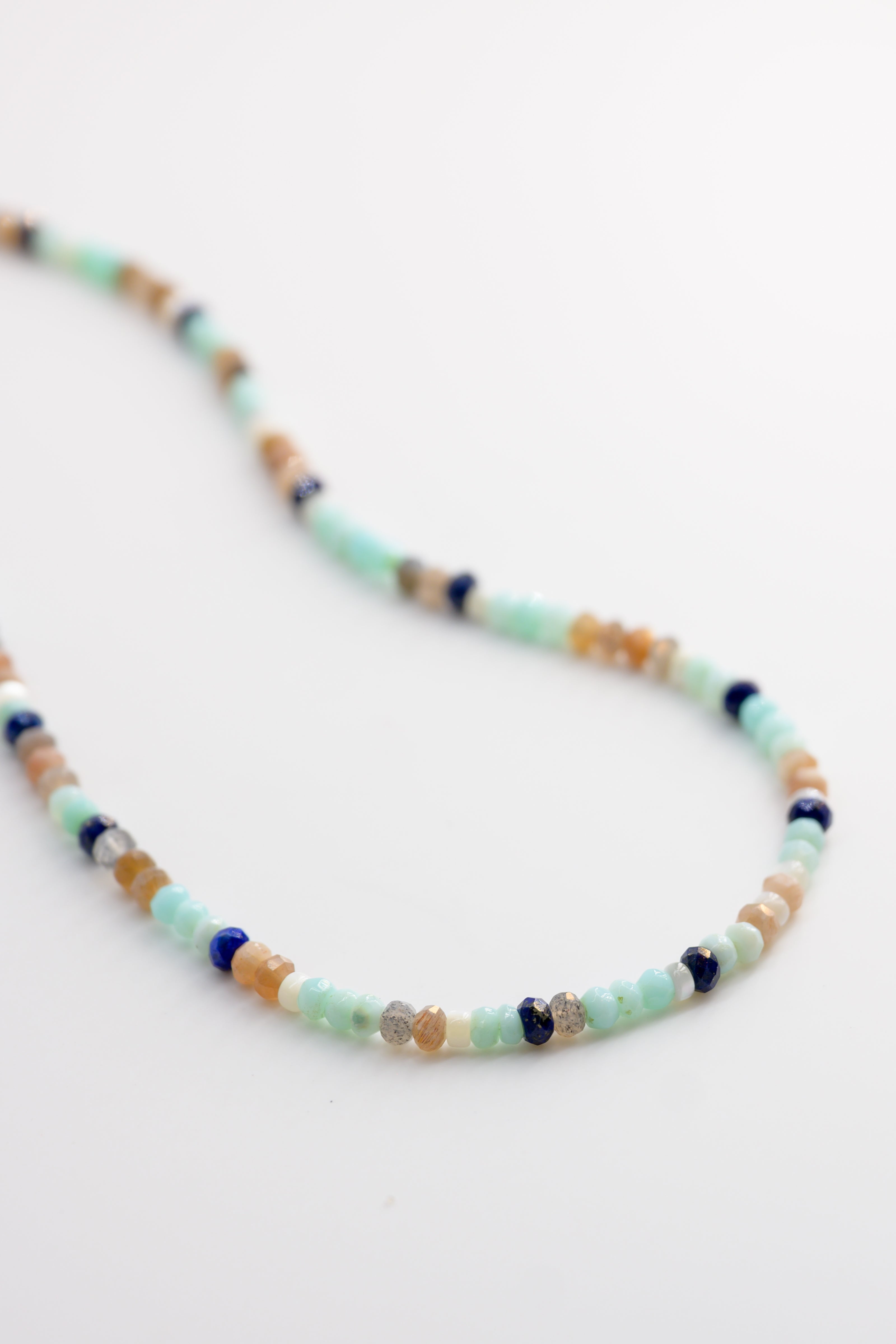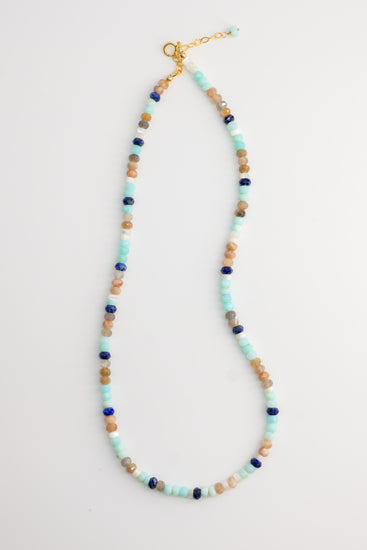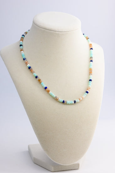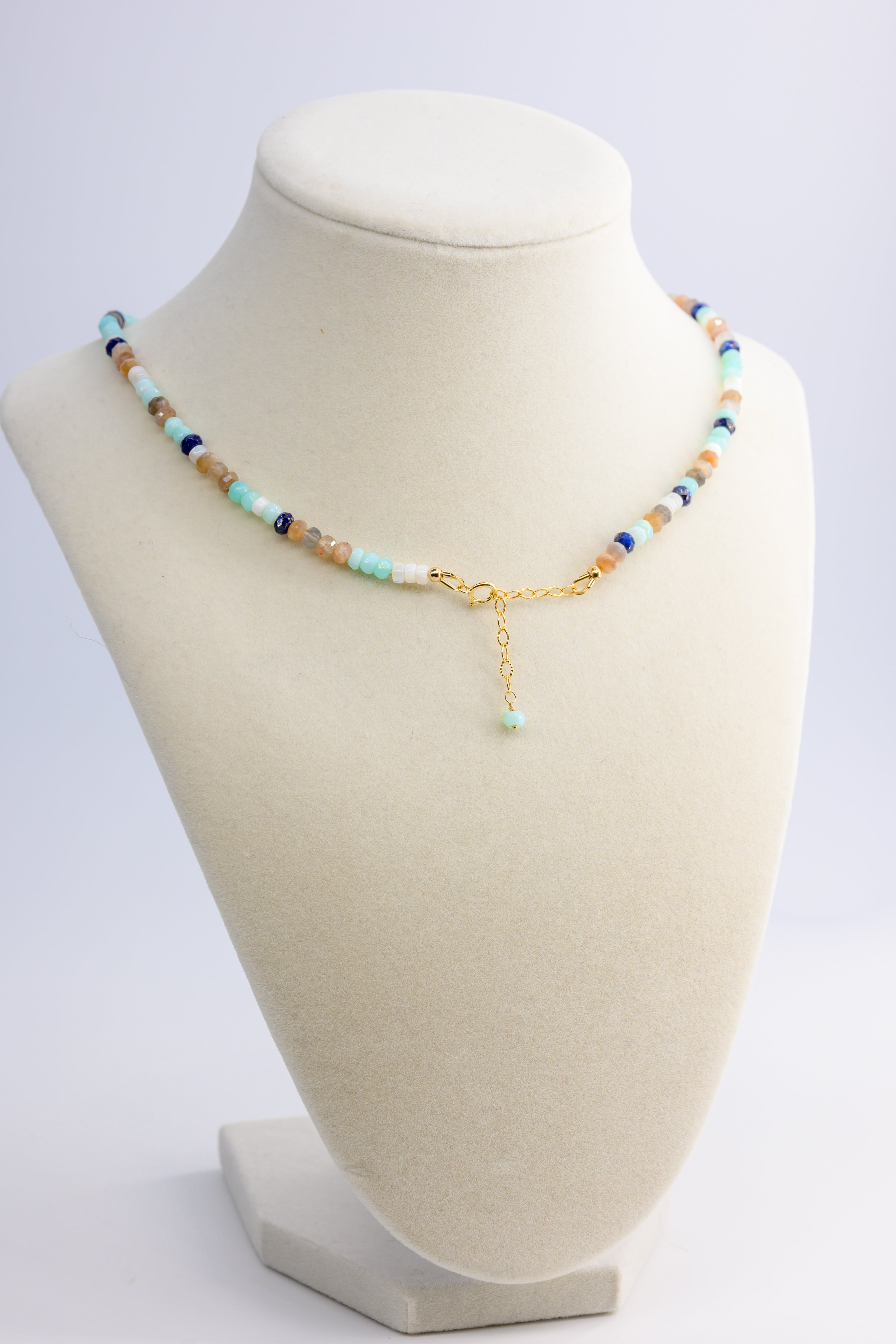 This elegant necklace combines the soft hues of Peruvian Opal and the glowing iridescence of Moonstone with the deep blue of Lapis, evoking the harmonious rhythm of the sea. Accented with mother-of-pearl heishi beads, it reflects the ebb and flow of ocean tides. A perfect piece for those who seek to carry the tranquil and timeless beauty of the ocean with them.