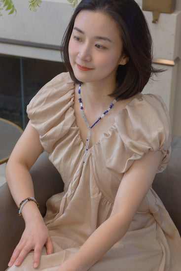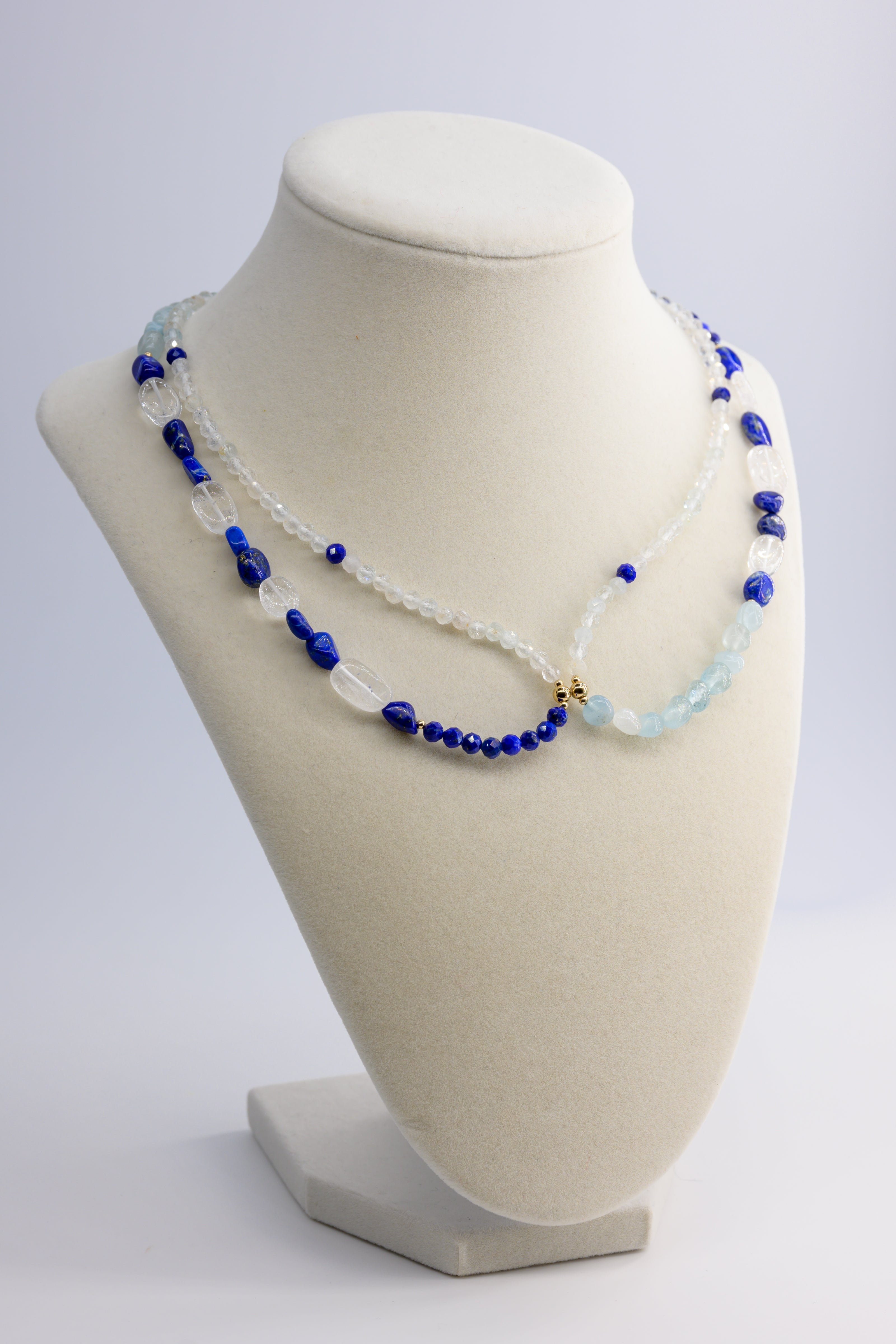 This versatile necklace, inspired by the refreshing Seabreeze, features radiant Topaz, deep Lapis, clear Rock Crystal, and serene Aquamarine beads, each capturing the essence of the ocean's ever-changing beauty. With seven different wearing options, it transforms effortlessly to suit any occasion, from a single strand to a layered wrap. Whether worn long or short, this piece embodies the calm and elegance of a coastal breeze.