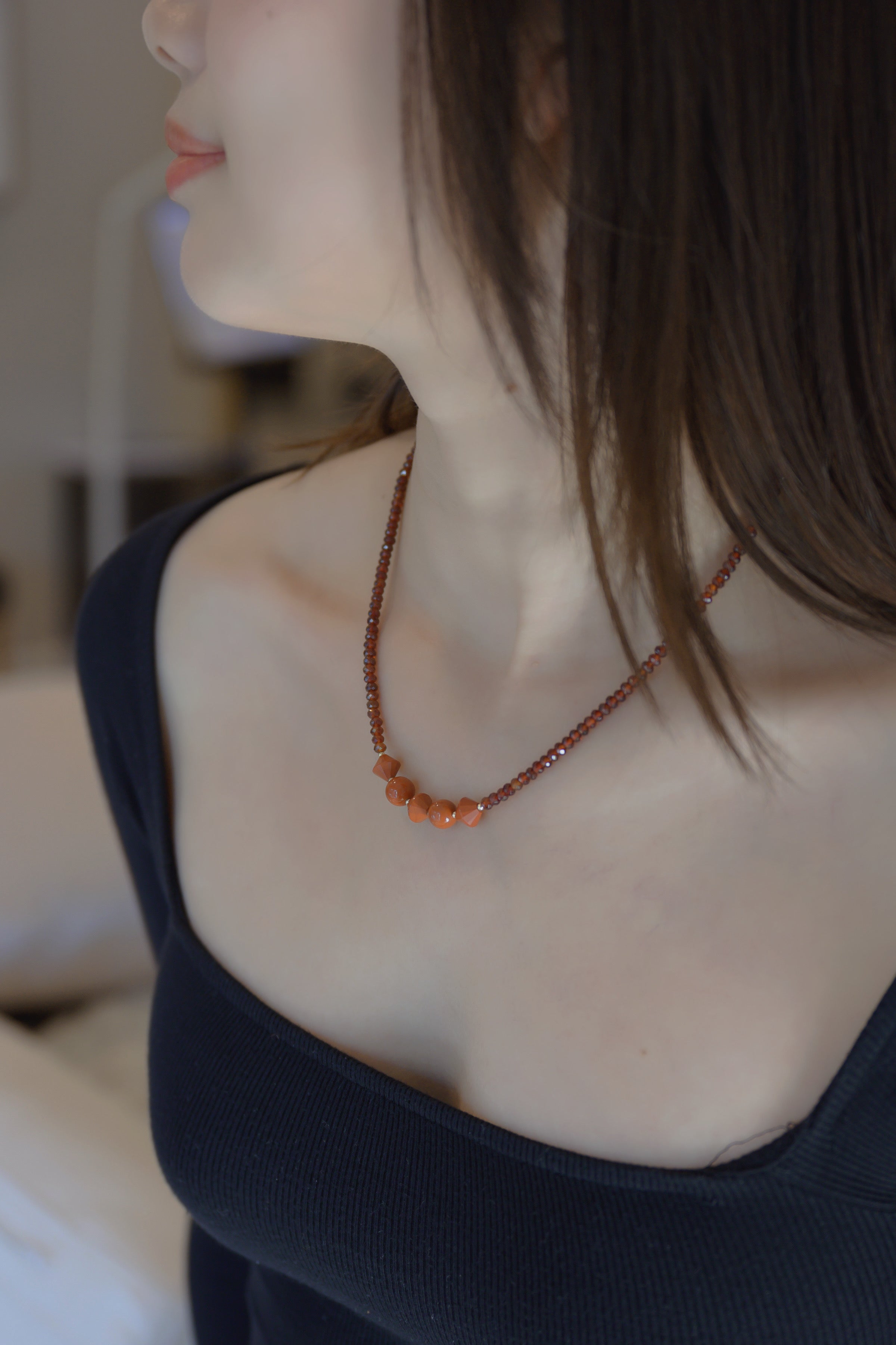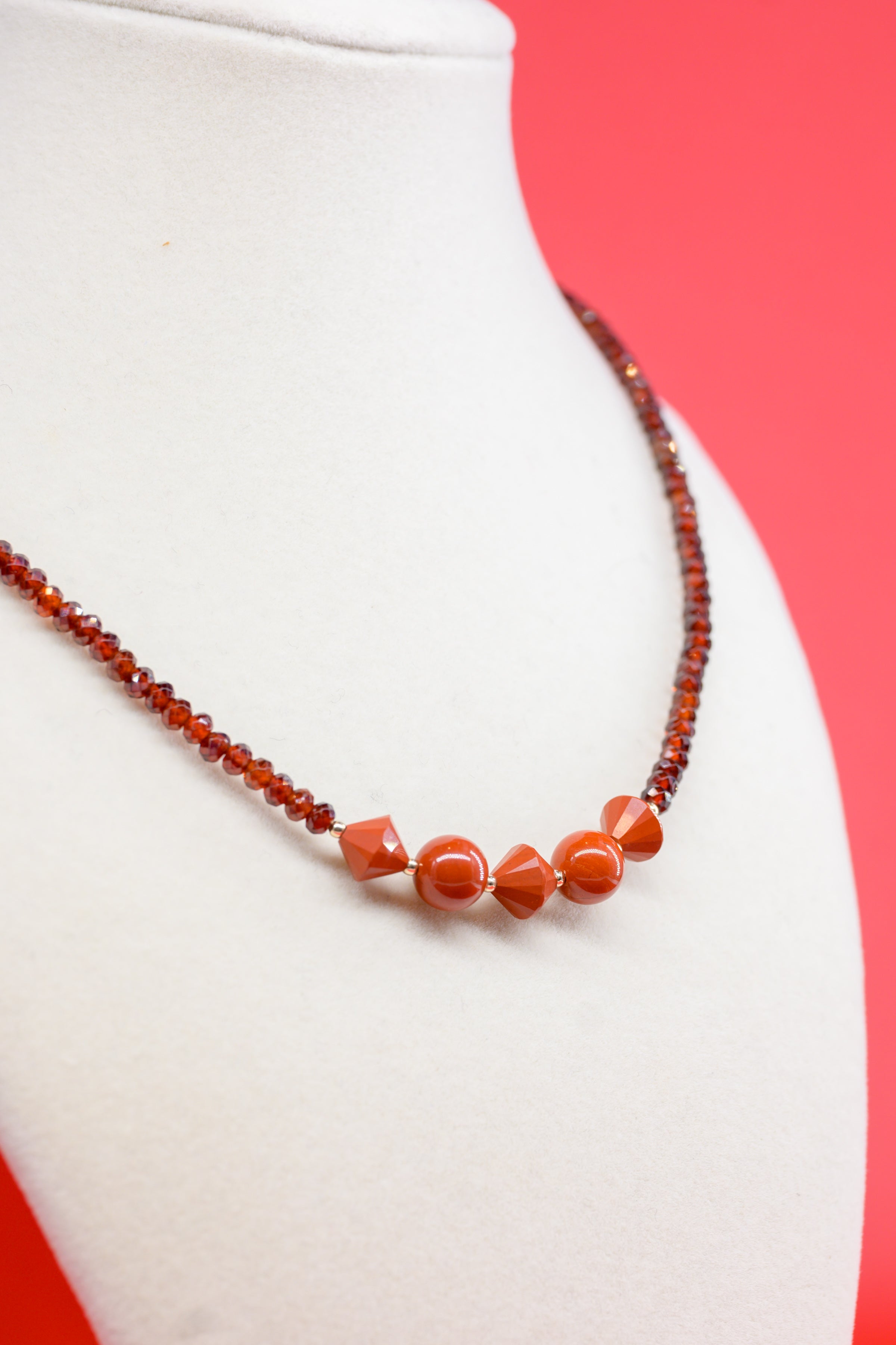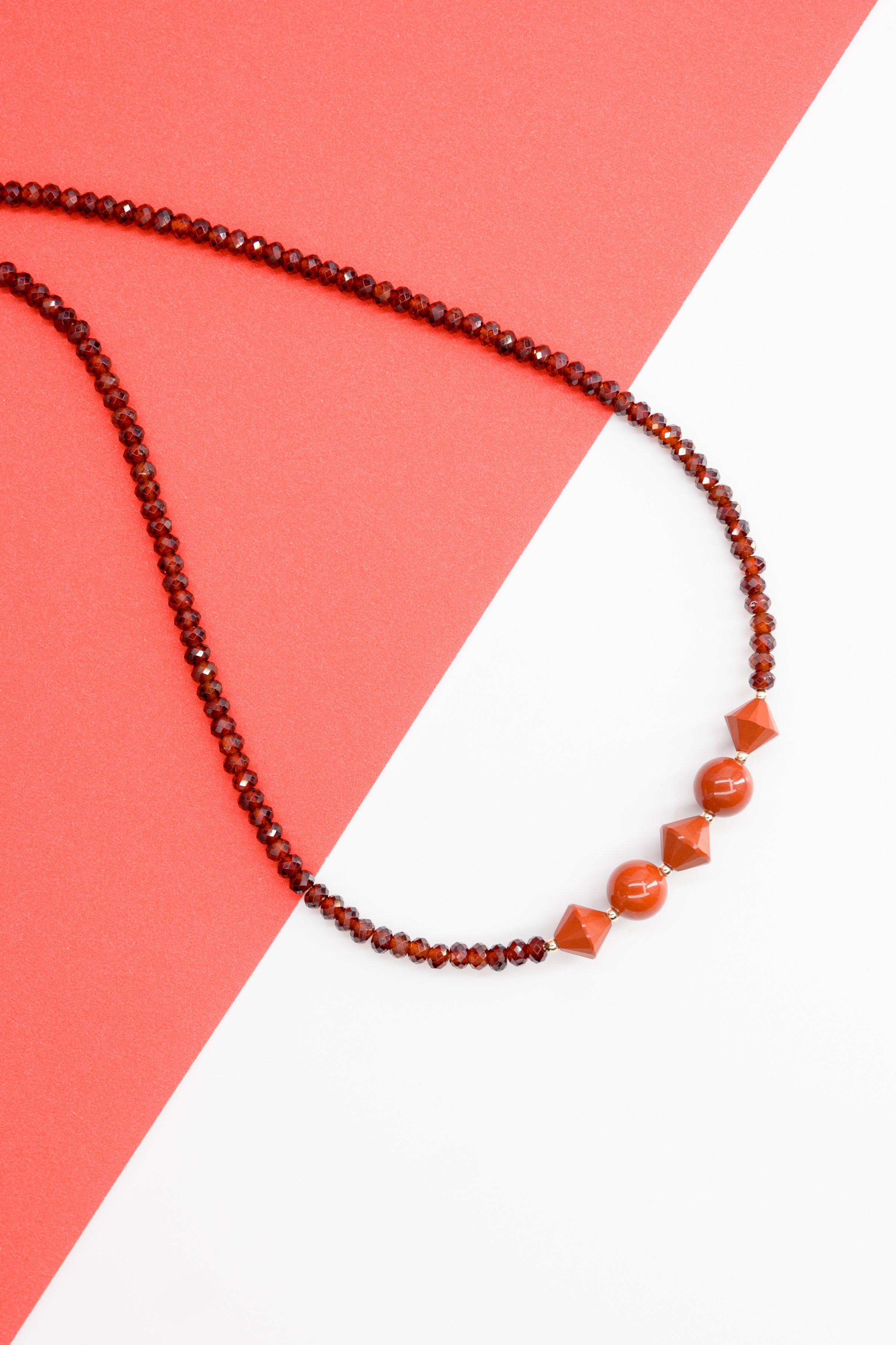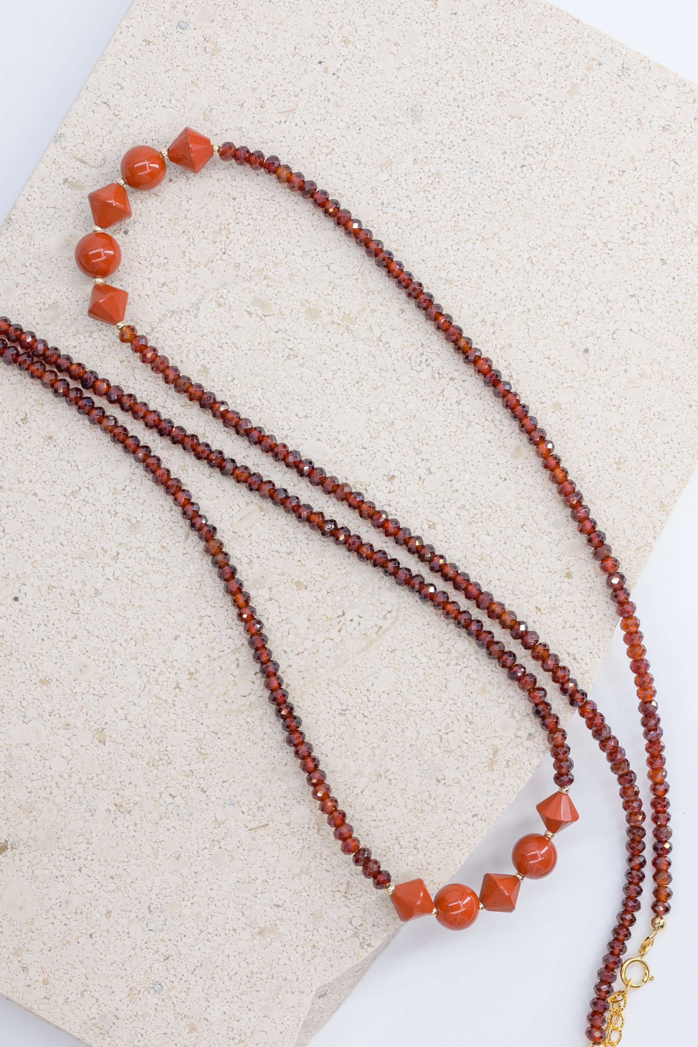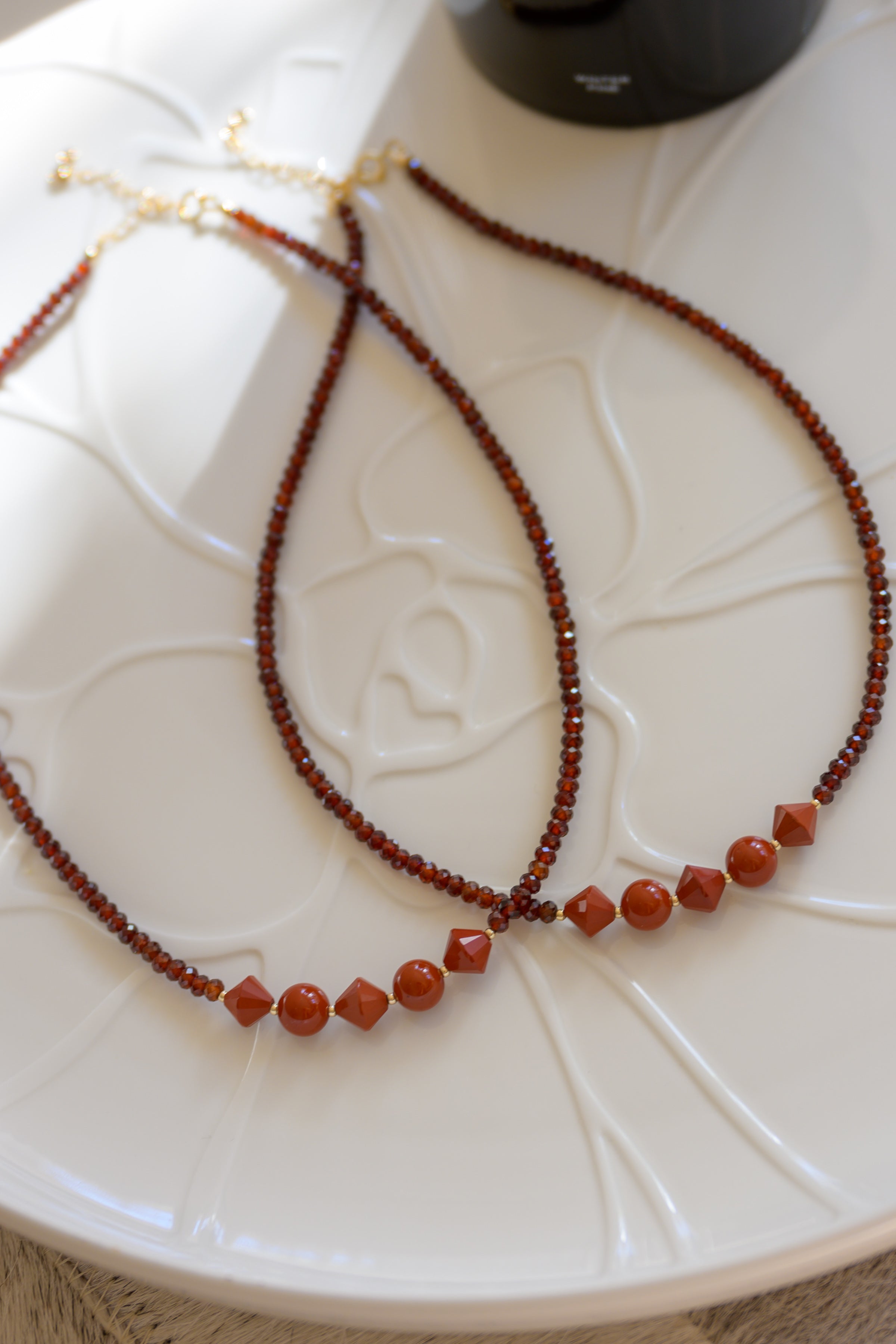 The Searing Spark necklace captures a fiery elegance with five bold, bicone-shaped Red Jasper beads at its center, radiating strength and warmth. Paired with the rich amber glow of Hessonite, this piece brings together the grounding energy of Red Jasper and the vibrant warmth of Hessonite in perfect harmony. Ideal for those who desire a striking, passionate accent, this necklace ignites any look with its unique, radiant design.
