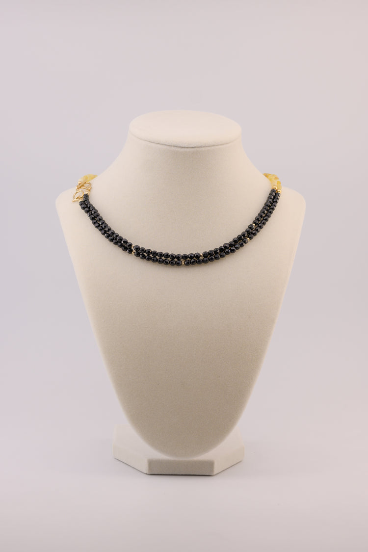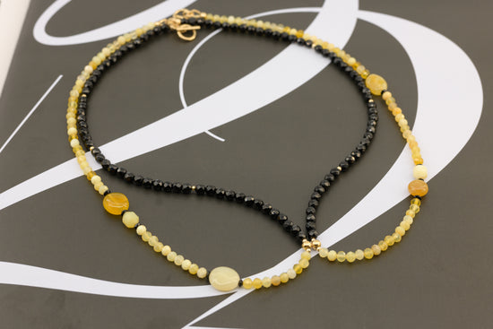 Stunning gemstone necklace featuring Yellow Opal, Onyx and 14k gold beads with 14k gold filled toggle clasps.