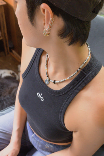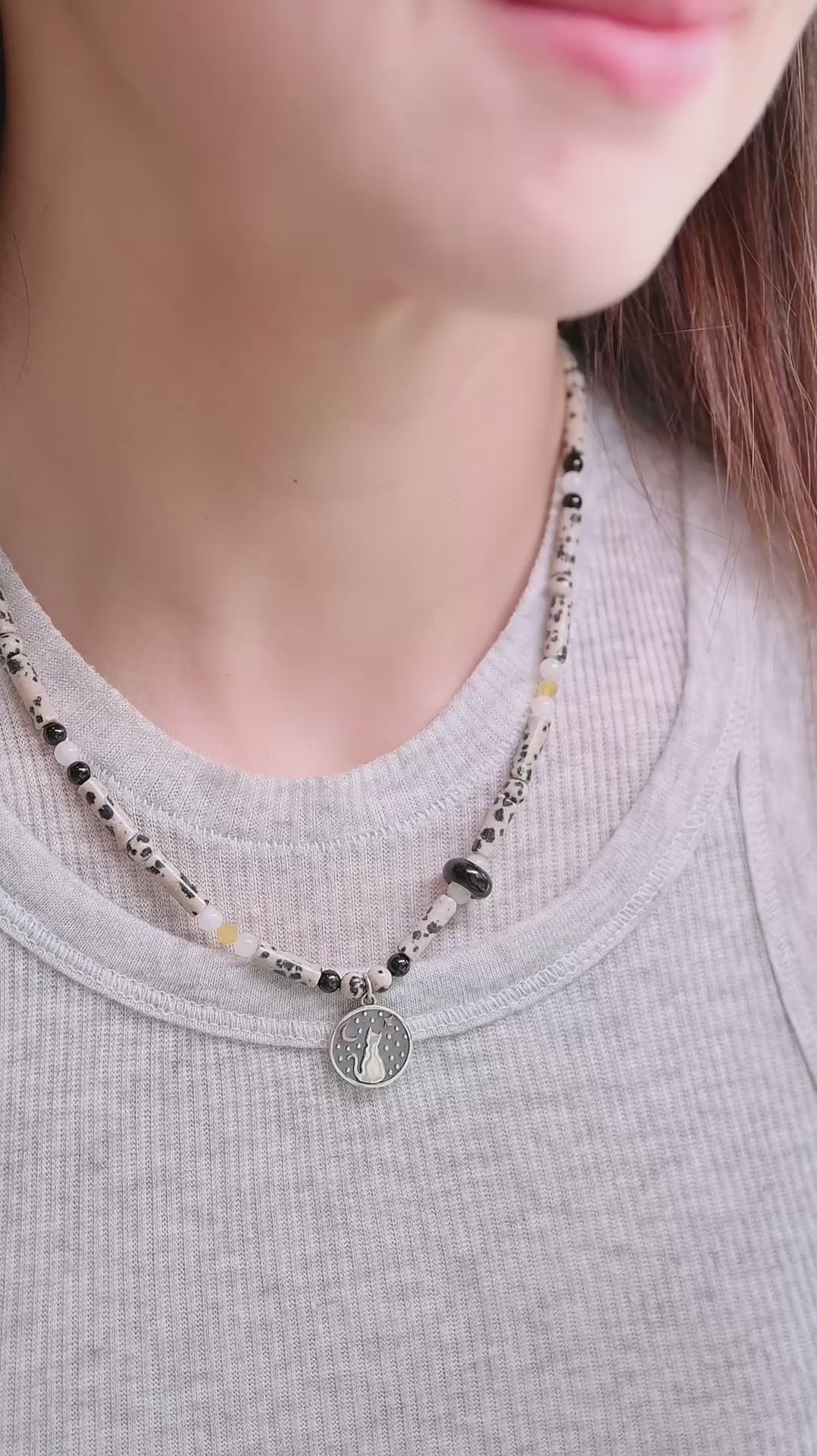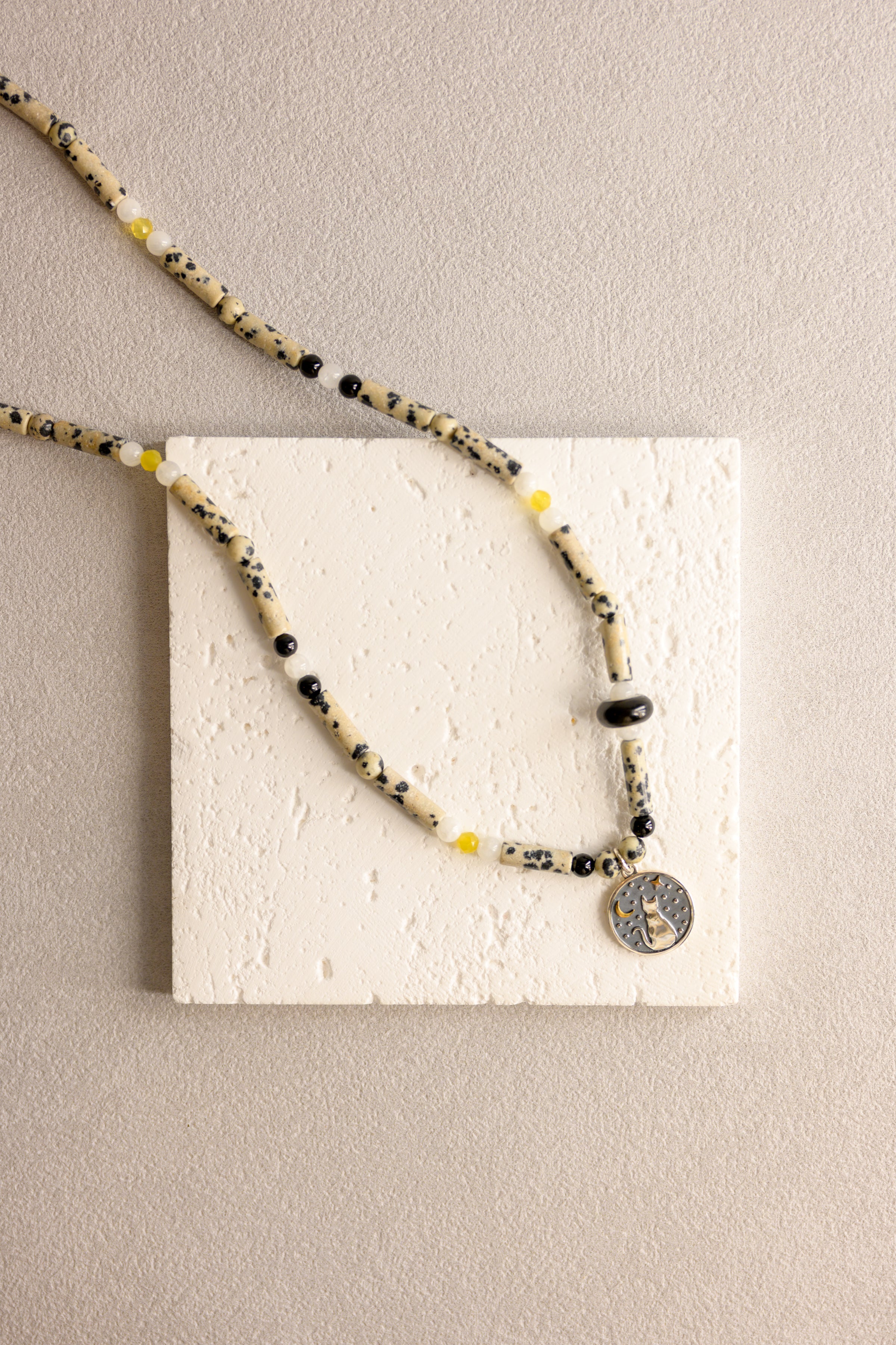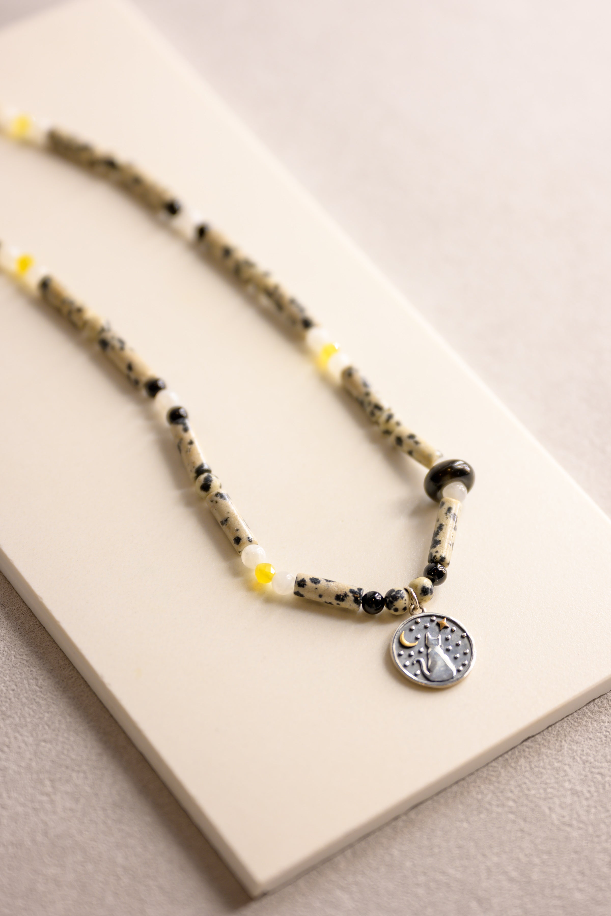 Starlit Meow Charm Necklace | Dalmatian Jasper Yellow Opal Black Onyx Moonstone