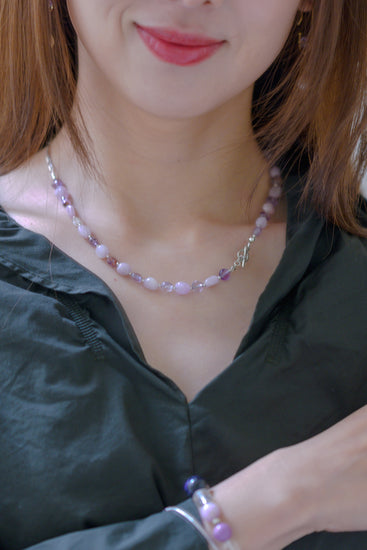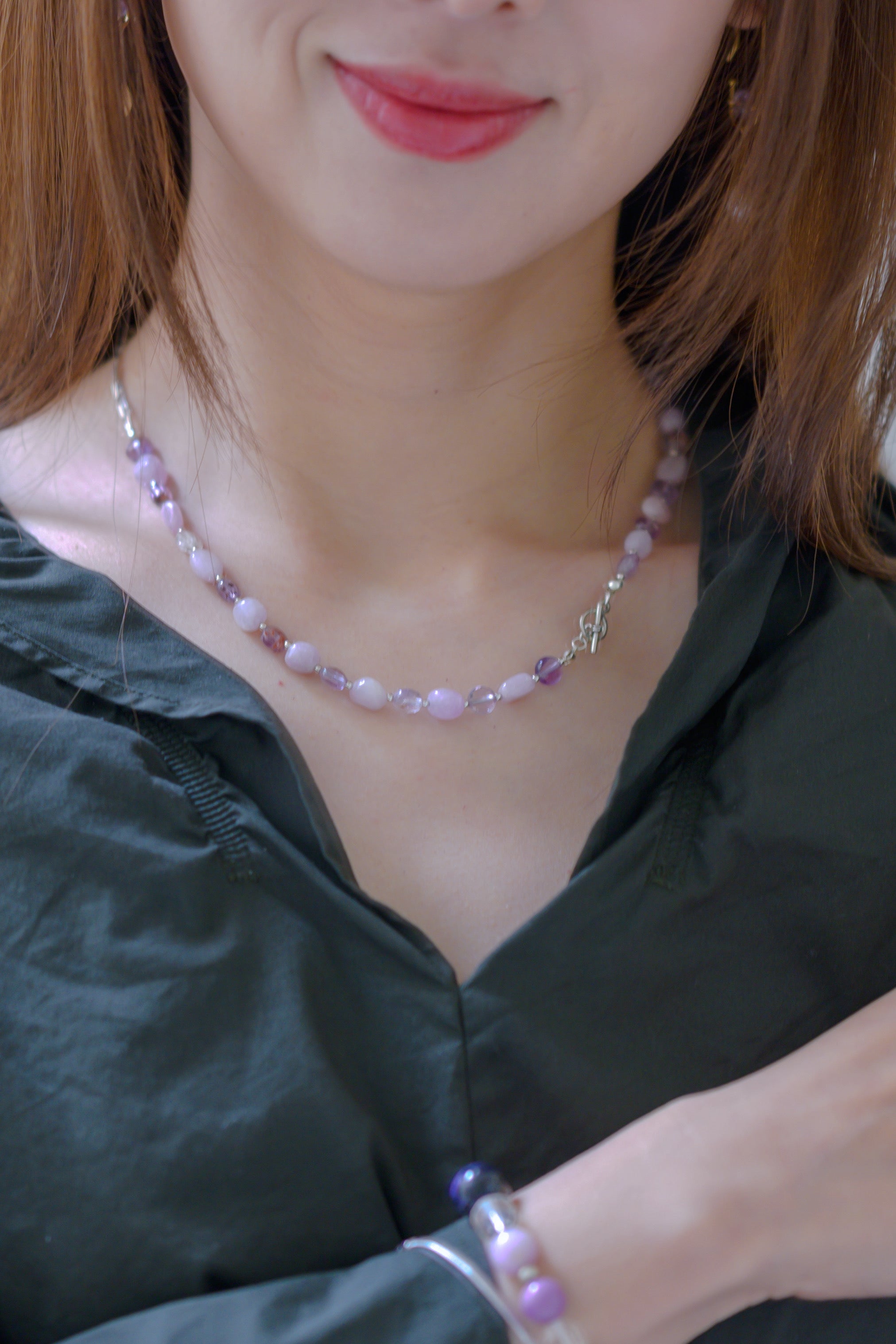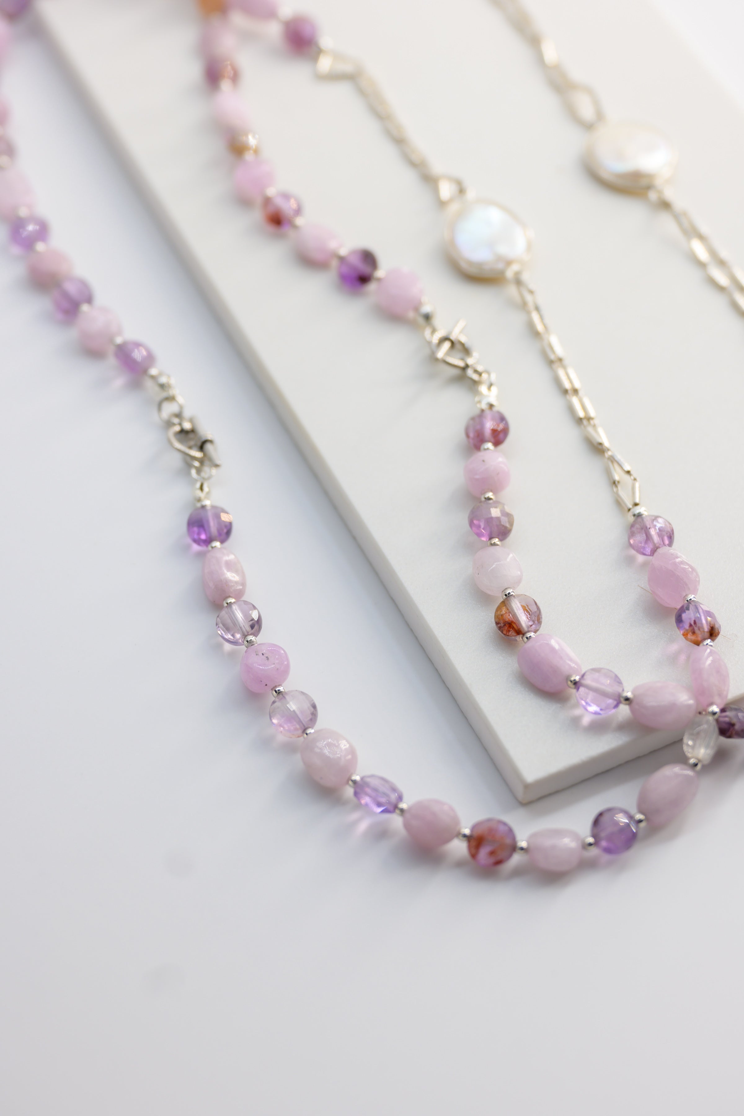 This distinctive necklace marries the gentle, heart-opening energy of Kunzite with the deep spiritual awakening properties of Purple Phantom Quartz (Auralite-23), connected through an elegant freshwater coin pearl that symbolizes wisdom and purity. Drawing inspiration from the Thistle, a symbol of resilience and protection, this piece embodies the strength to overcome obstacles and the courage to guard one’s personal space.