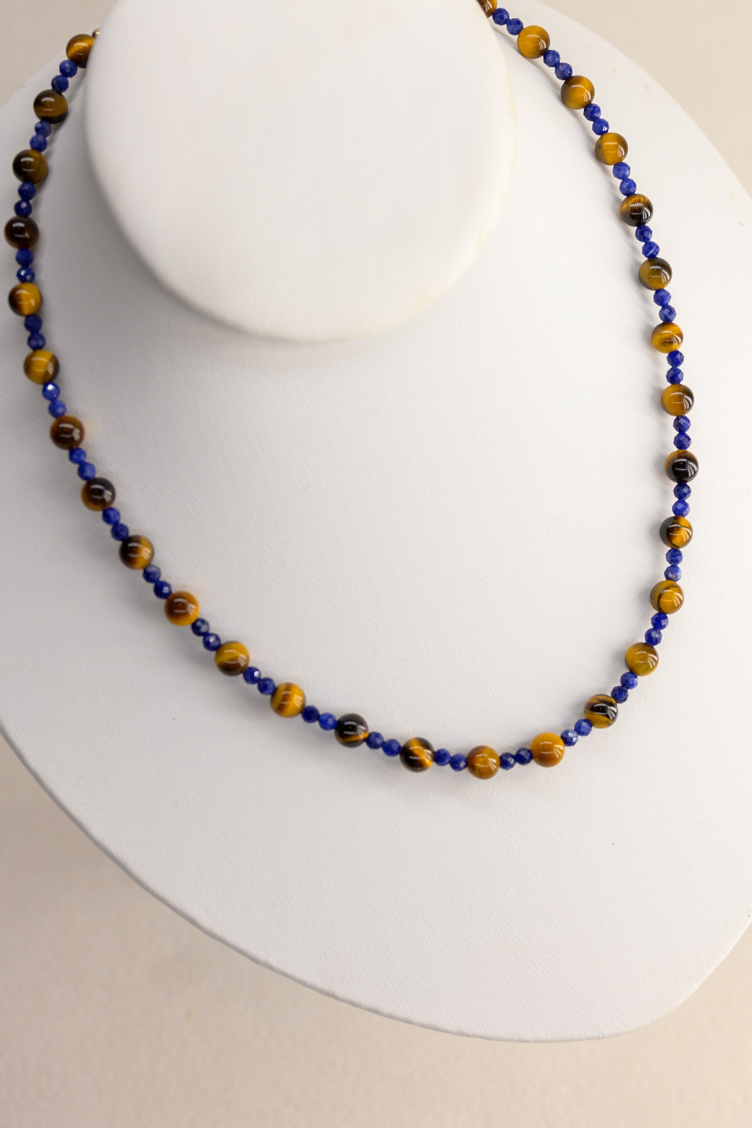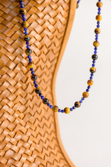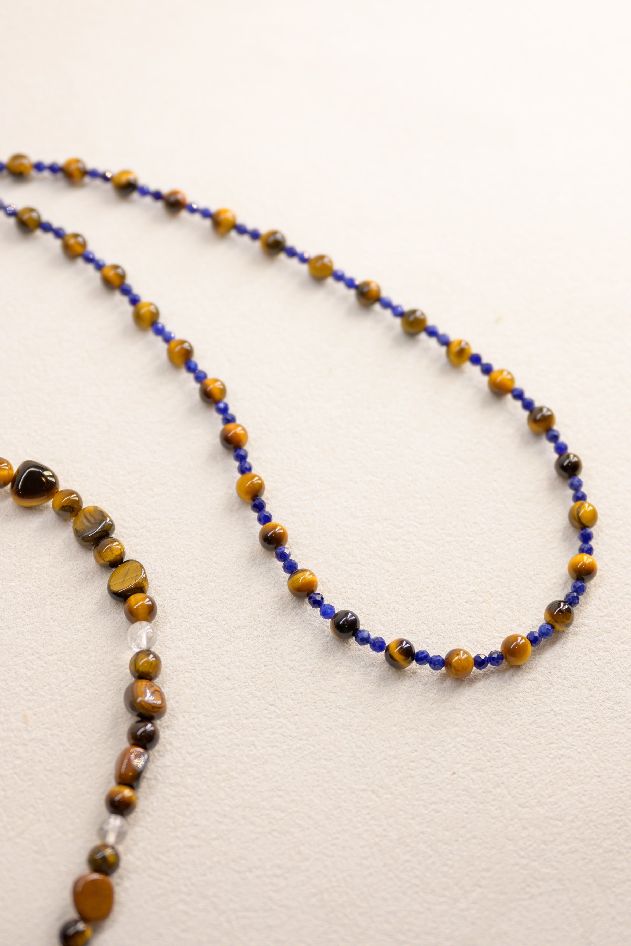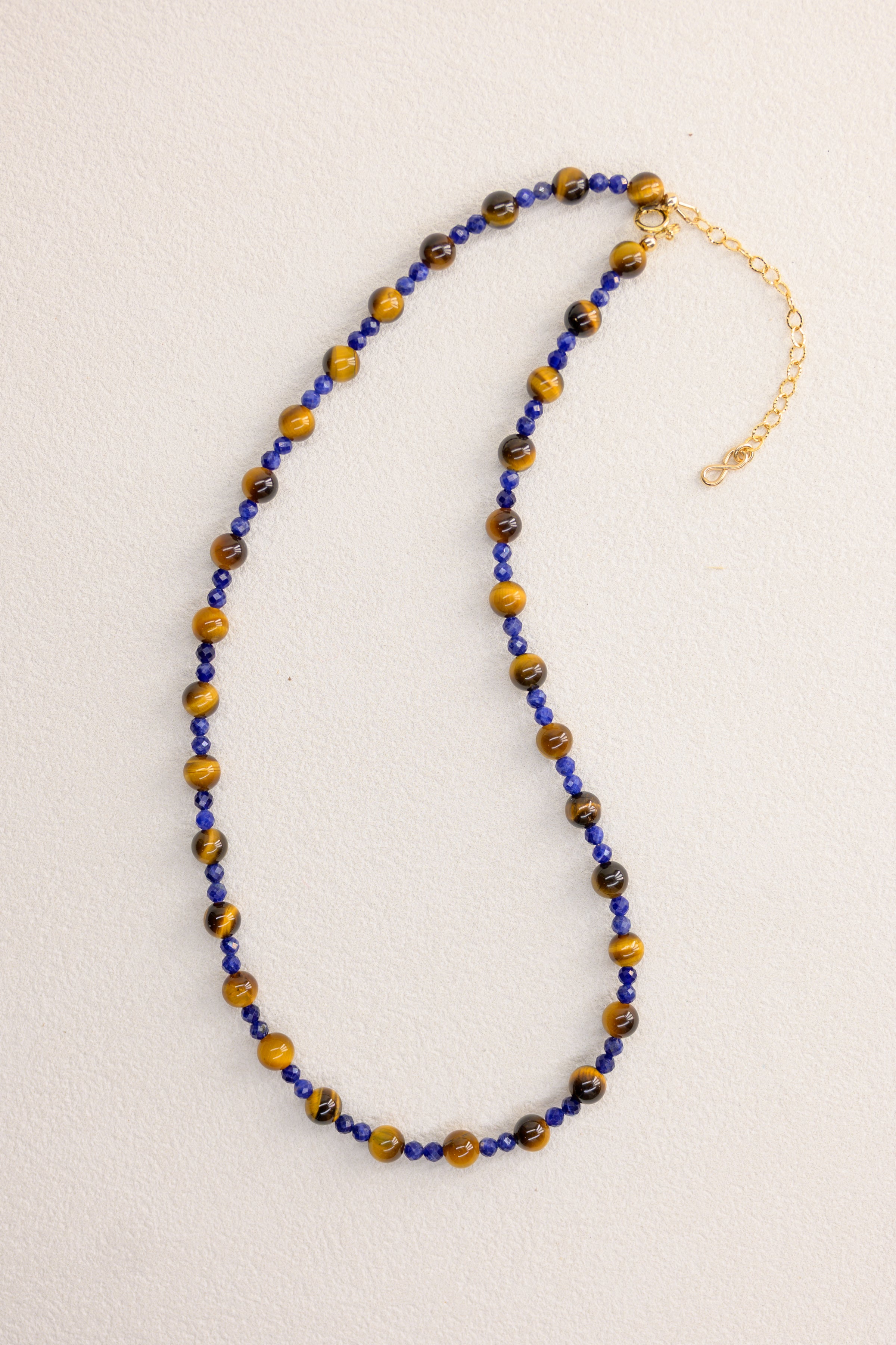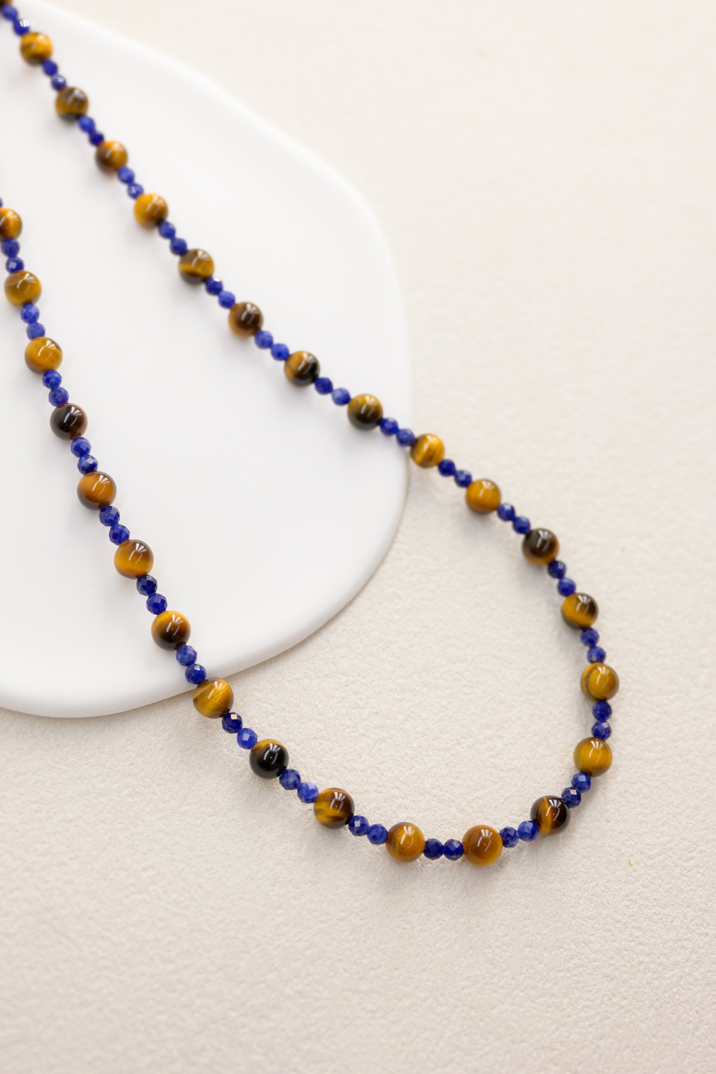 This striking necklace combines the bold strength of tiger's eye with the deep blue energy of sodalite, symbolizing the raw power of ocean tides. The rich golden and blue hues reflect the balance of grounding stability and fluid motion, capturing the dynamic force of the sea. Perfect for those who resonate with the strength and rhythm of nature's tides.