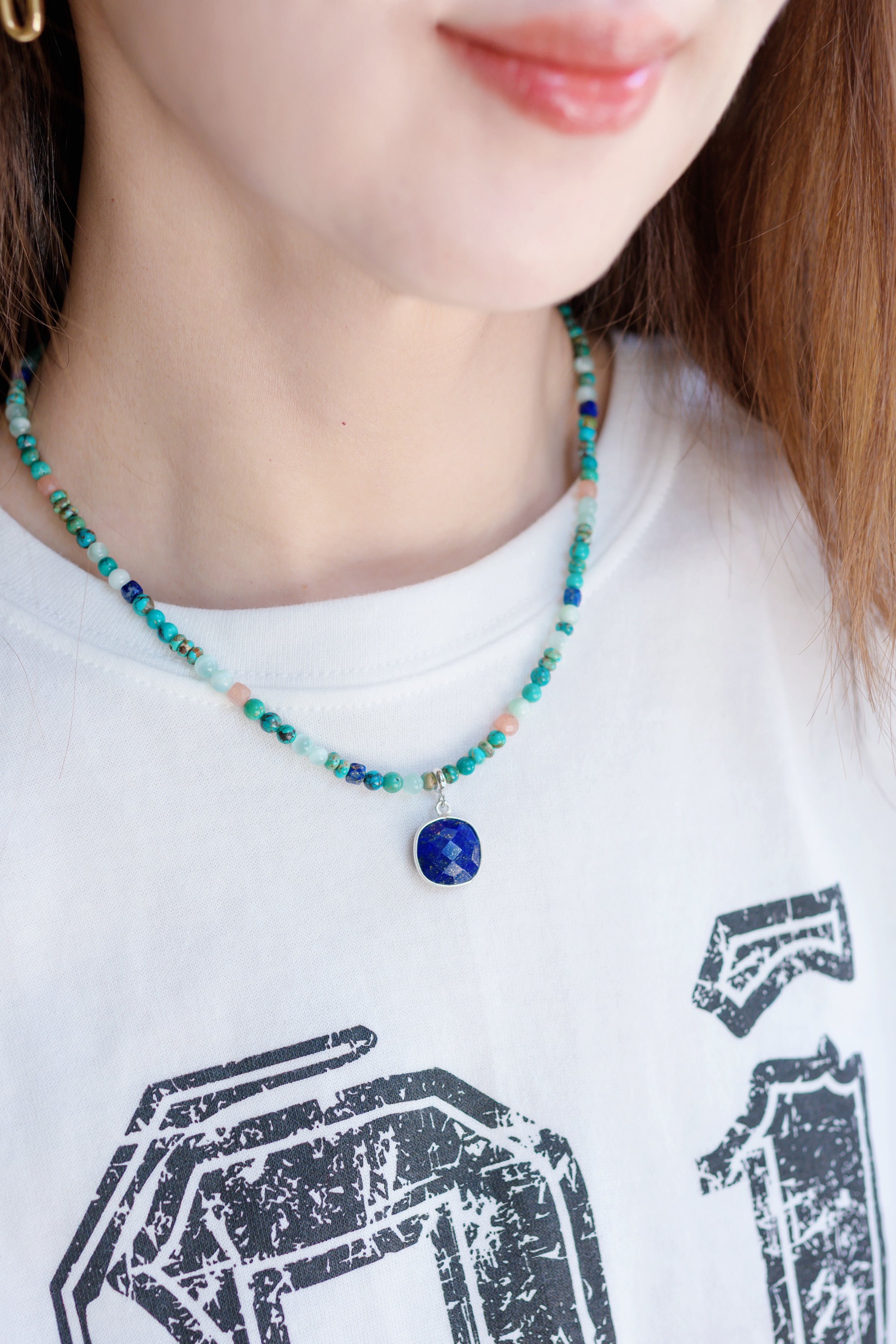 Turquoise Tranquility Necklace with Lapis Square Pendant | Hubei Turquoise (A) Russian Green Angelite Peach Moonstone (A)