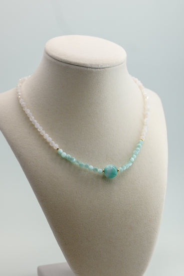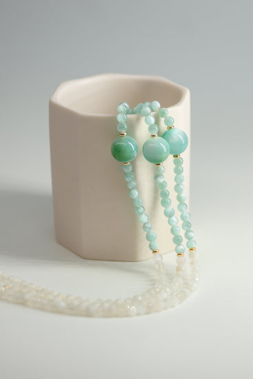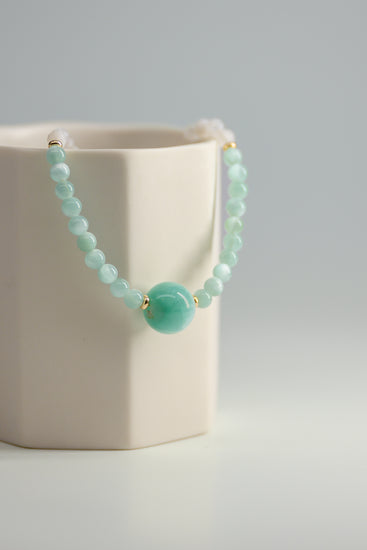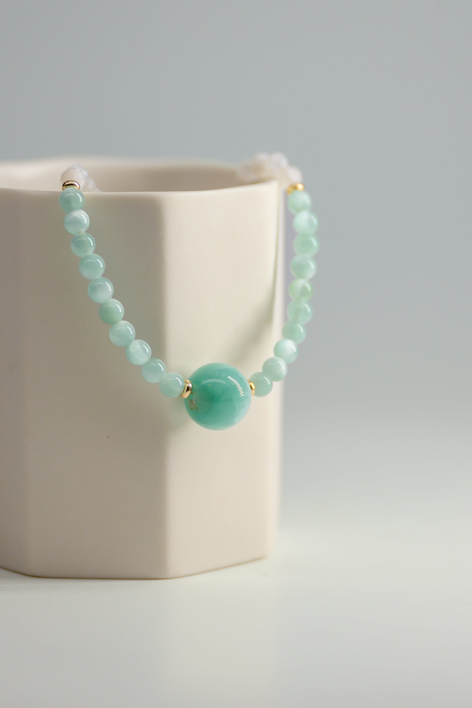 At the heart of this necklace lies a large bead of Russian Green Angelite, its soothing green hues embodying tranquility and spiritual connection, reminiscent of a serene twilight landscape. Flanking this central gem are delicate Rainbow Moonstones, which shimmer with a spectral light that mirrors the moon’s own reflections, known for their ability to enhance intuition and emotional balance.