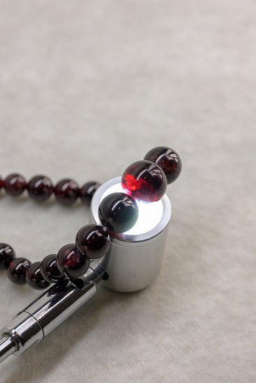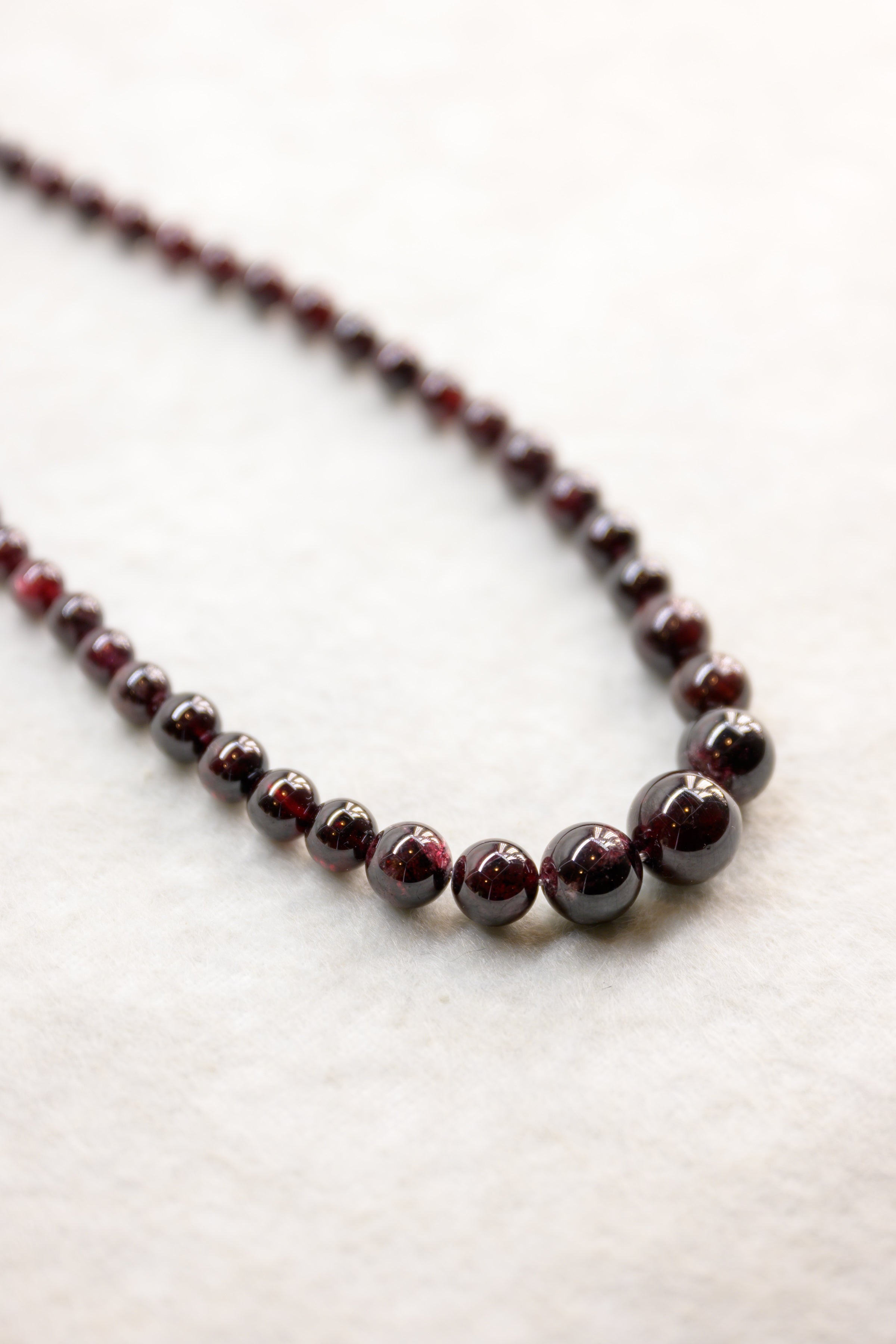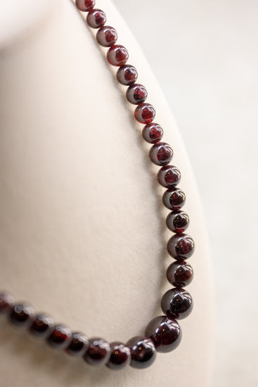 Graduated garnet beads create a gentle rhythm around the neck, enhancing the necklace’s sense of flow and presence. The deep red tones feel both bold and intimate, radiating an aura that is elegant yet deeply personal.